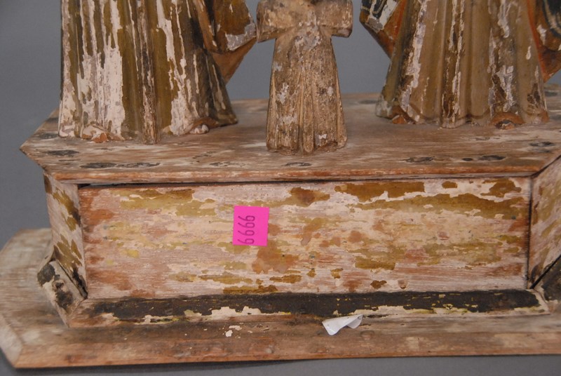 Lot 408: Triple polychromed religious figures on wood base. ht. 14in. wd. 14in.