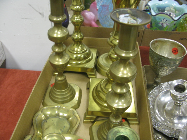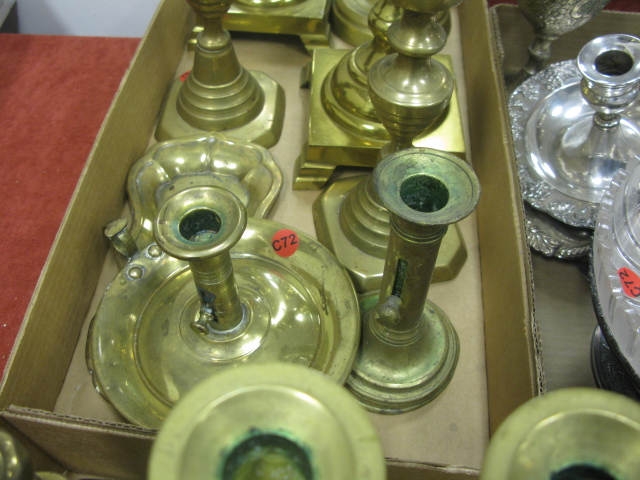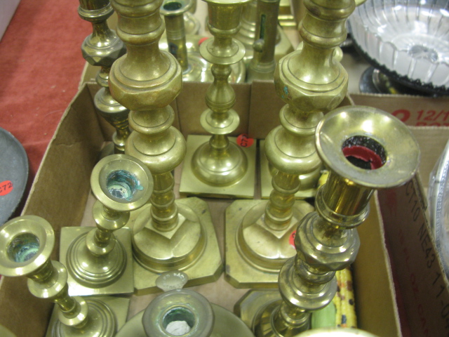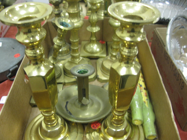 Two box lots of brass candlesticks including pairs of brass pushup candlesticks