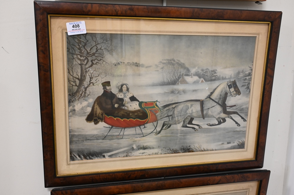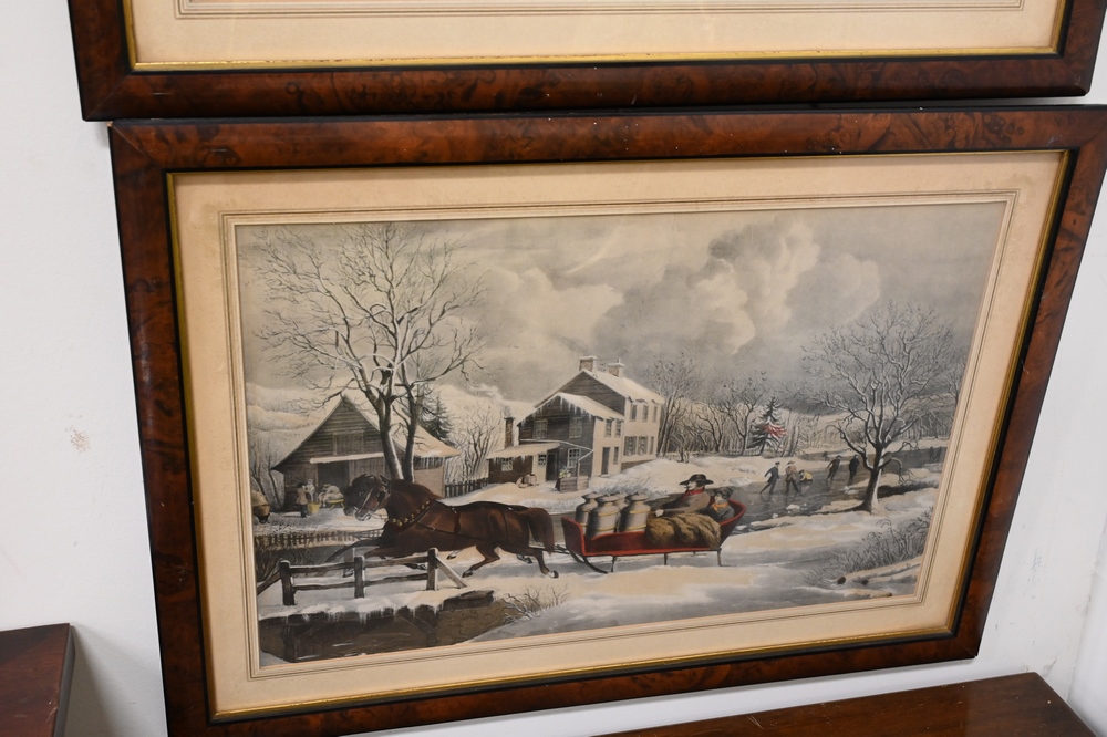 Lot 408: Two Piece Lot After Currier & Ives, to include “Delivering Milk” and “The Winter Sleigh Ride” both offset lithographs in colors, both housed in matching frames, sight size 11 1/2 x 17 1/2 inches.