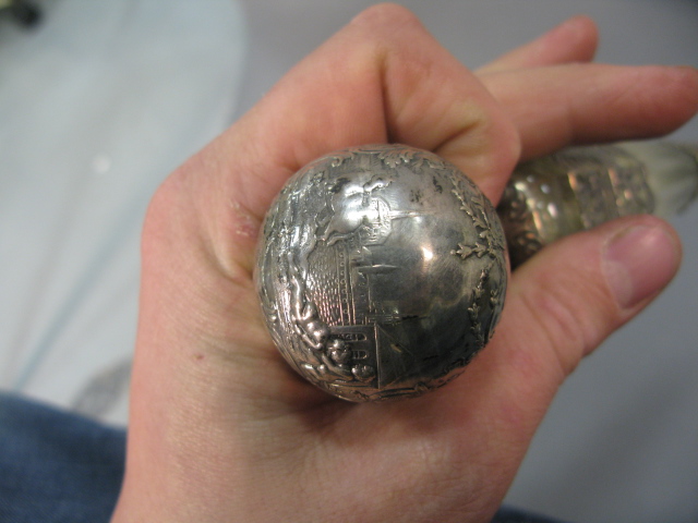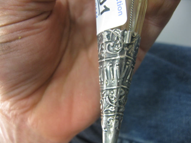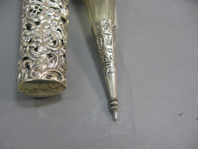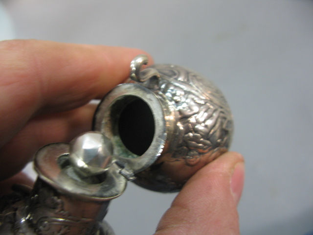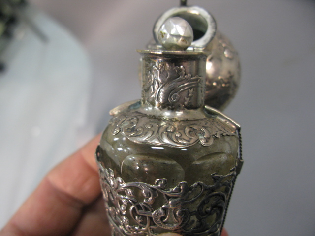 Two large scent bottles with silver overlay, one with silver top and one with top missing. Provenance: Governor Henry Roberts Edward Roberts 1110 Prospect Ave Hartford to present owner.