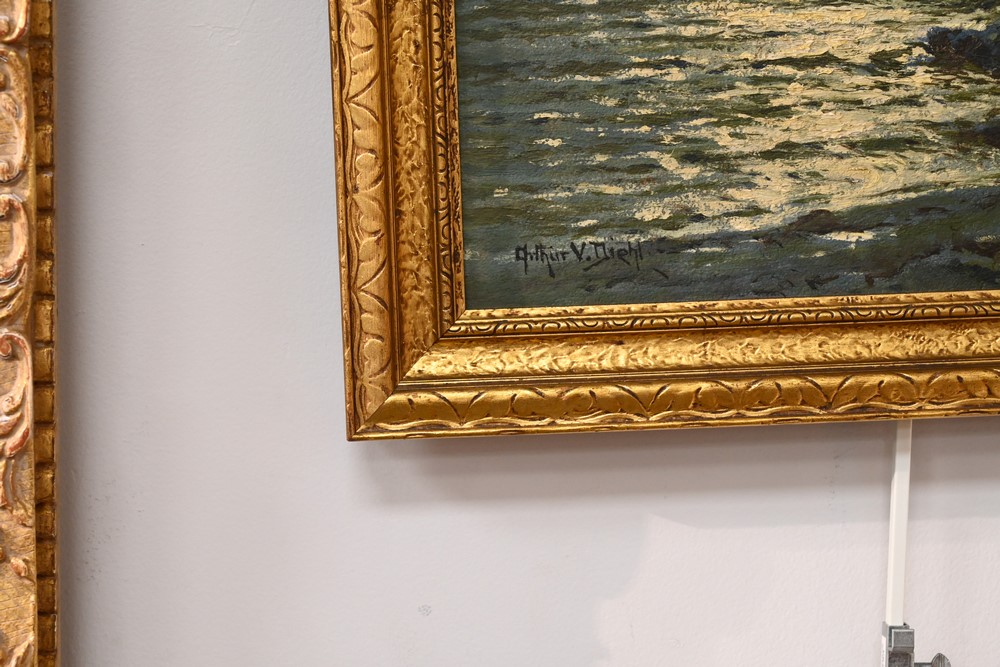 Lot 409: Arthur Vidal Diehl American/British, 1870 – 1929 Midnight on the Shore oil on board signed lower left “Arthur V. Diehl” 11 1/4 x 16 inches Provenance: Fifty Year Personal Collection of Clocks and American Antiques from Thomas Bailey, Manchester, Connecticut.