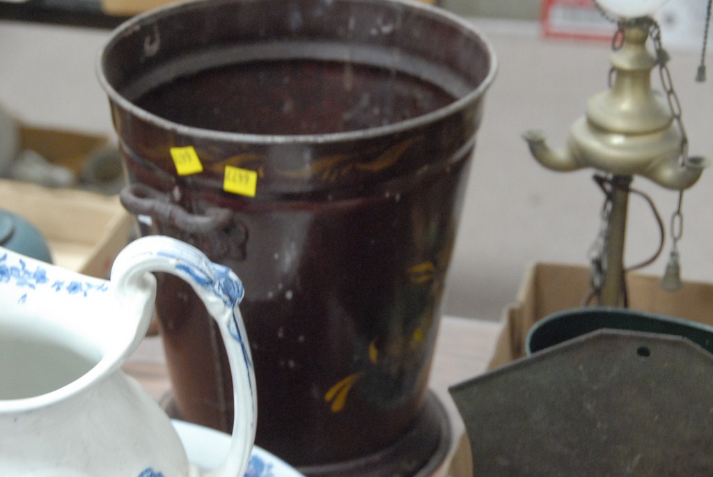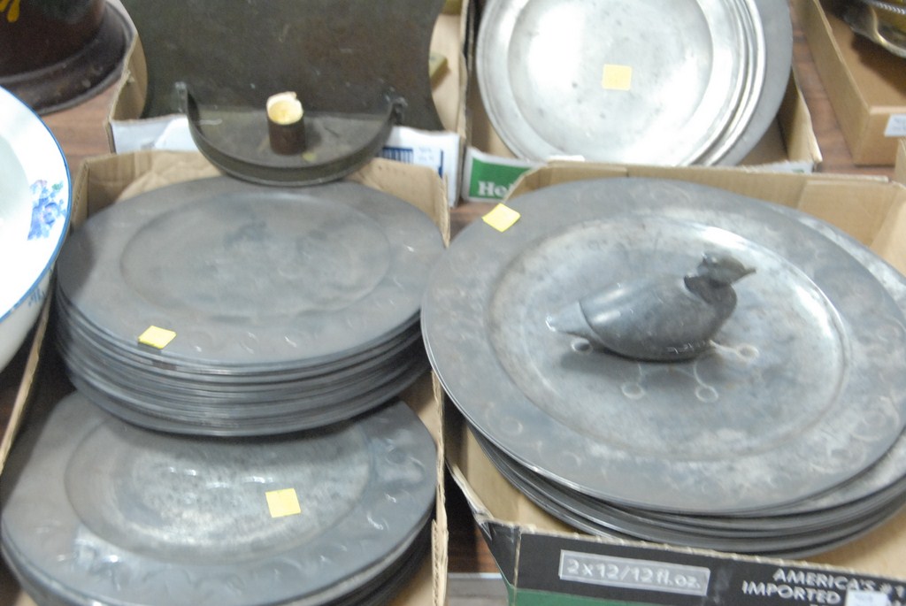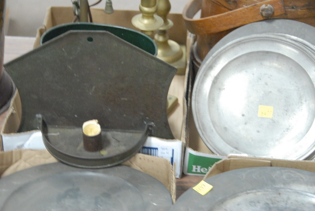 Four box lots tin plates, pewter plates, brass, tole bucket, and pitcher and bowl set.