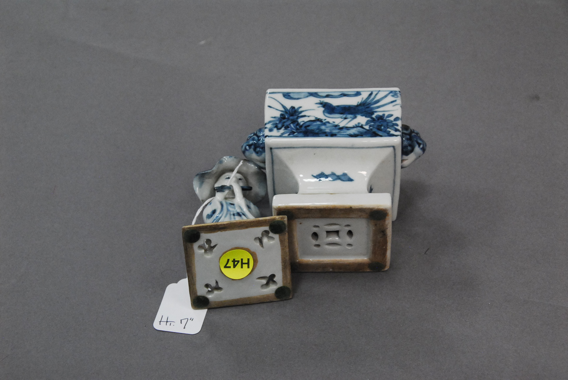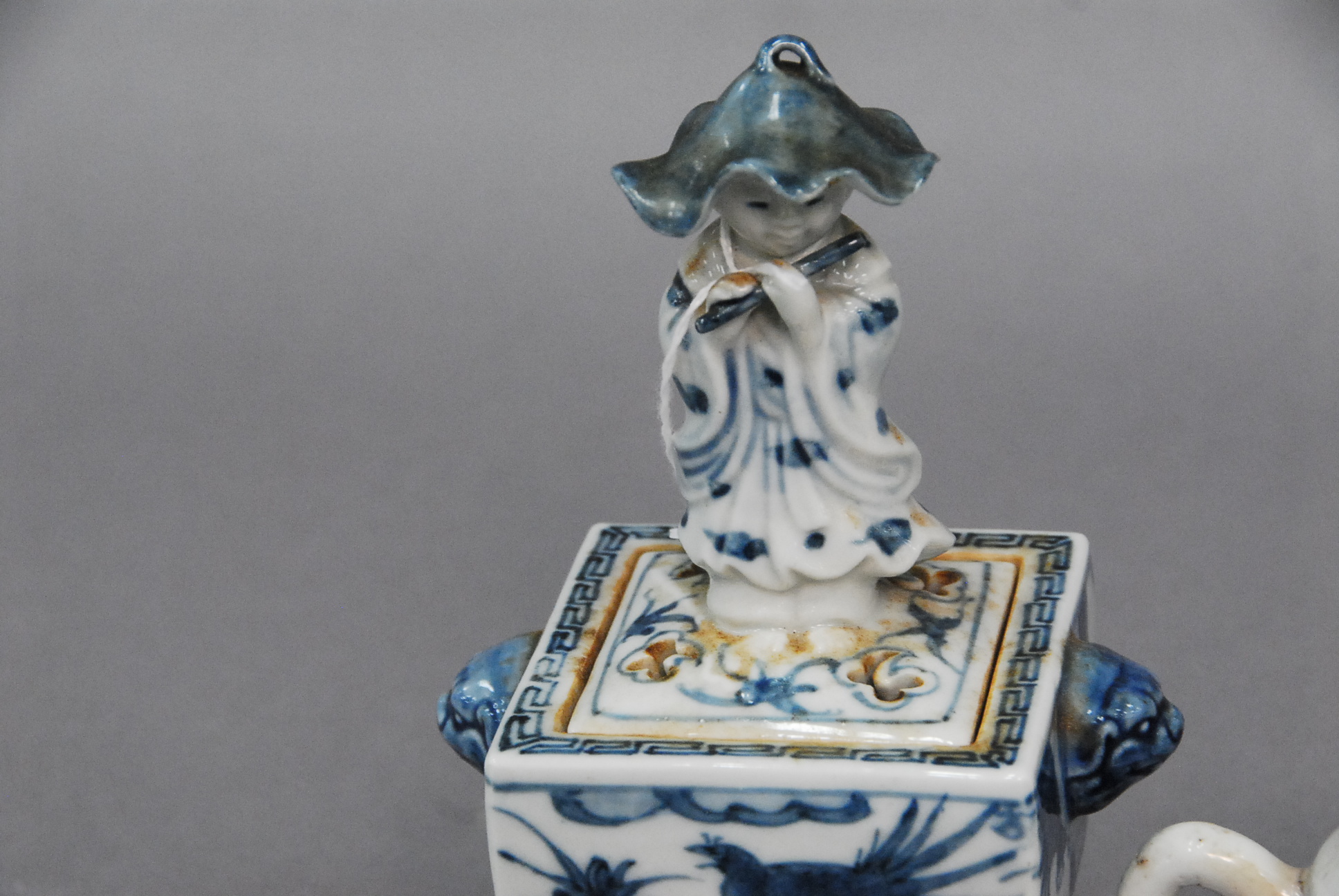 Group of four pieces of blue and white porcelain, incense burner with top, small pitcher, cup and a footed incense burner with a figure on top, incense with figure: 7.