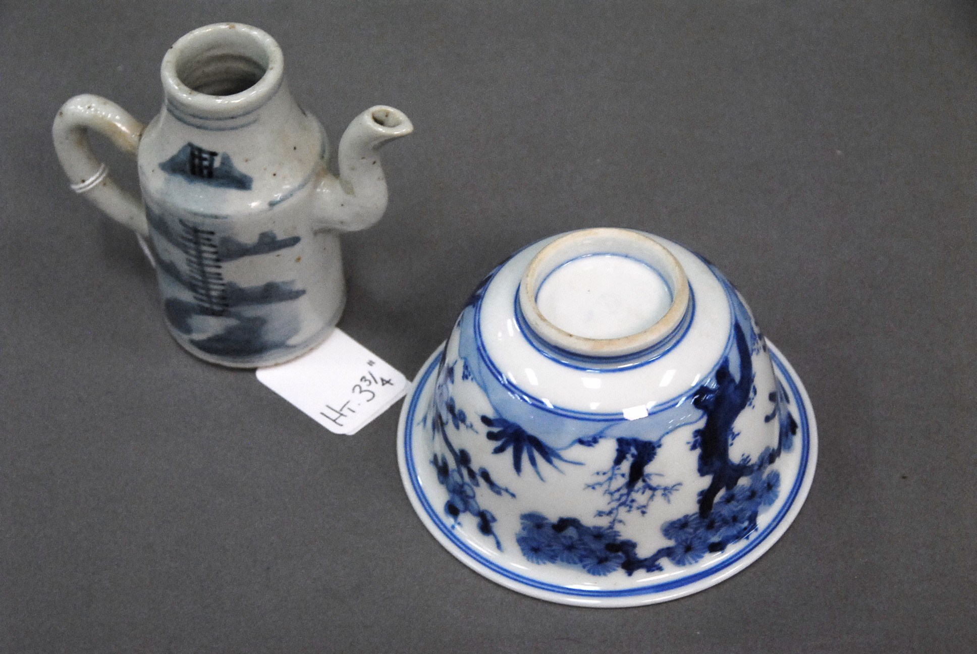 Lot 409: Group of four pieces of blue and white porcelain, incense burner with top, small pitcher, cup and a footed incense burner with a fig…