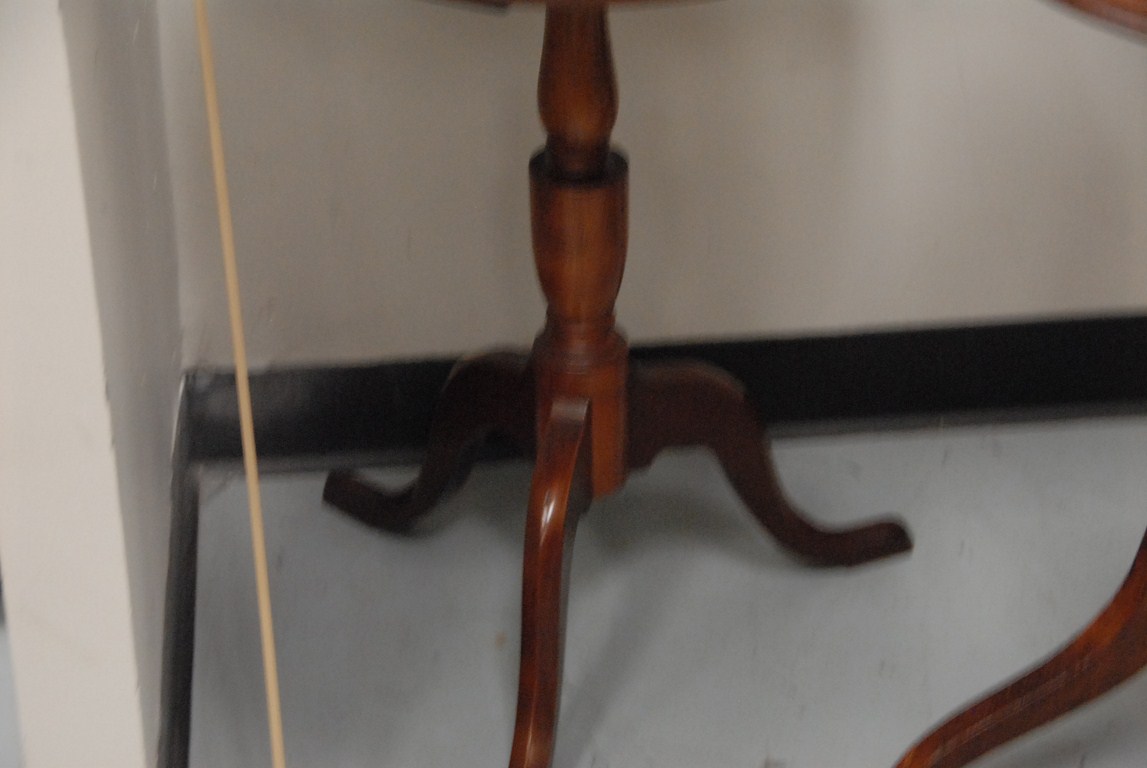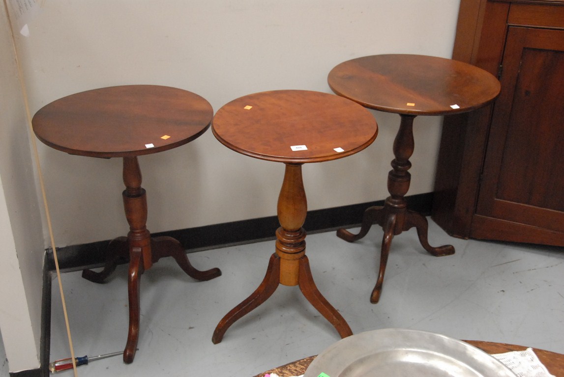 Lot 409: Group of three round top candlestands. ht. 26in. dia. 19 1/2in, ht. 27in. dia. 17 1/2in. ht. 27in. dia. 21in.