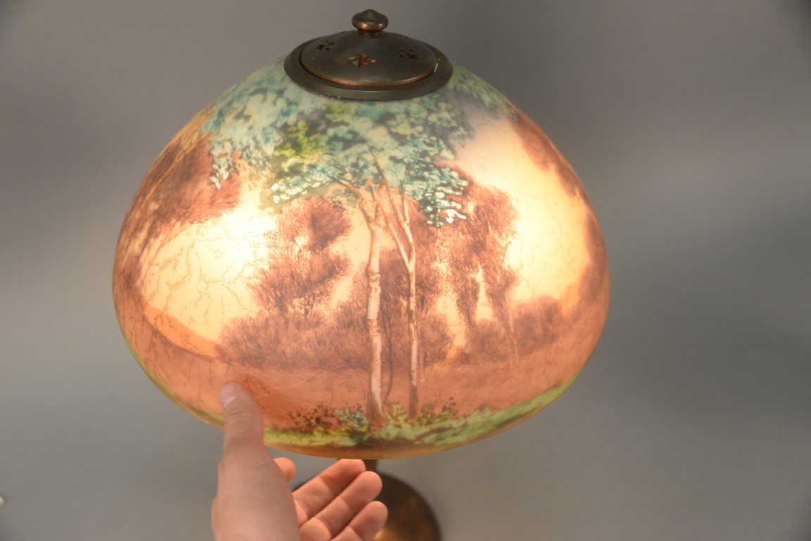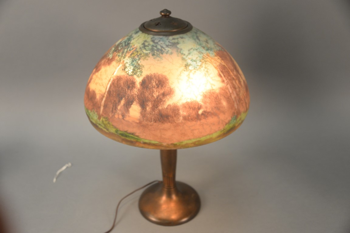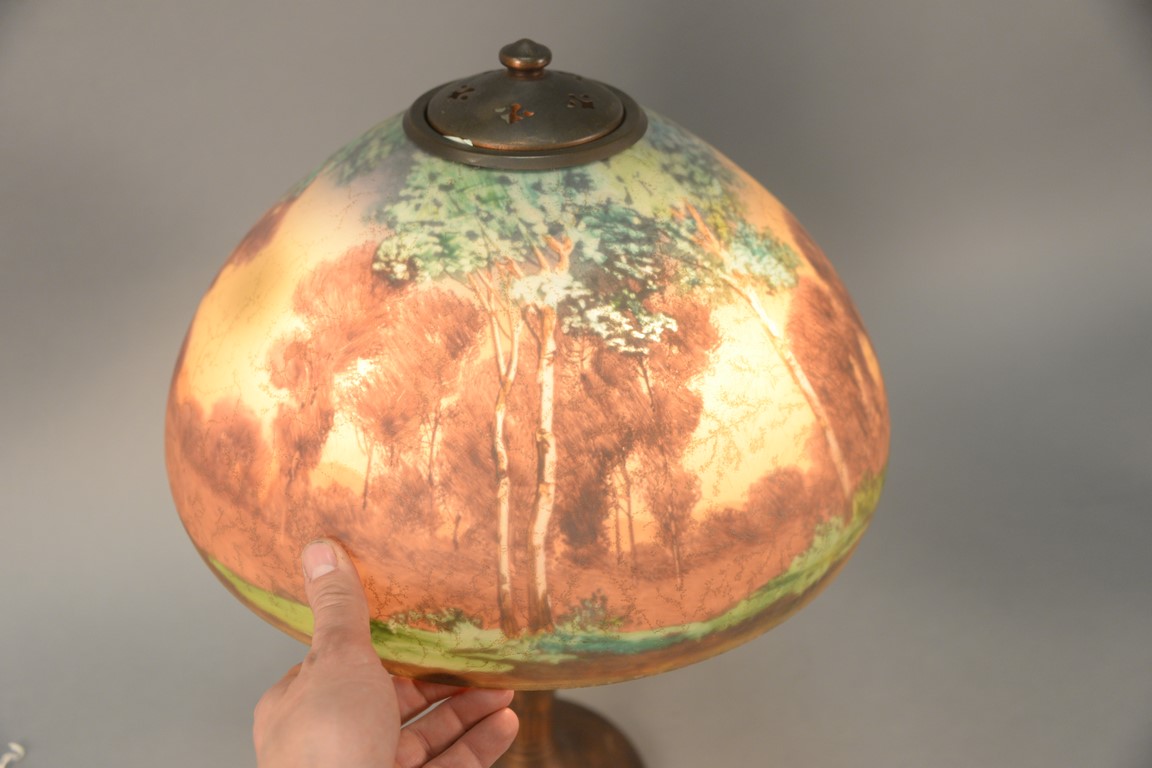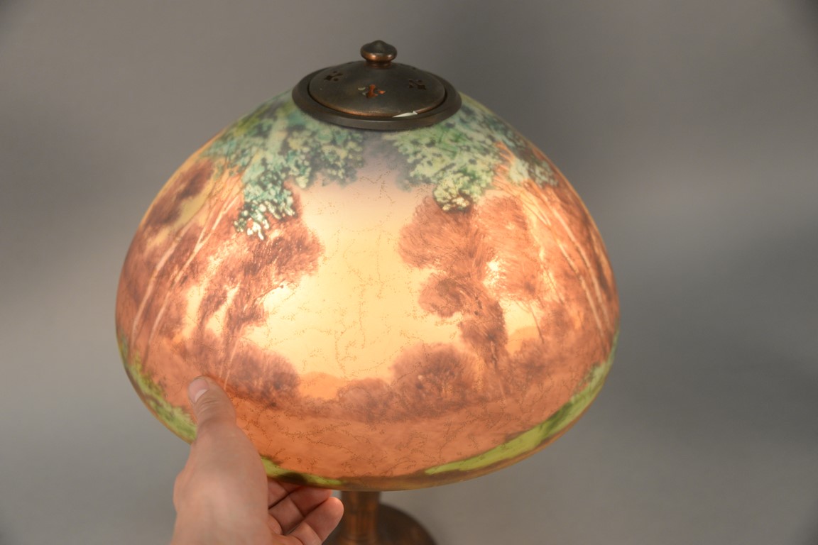 Lot 409: Handel reverse painted table lamp having reverse painted country landscape with trees on domed shade with chipped ice exterior on Ha…