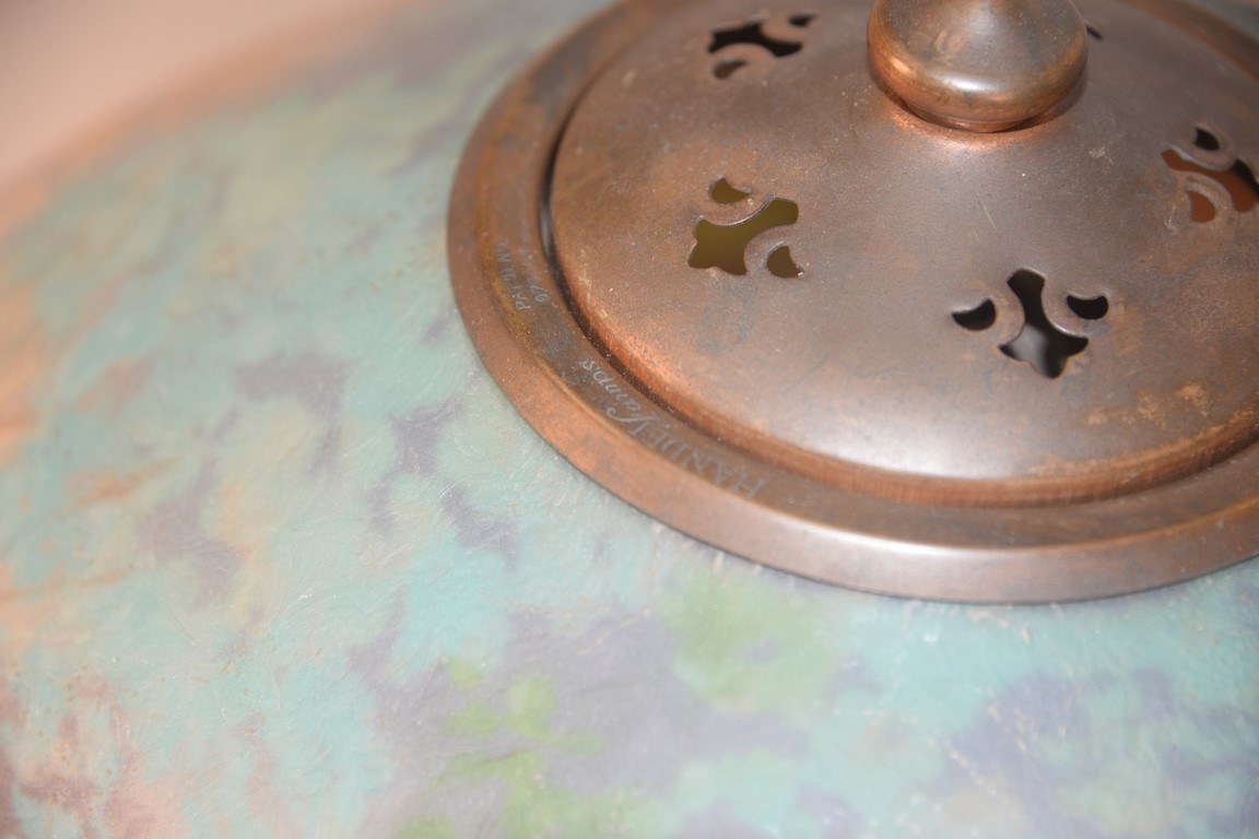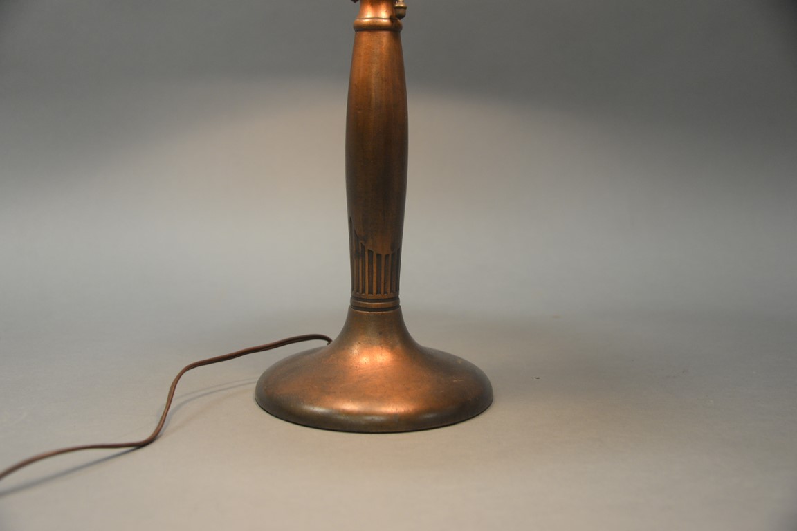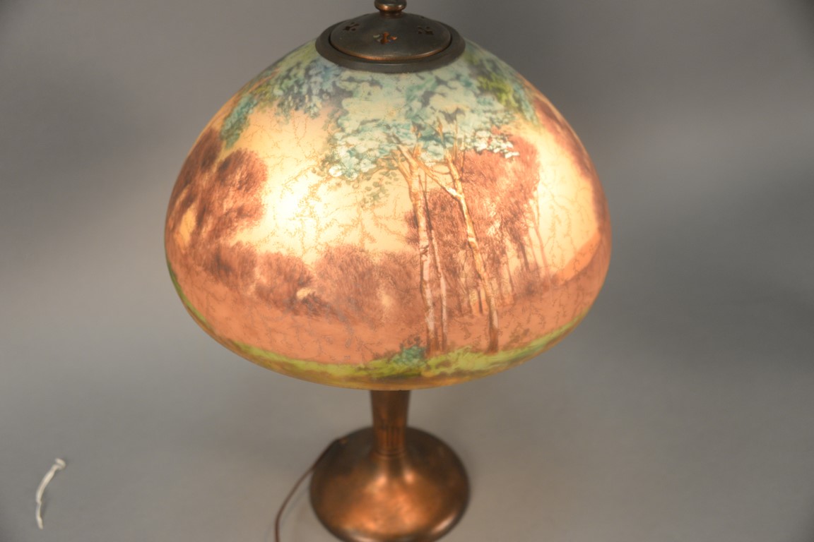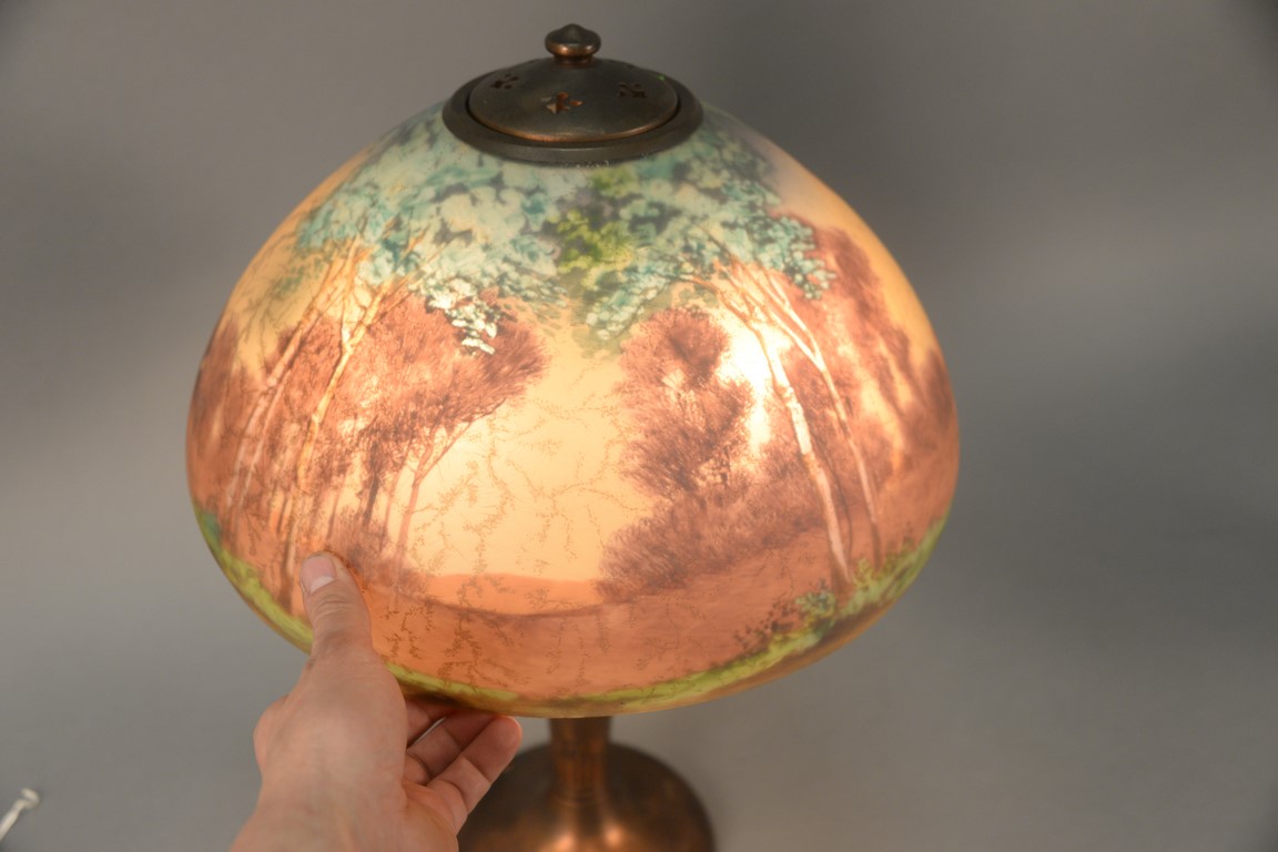 Lot 409: Handel reverse painted table lamp having reverse painted country landscape with trees on domed shade with chipped ice exterior on Ha…