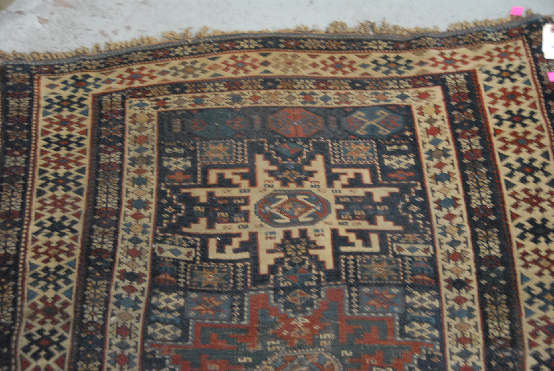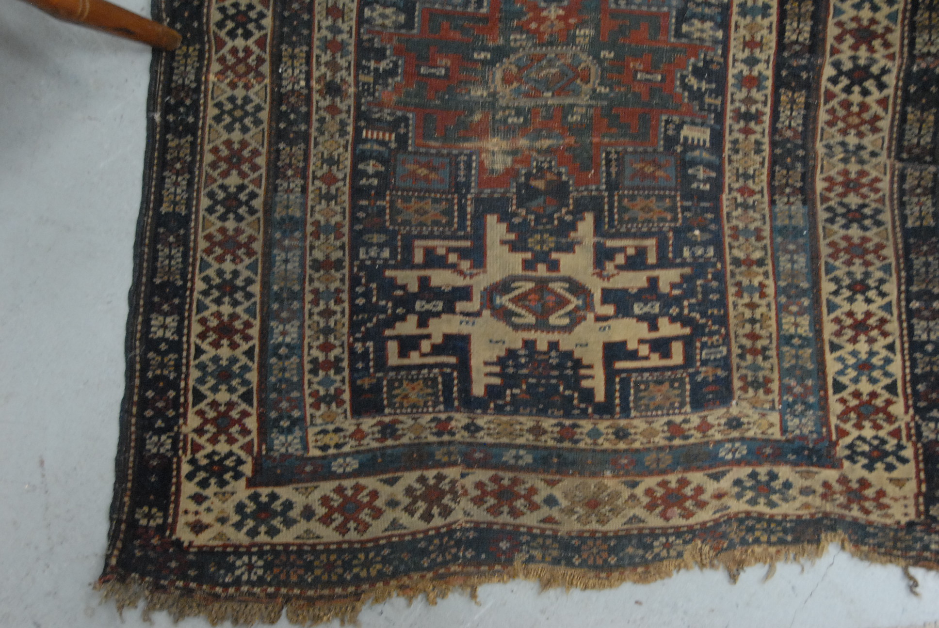 Lesghi Caucasian Oriental throw rug some wear. 3’4 x 4′ Provenance: Property from the Estate of Elizabeth and Edward Wallace of The Tracy House in Meriden, Connecticut.