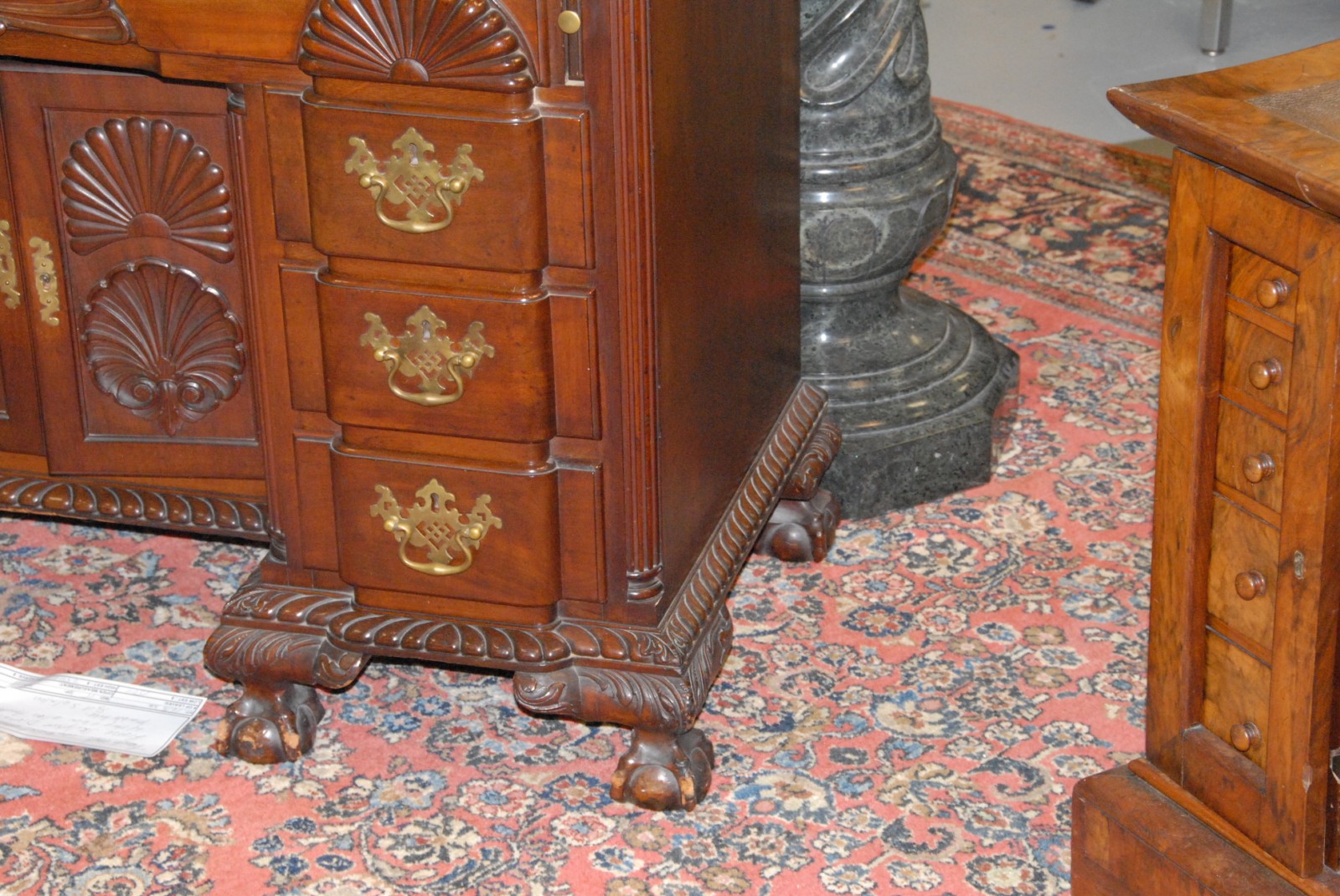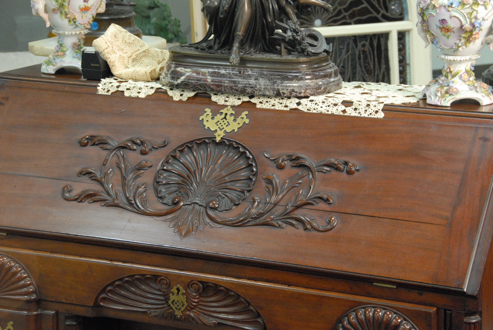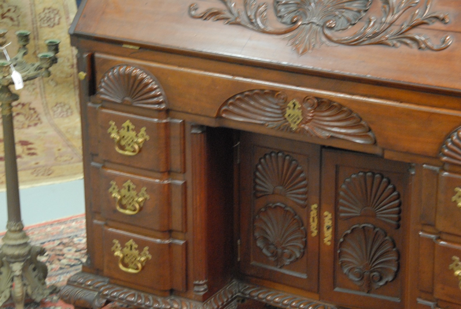 Mahogany Centennial slant front desk with shell carved lid, carved block front drawers and shell carved doors all set on ball and claw feet circa 1860.