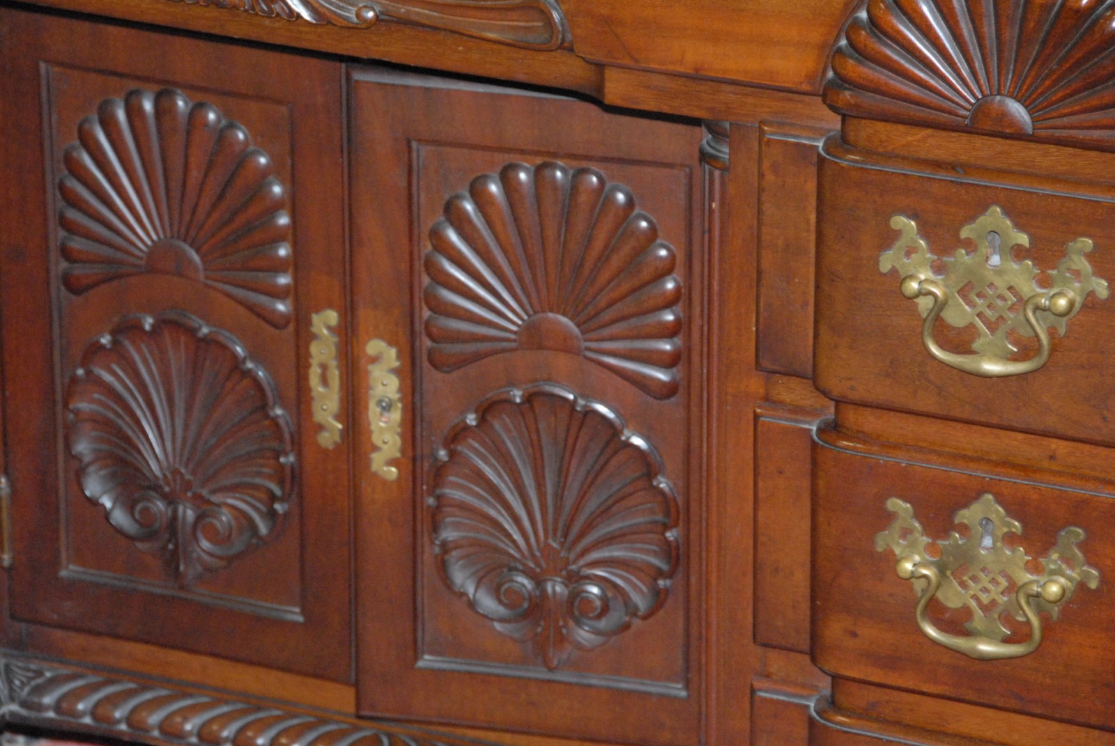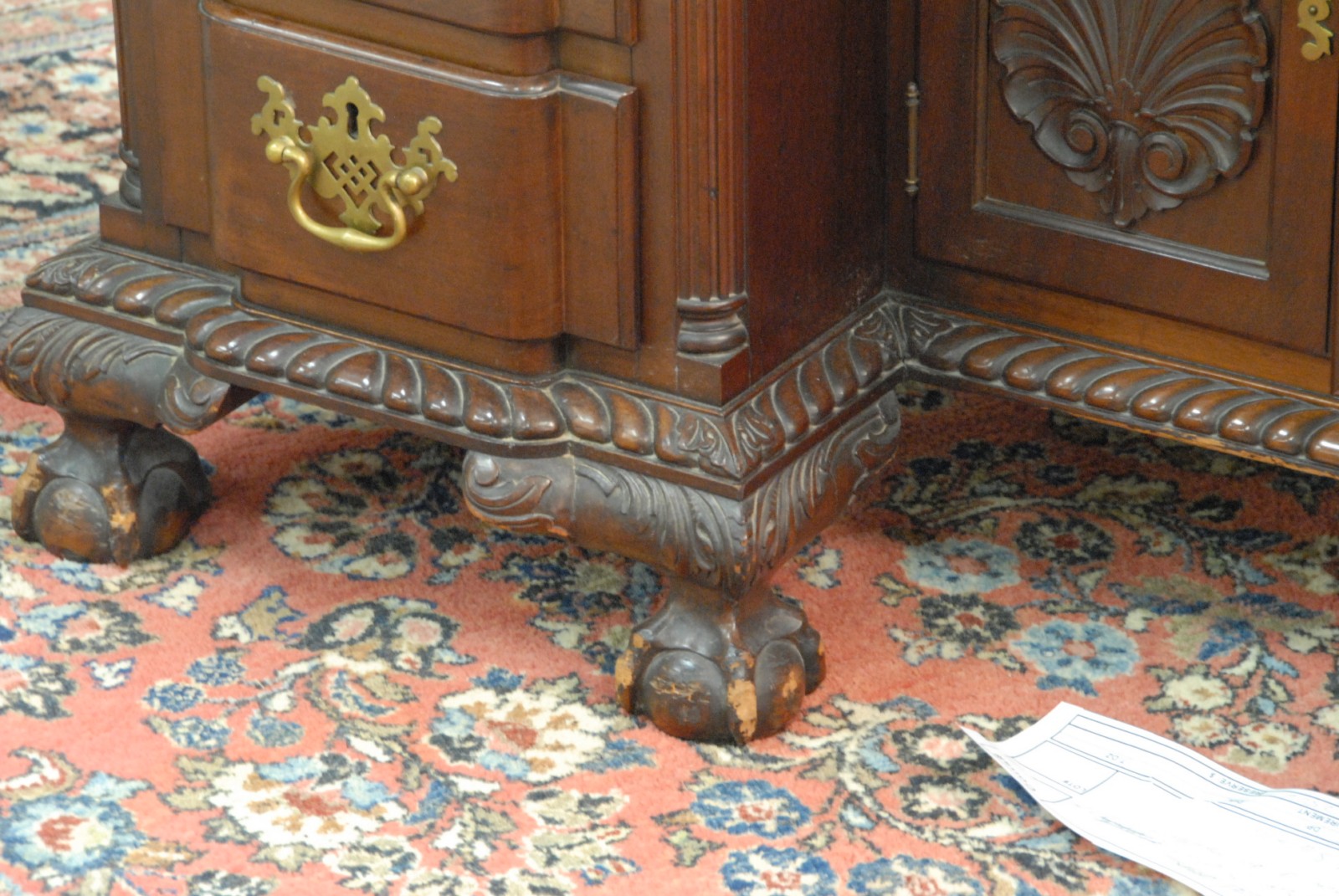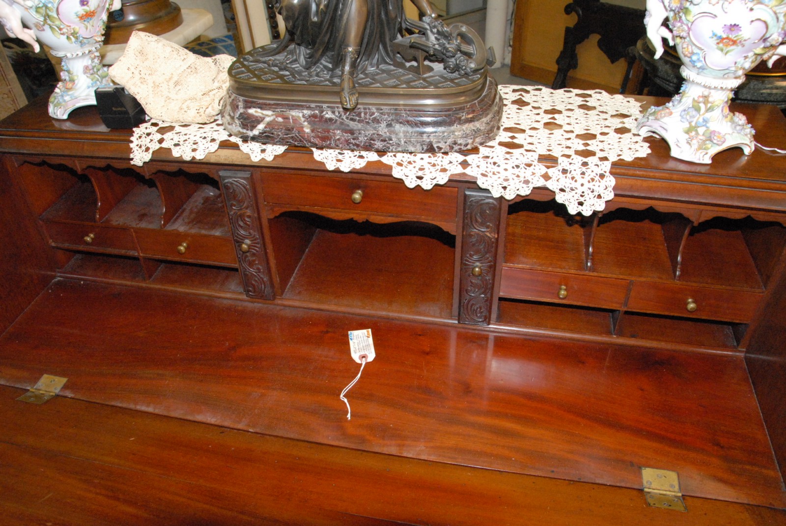 Mahogany Centennial slant front desk with shell carved lid, carved block front drawers and shell carved doors all set on ball and claw feet circa 1860.