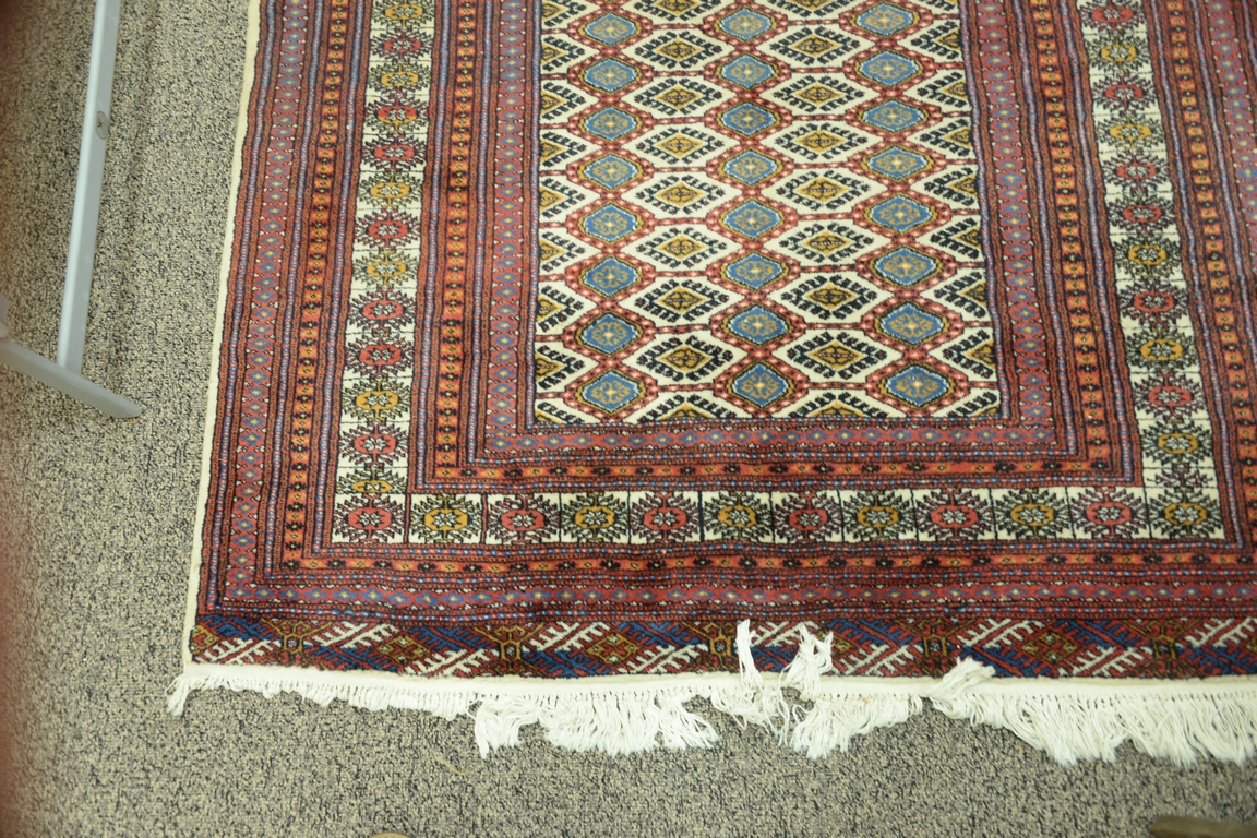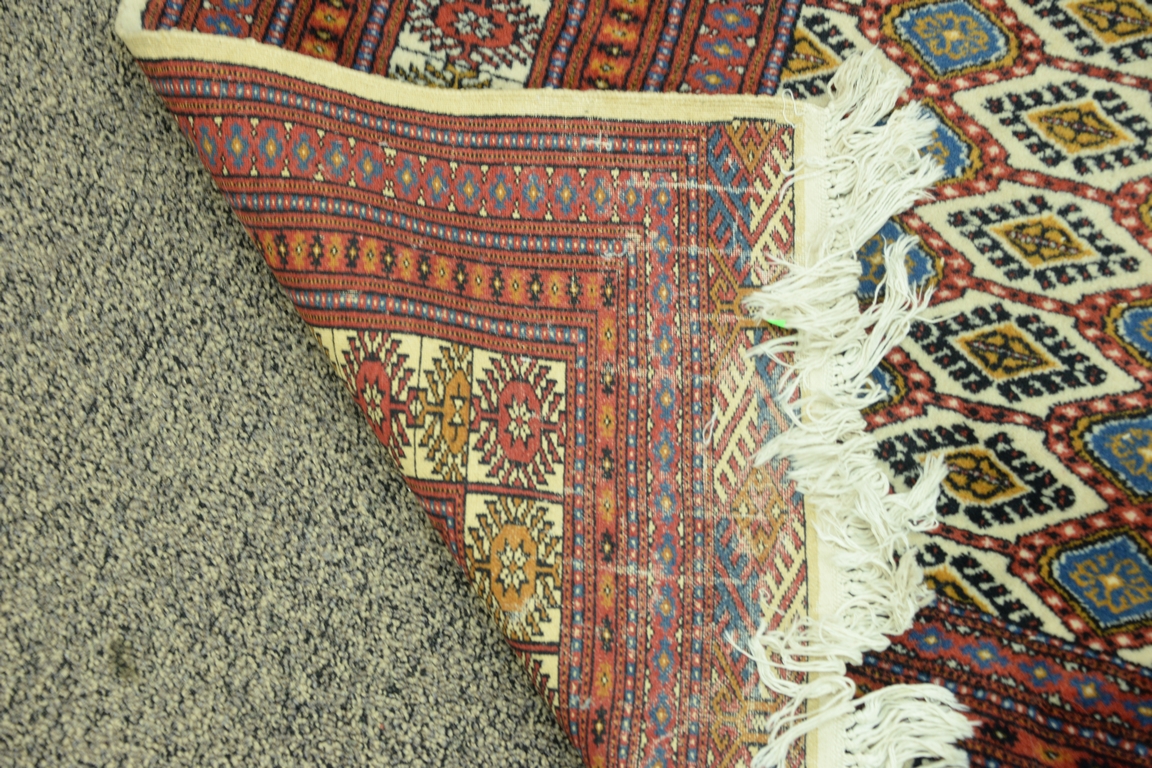 Oriental throw rug corner moth damage. 4’3 x 6′ Provenance: Collection of Anne Jones Willis and the late John Ralph Willis, New Jersey