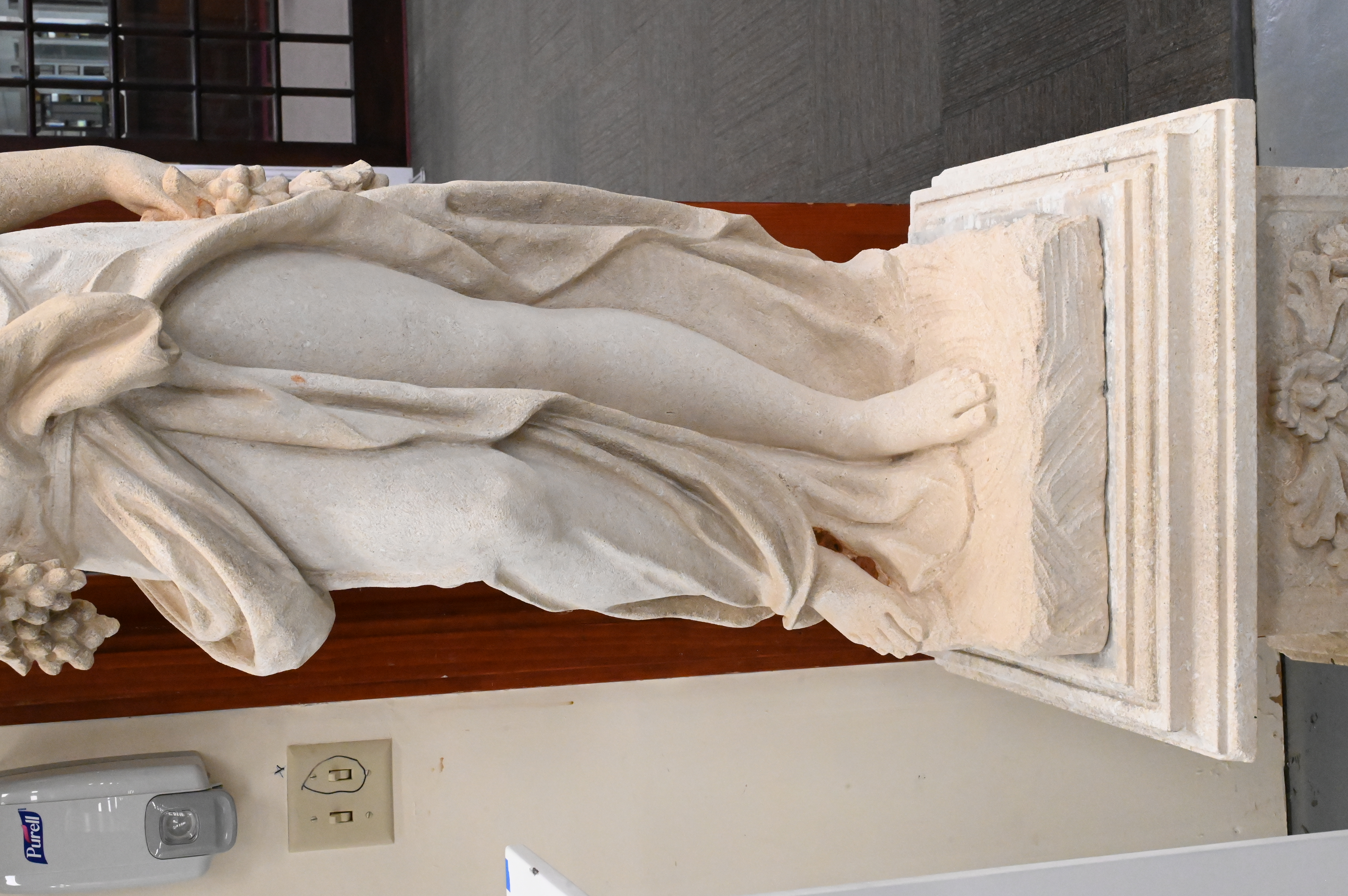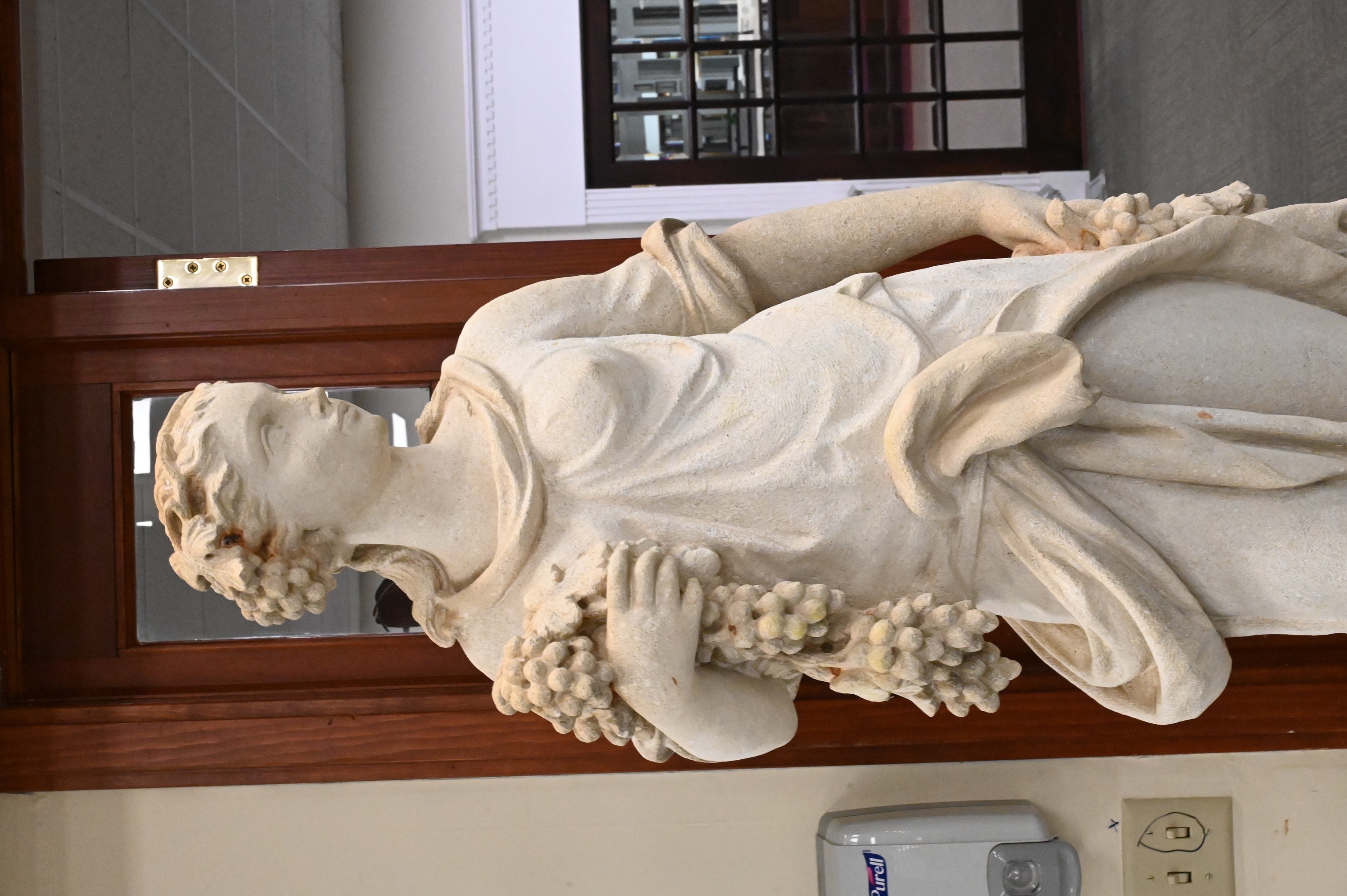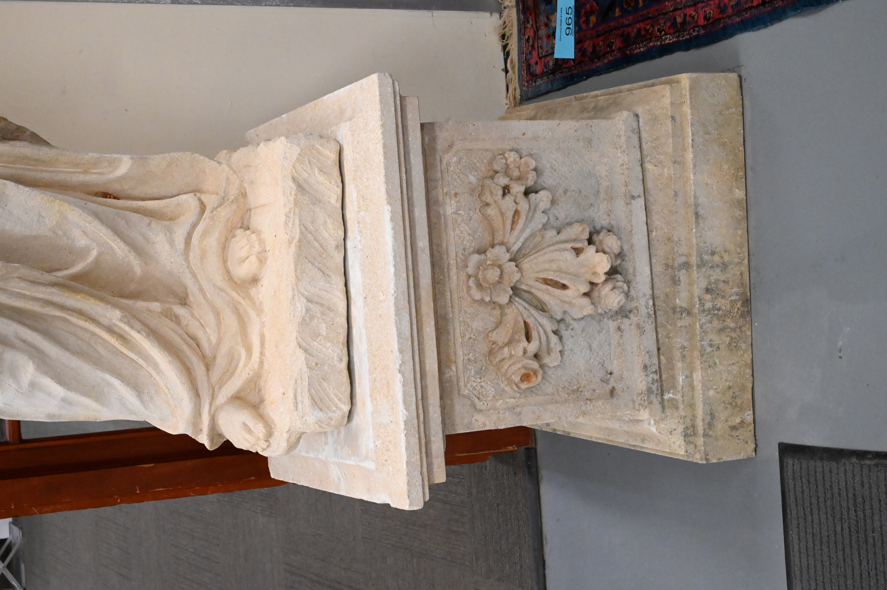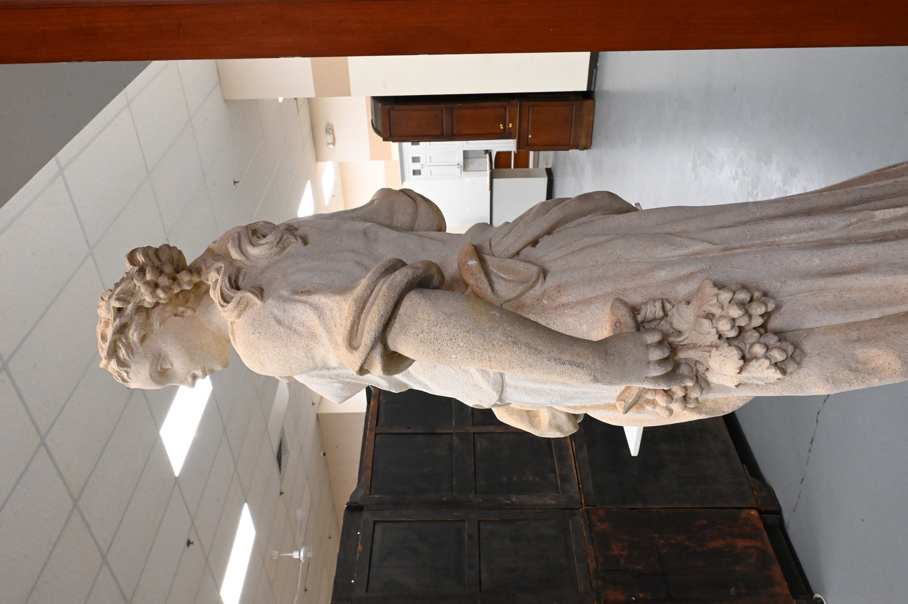 one depicting summer in a light dress holding her harvest of grapes, the other depicting winter in her thick fur coat as she holds a cluster of acorns, each mounted on pedestal base, carved sandstone