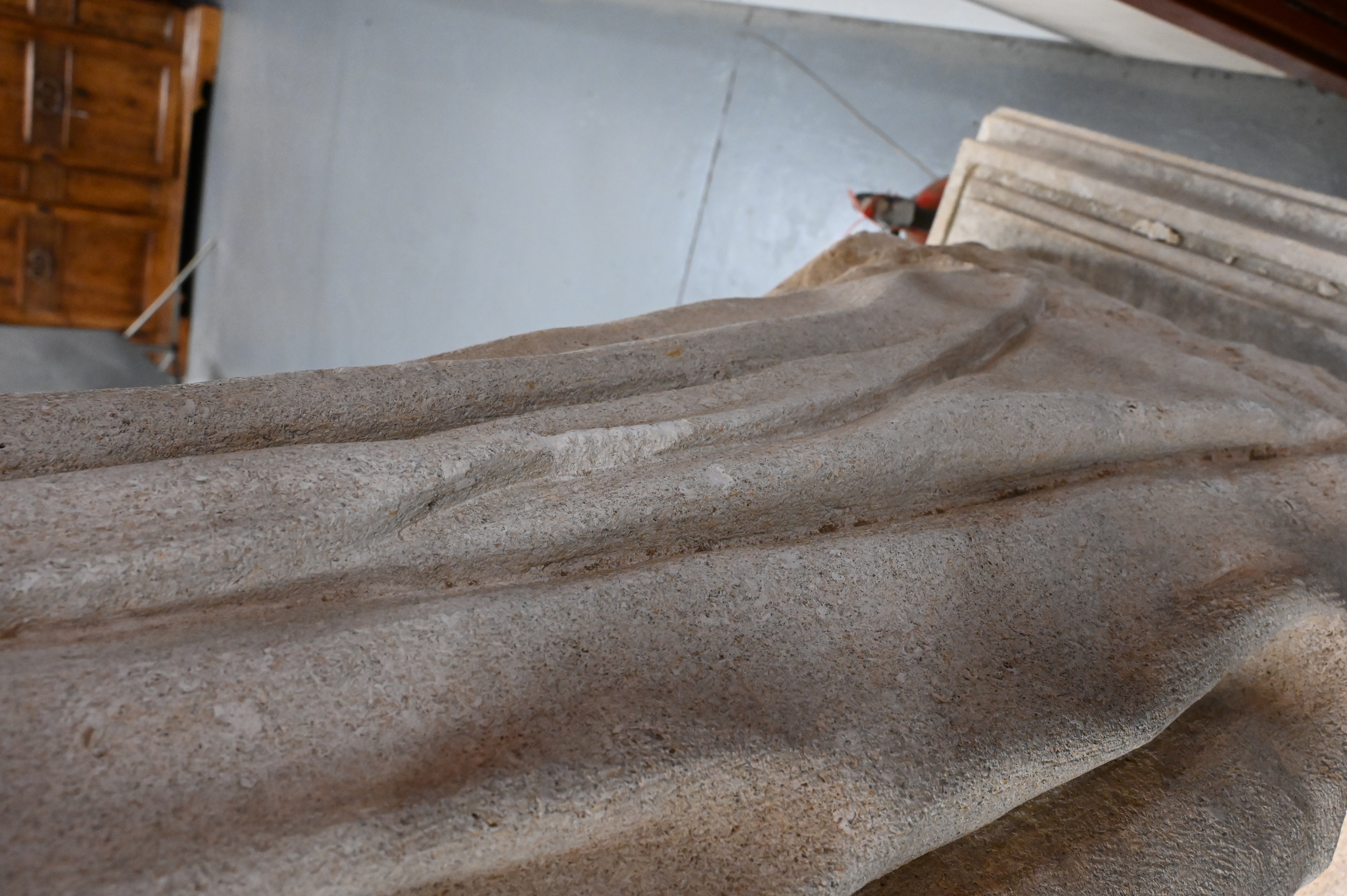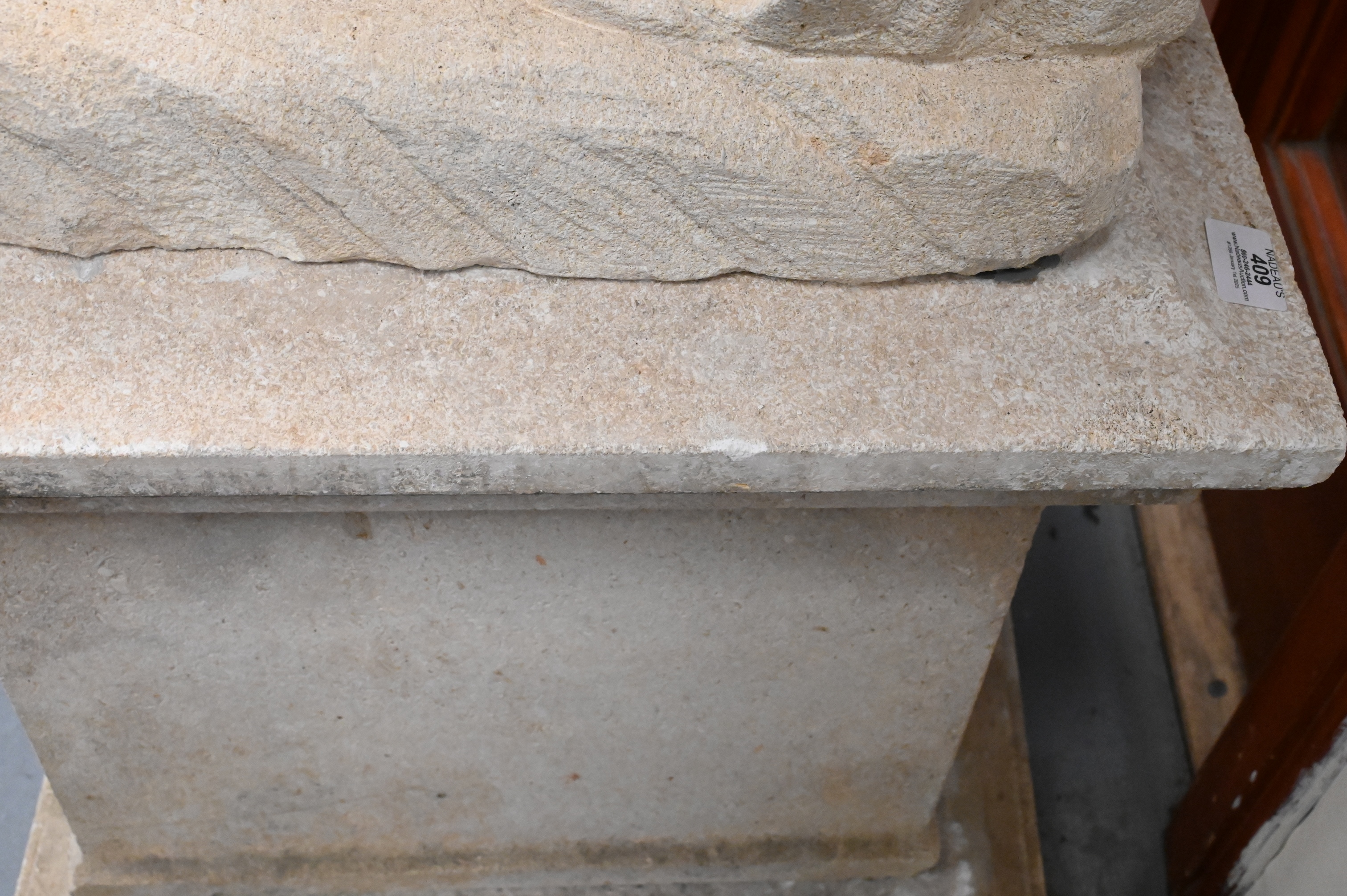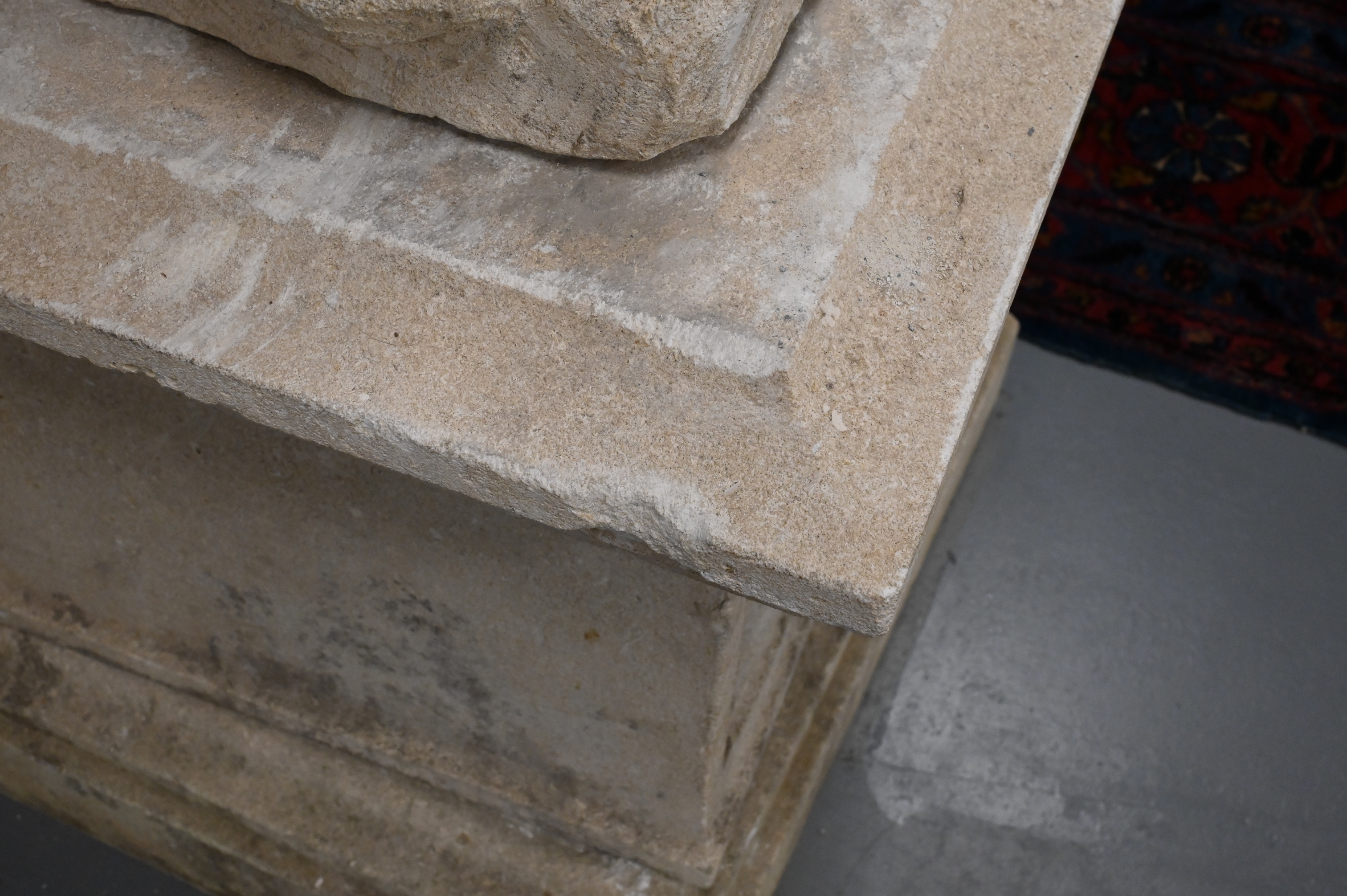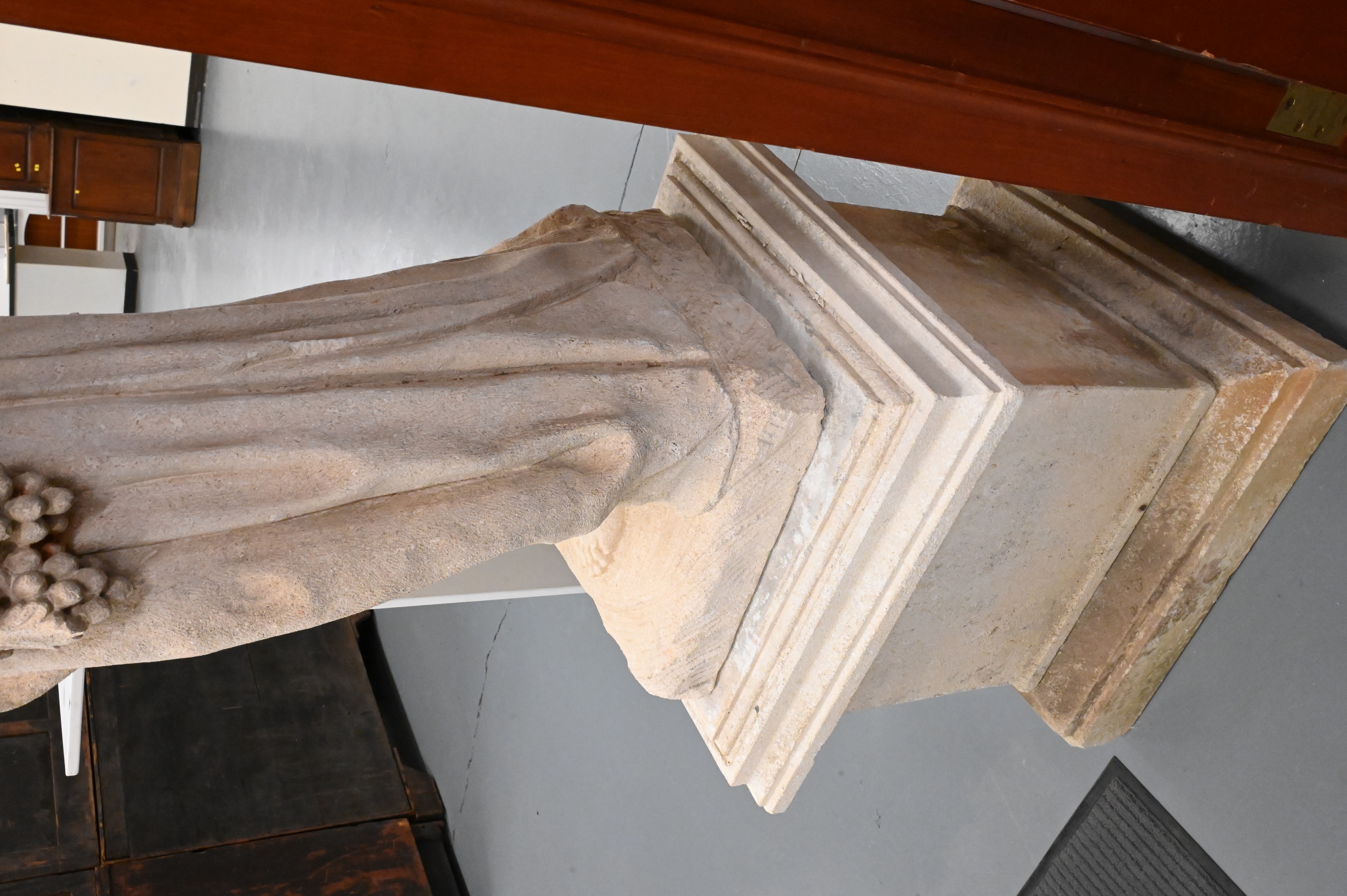 one depicting summer in a light dress holding her harvest of grapes, the other depicting winter in her thick fur coat as she holds a cluster of acorns, each mounted on pedestal base, carved sandstone