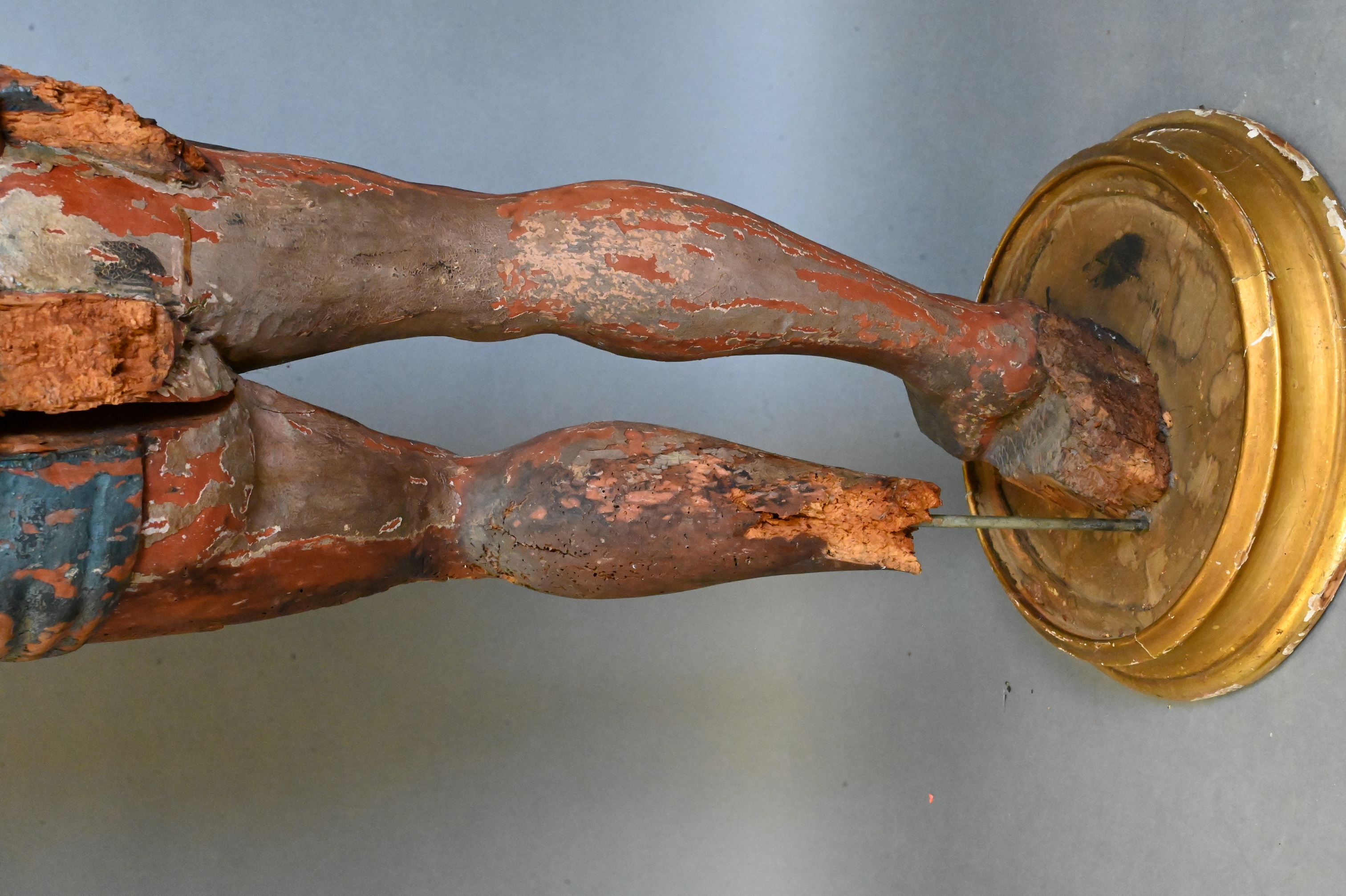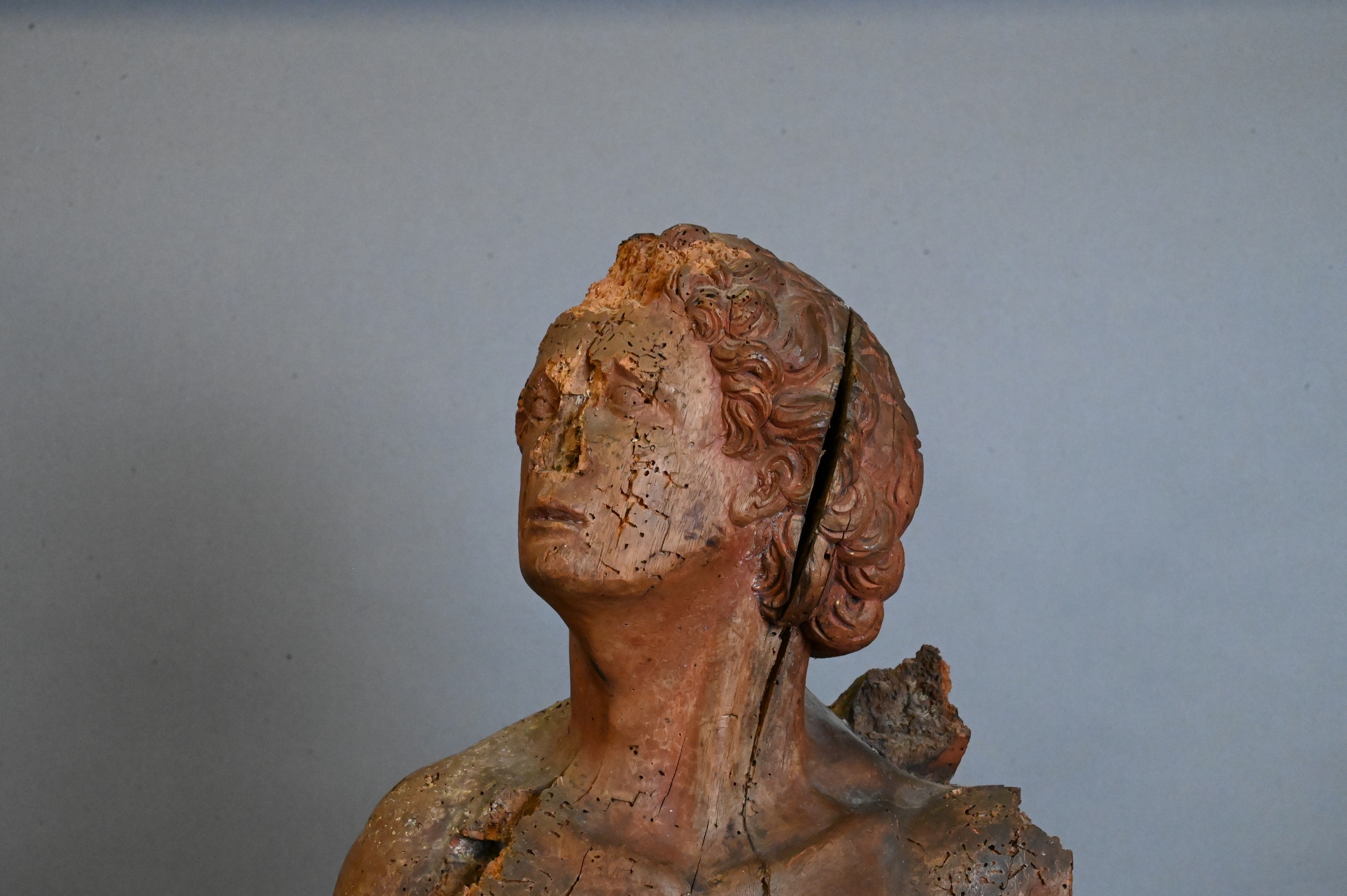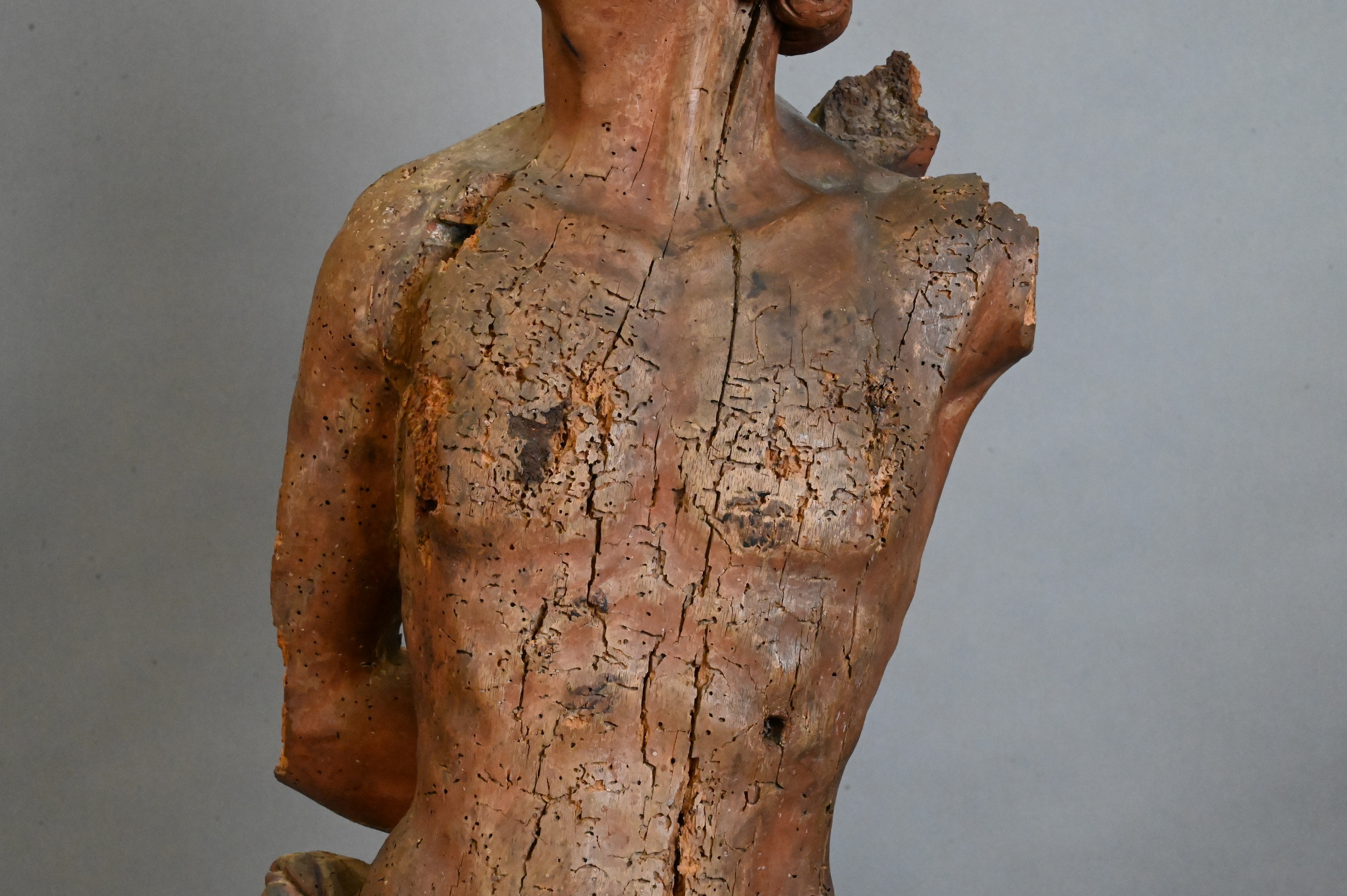 Carved limewood figure of Saint Sebastian, shown bound with hands behind his back, wearing a carved draped loincloth. The figure retains areas of original polychrome with later traces and extensive craquelure
