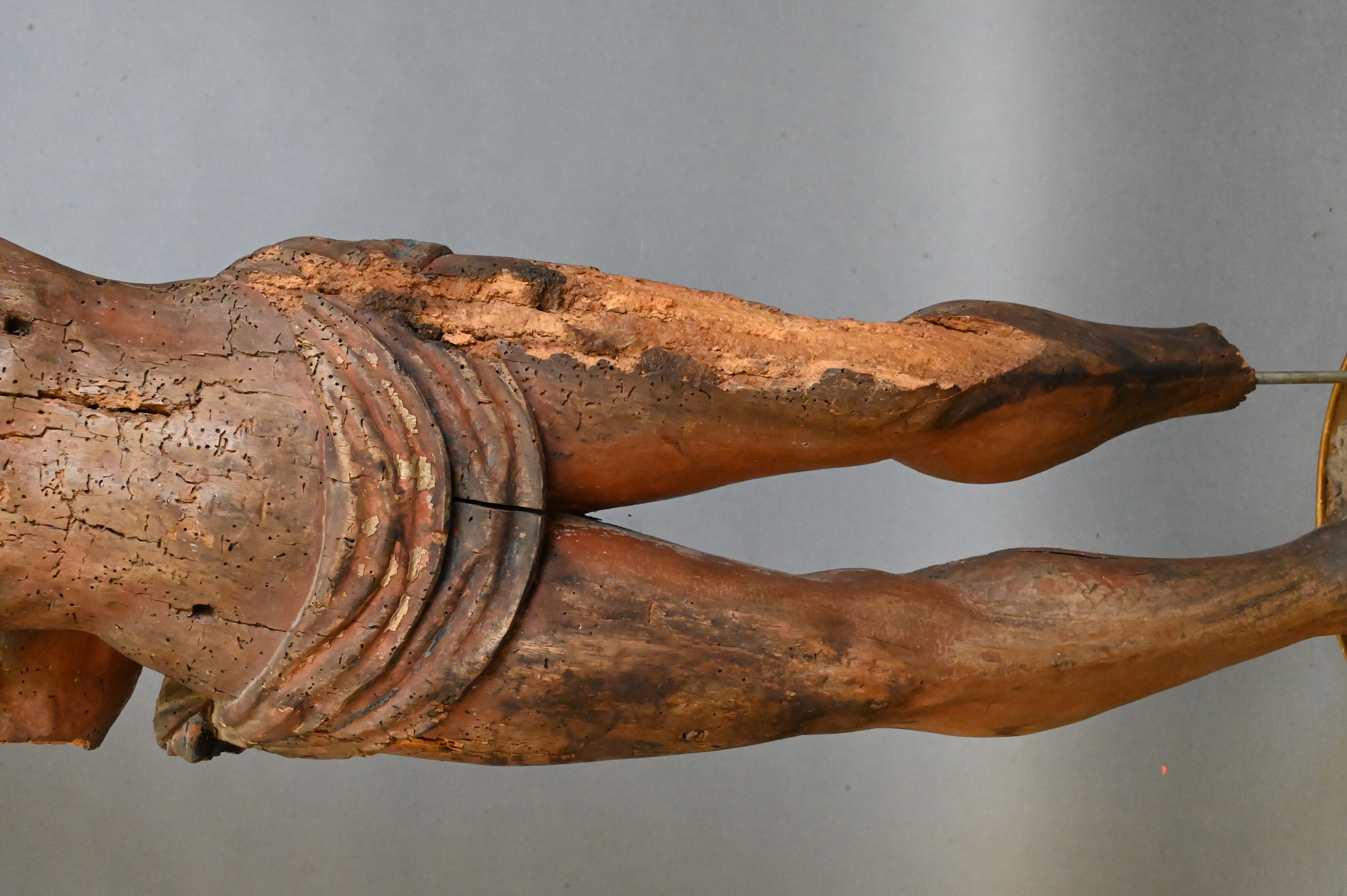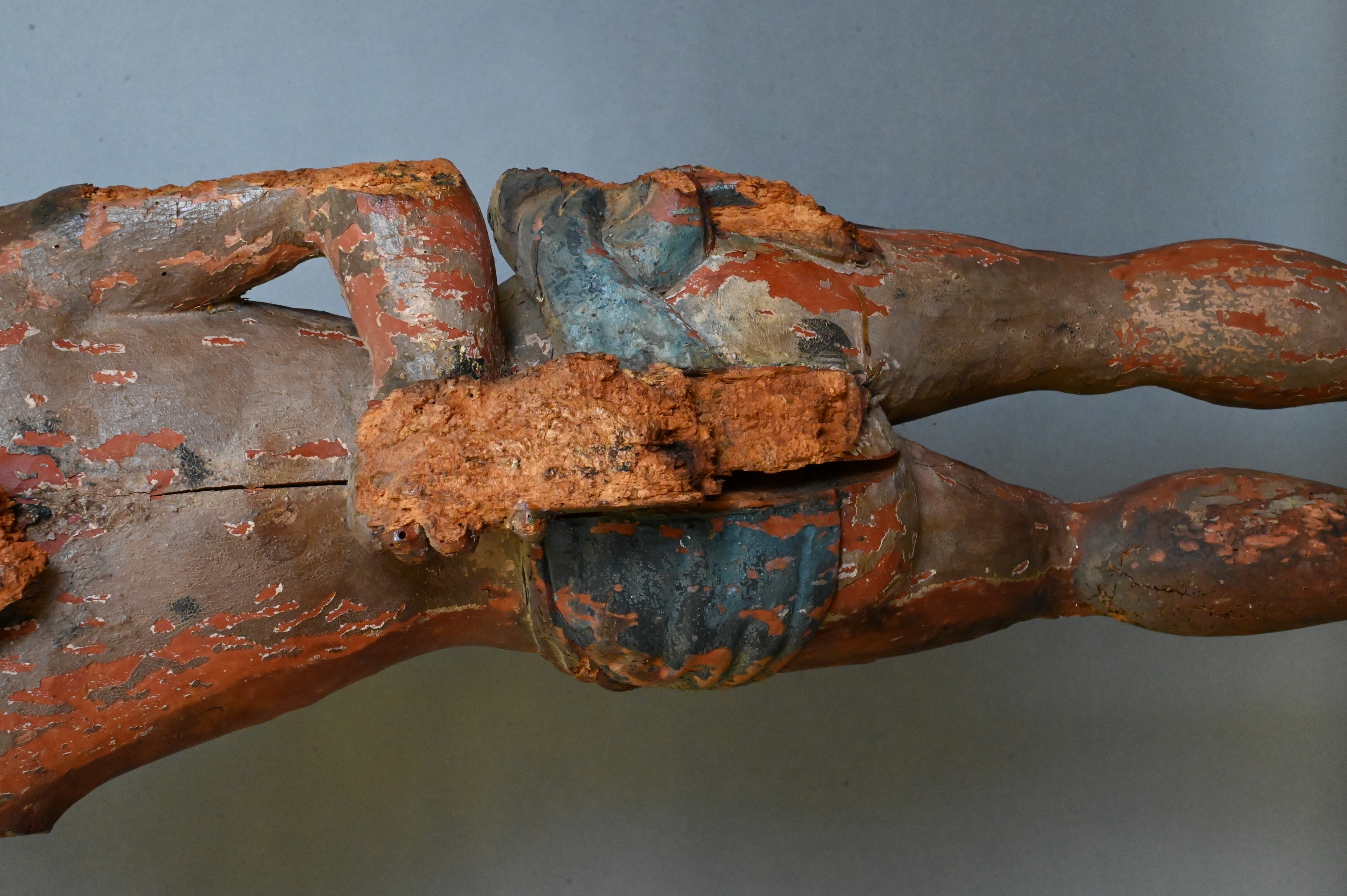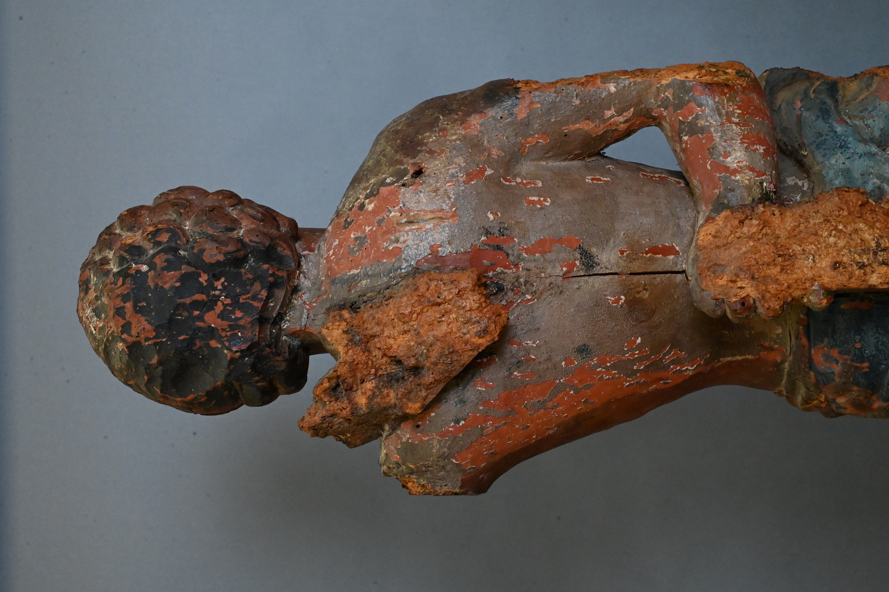 Carved limewood figure of Saint Sebastian, shown bound with hands behind his back, wearing a carved draped loincloth. The figure retains areas of original polychrome with later traces and extensive craquelure