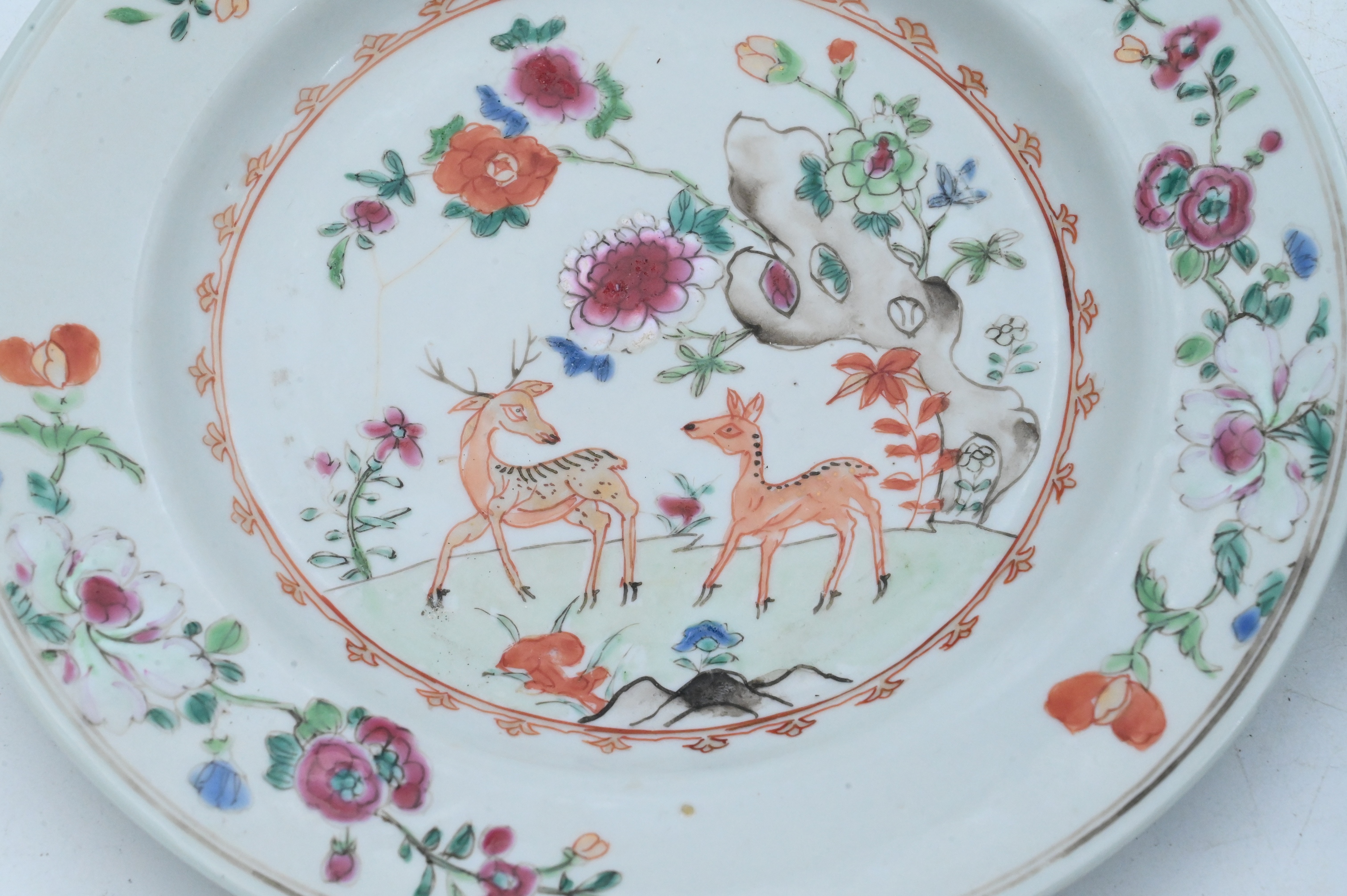 Each decorated with a central scene of two deer in a rocky landscape among flowering plants, within a border of scattered floral sprays. Painted in famille rose enamels with iron-red and gilt highlights, 18th/19th Century