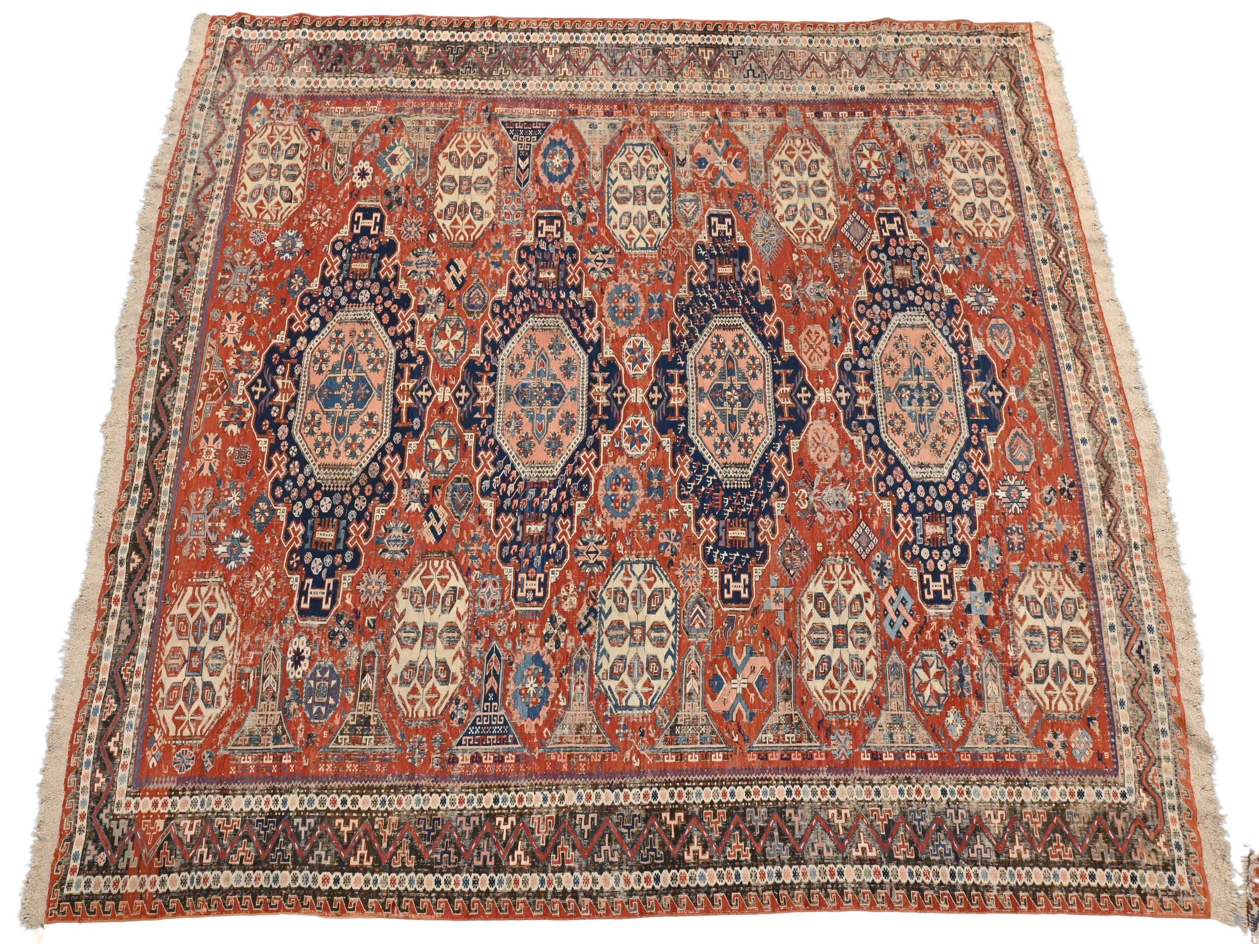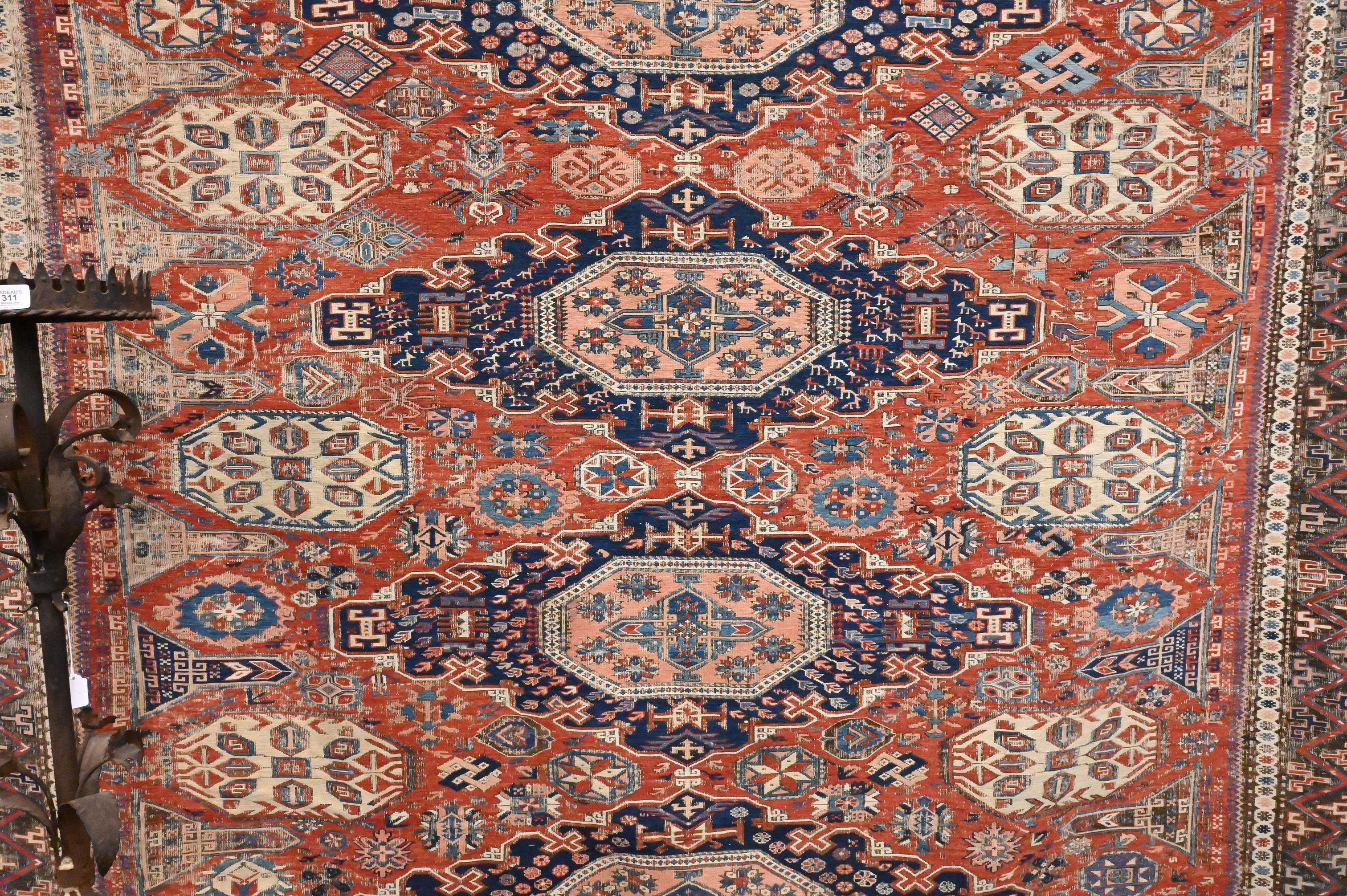 the claret ground surrounding a four-part blue-ground pole medallion flanked by subsidiary medallions; all decorated with geometric rosettes and devices, within an outer zig-zag border and latch hooked edges