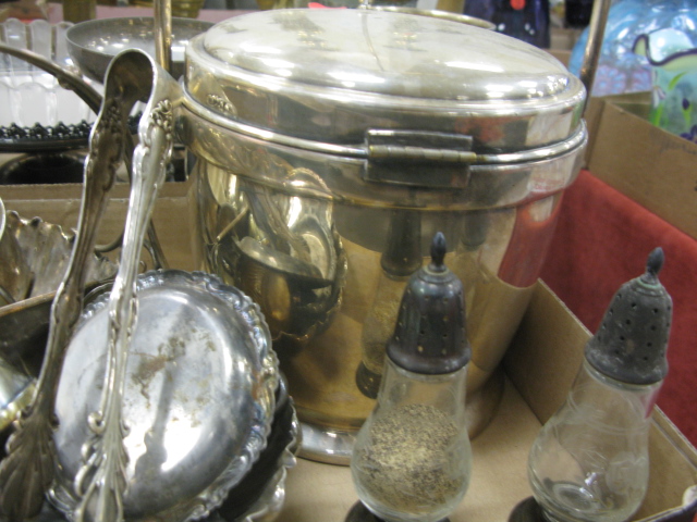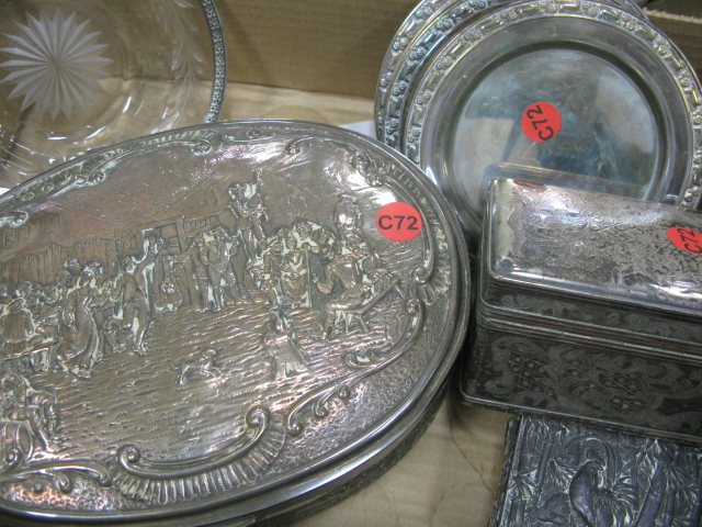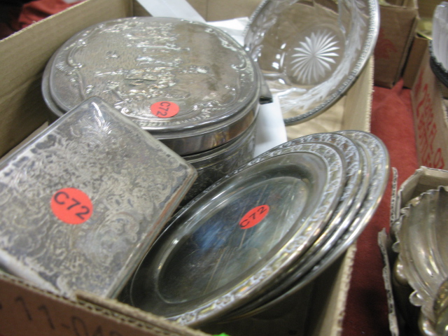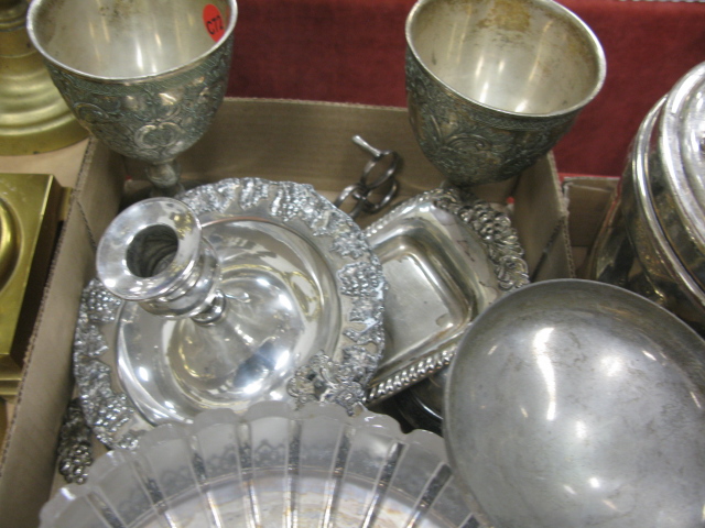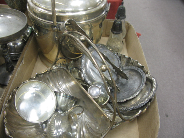 Three box lots of silver plated items including candlesticks, compote, covered boxes and misc.