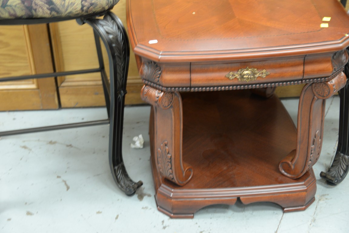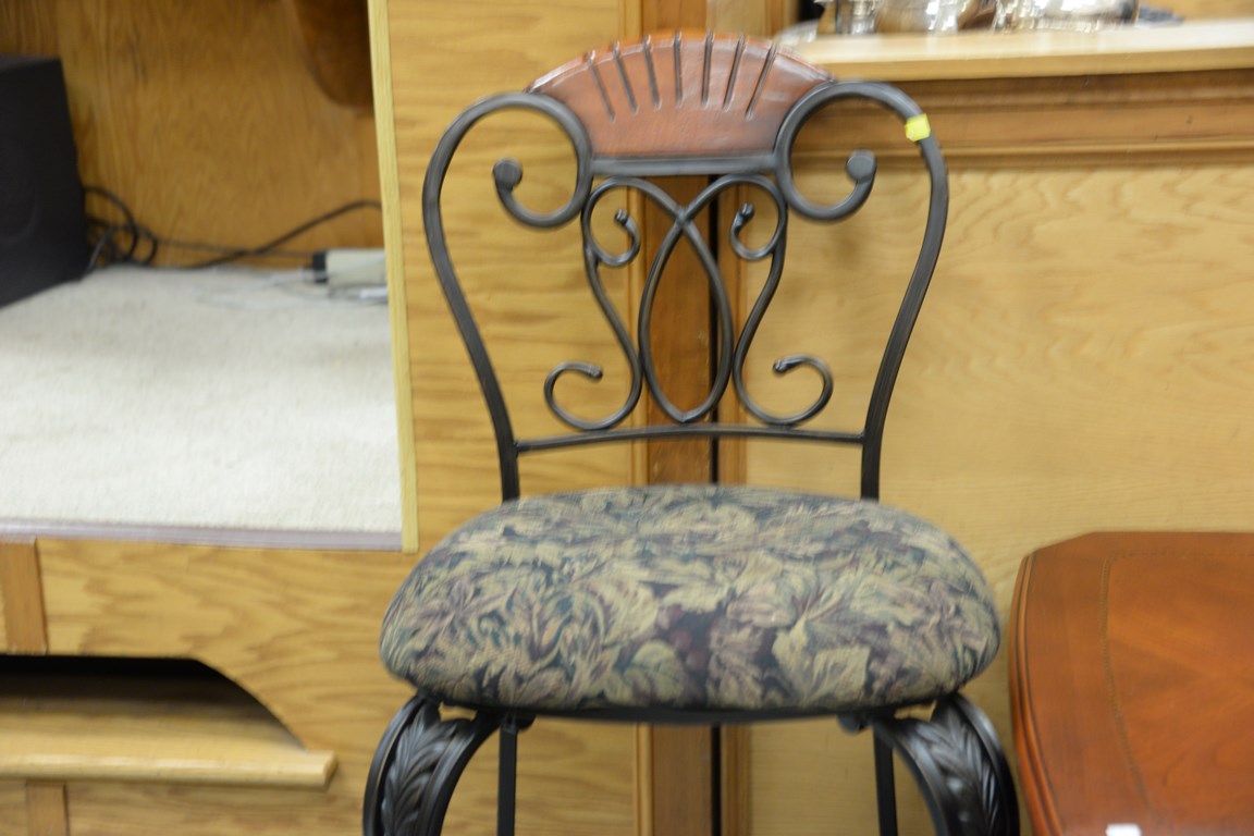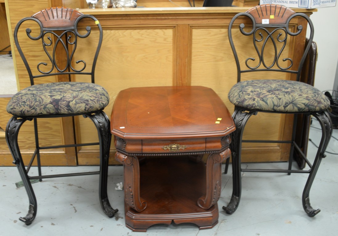 Three piece lot to include pair of bar stools and a side table. ht. 42 in.