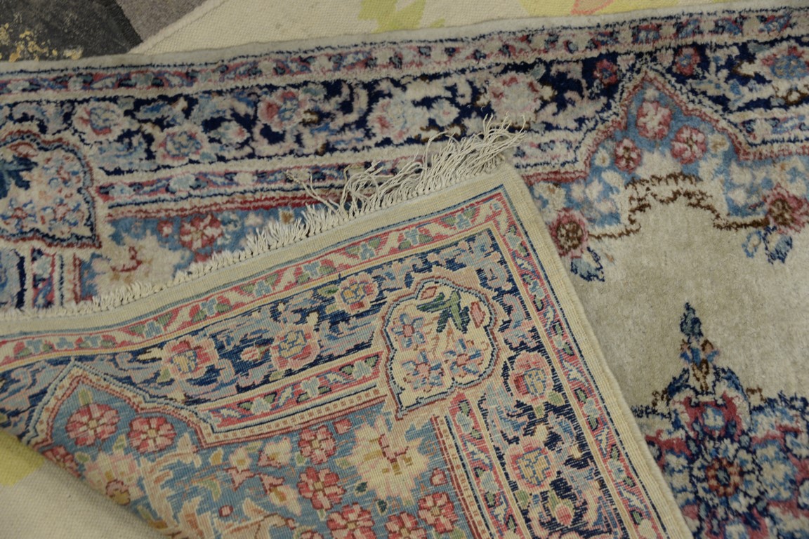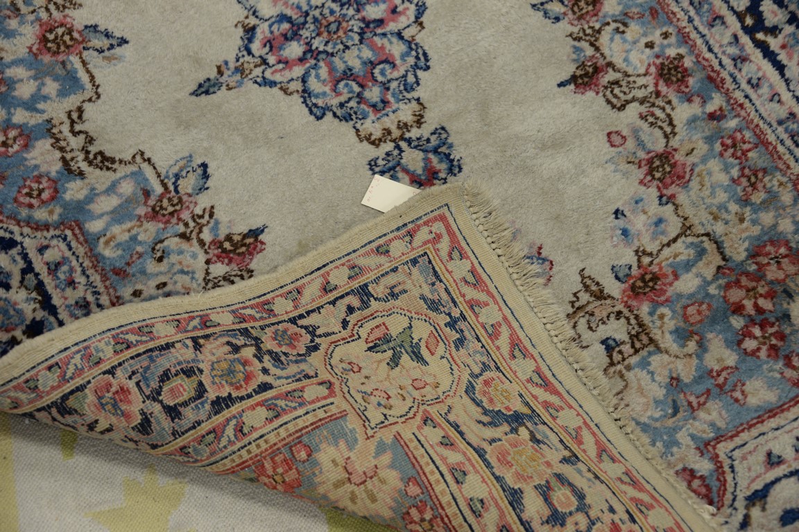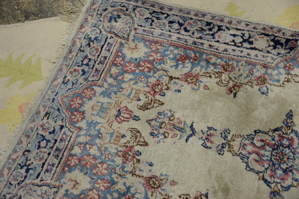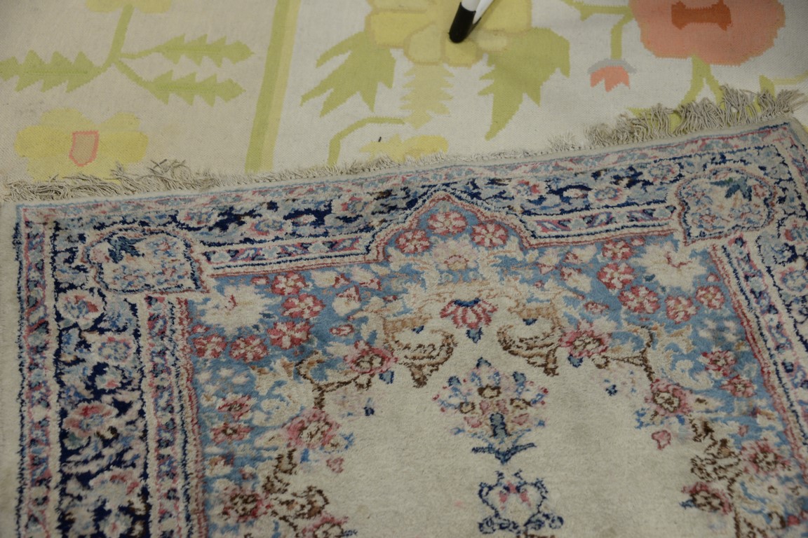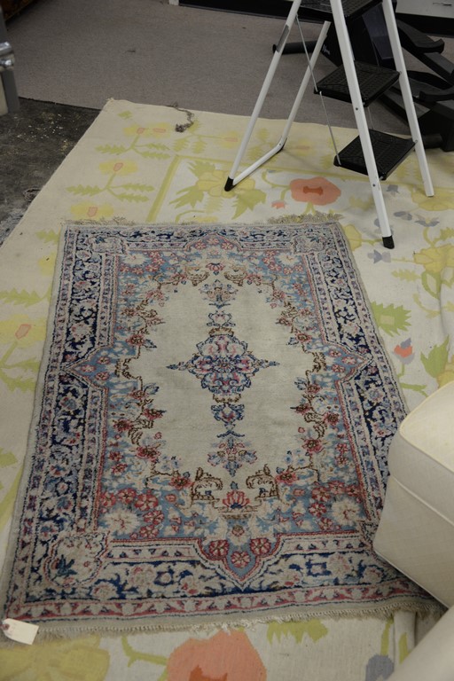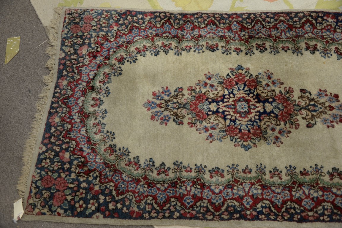 Lot 409: Three rugs including a pair of Kirman Oriental throw rug, 3′ x 4’10 and 3′ x 5′.
