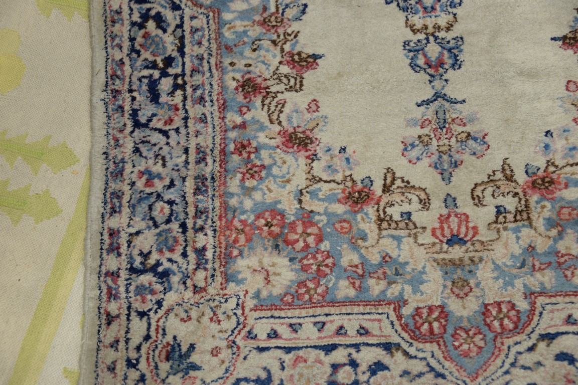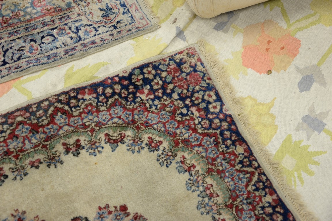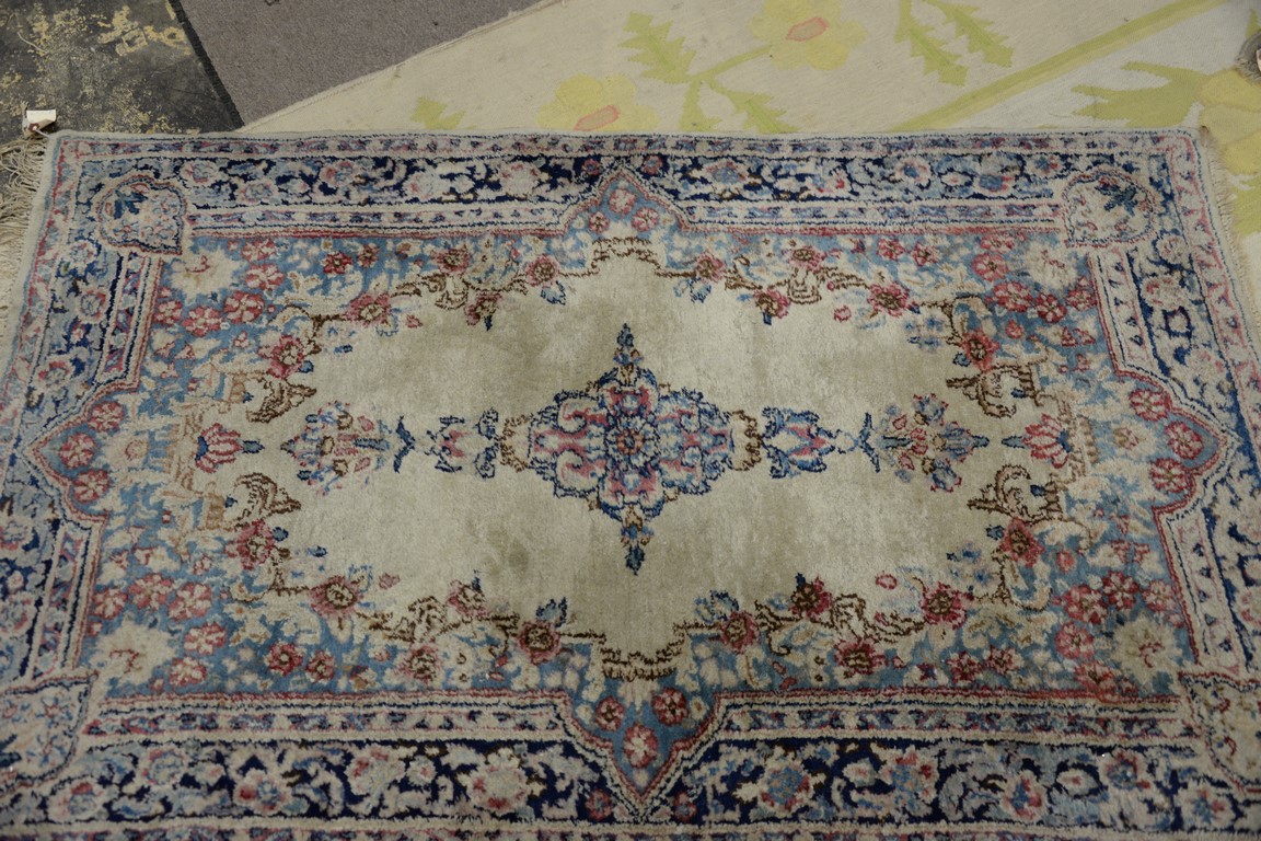 Three rugs including a pair of Kirman Oriental throw rug, 3′ x 4’10 and 3′ x 5′.