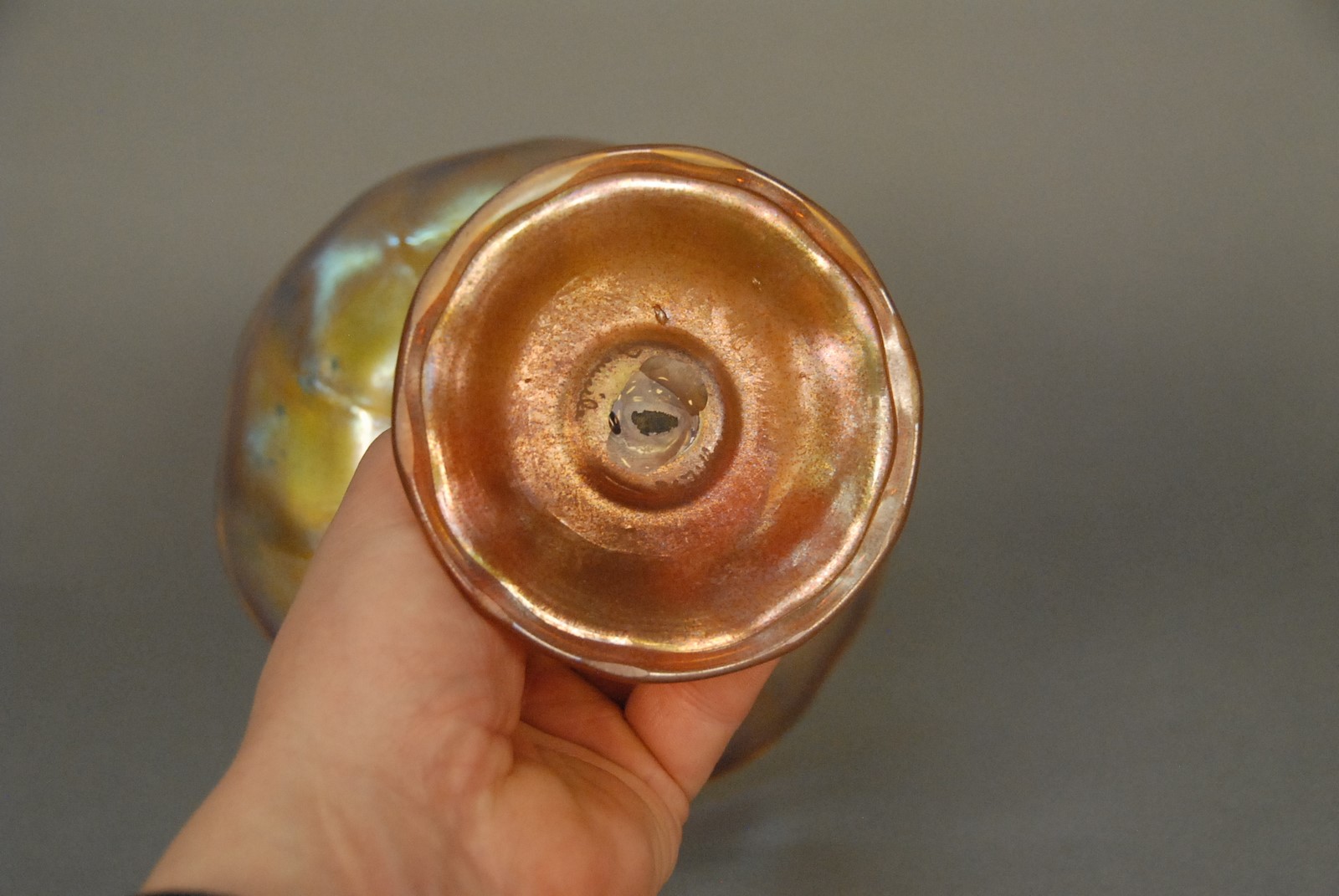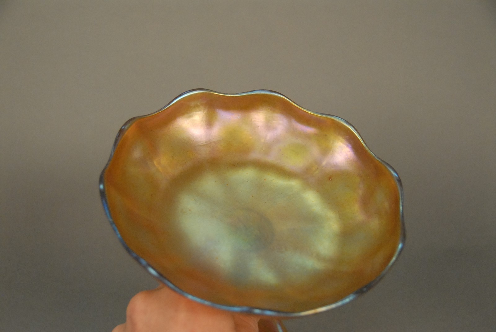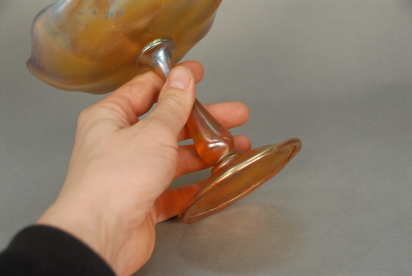 Lot 409: Tiffany gold Favrile glass compote with scalloped top on plain stem and round footed base, inscribed on bottom L.C. Tiffany Favrile. ht. 5 7/8 in.