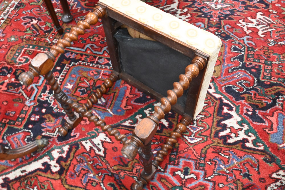 Walnut Stool, having turned legs, 18th – 19th century, height 19 1/2 inches, top 18″ x 18 1/2″.