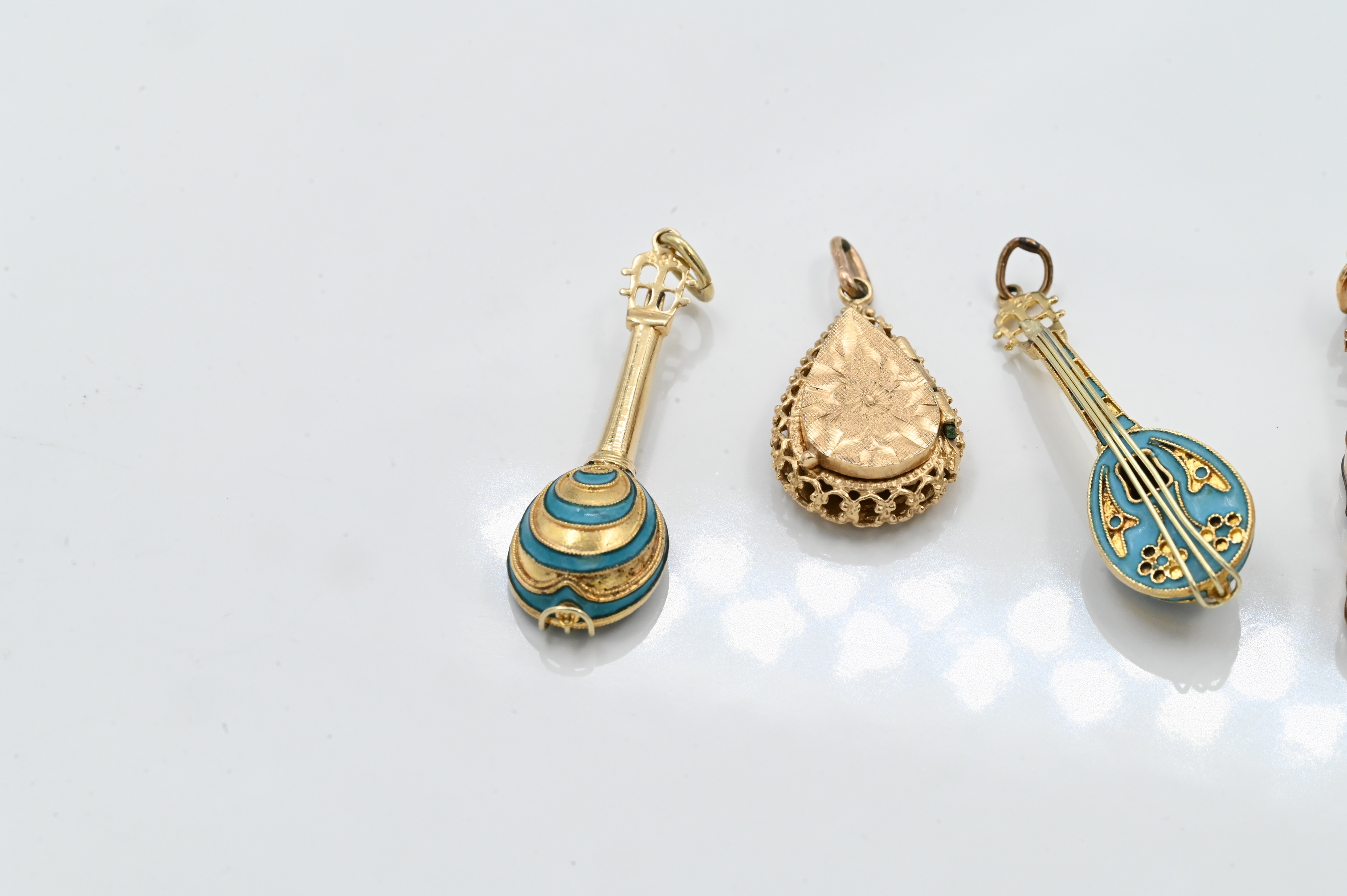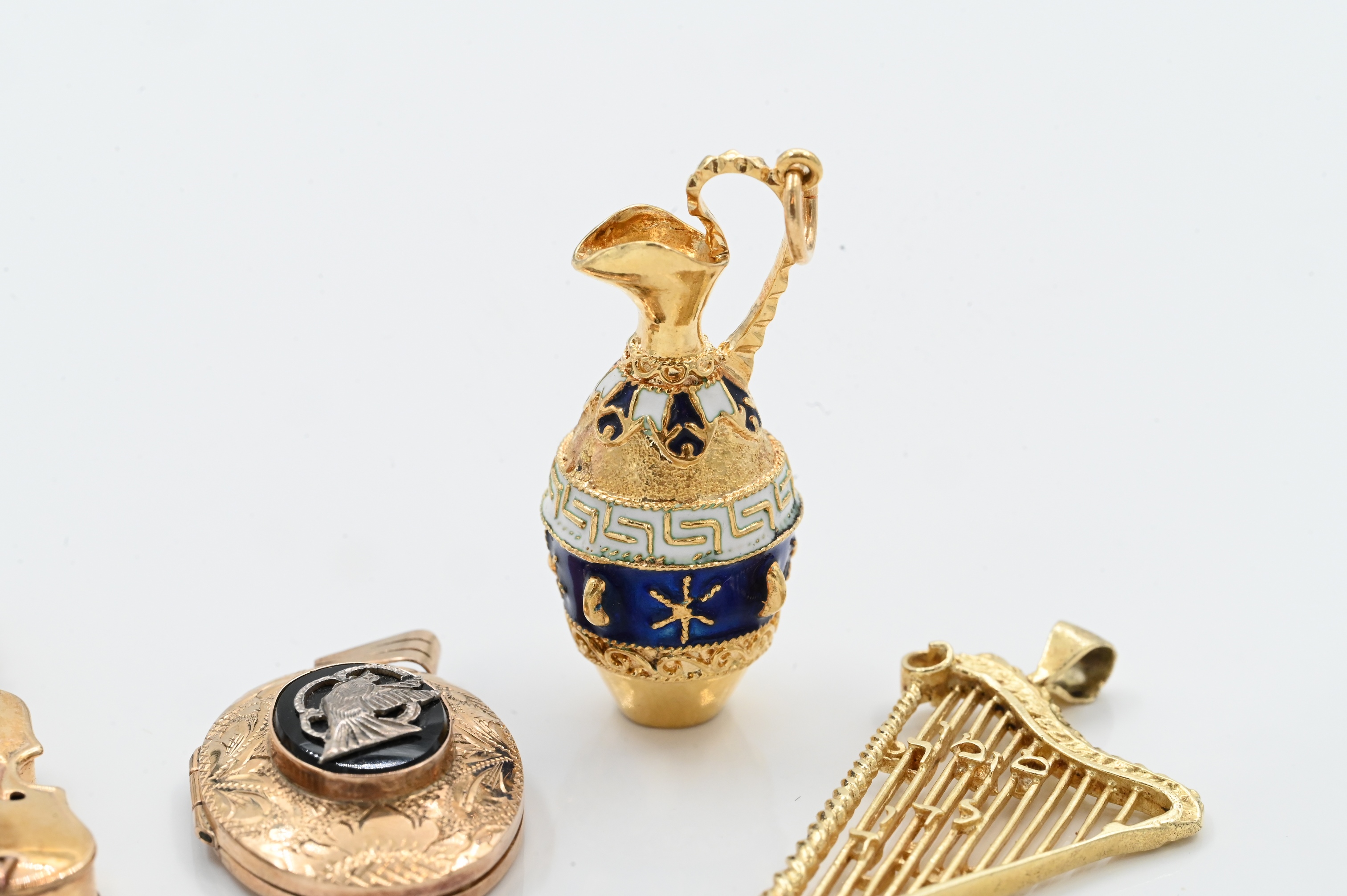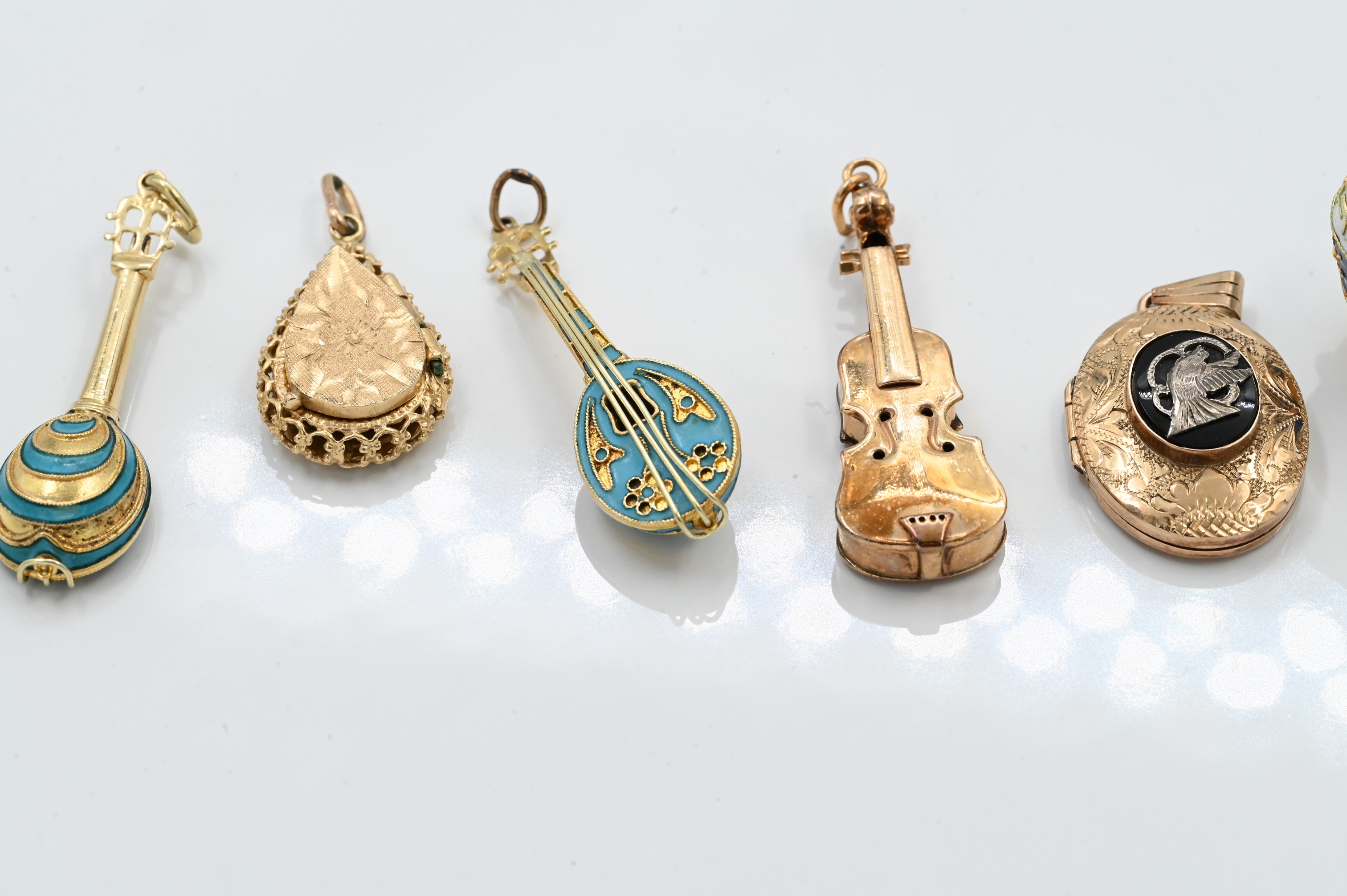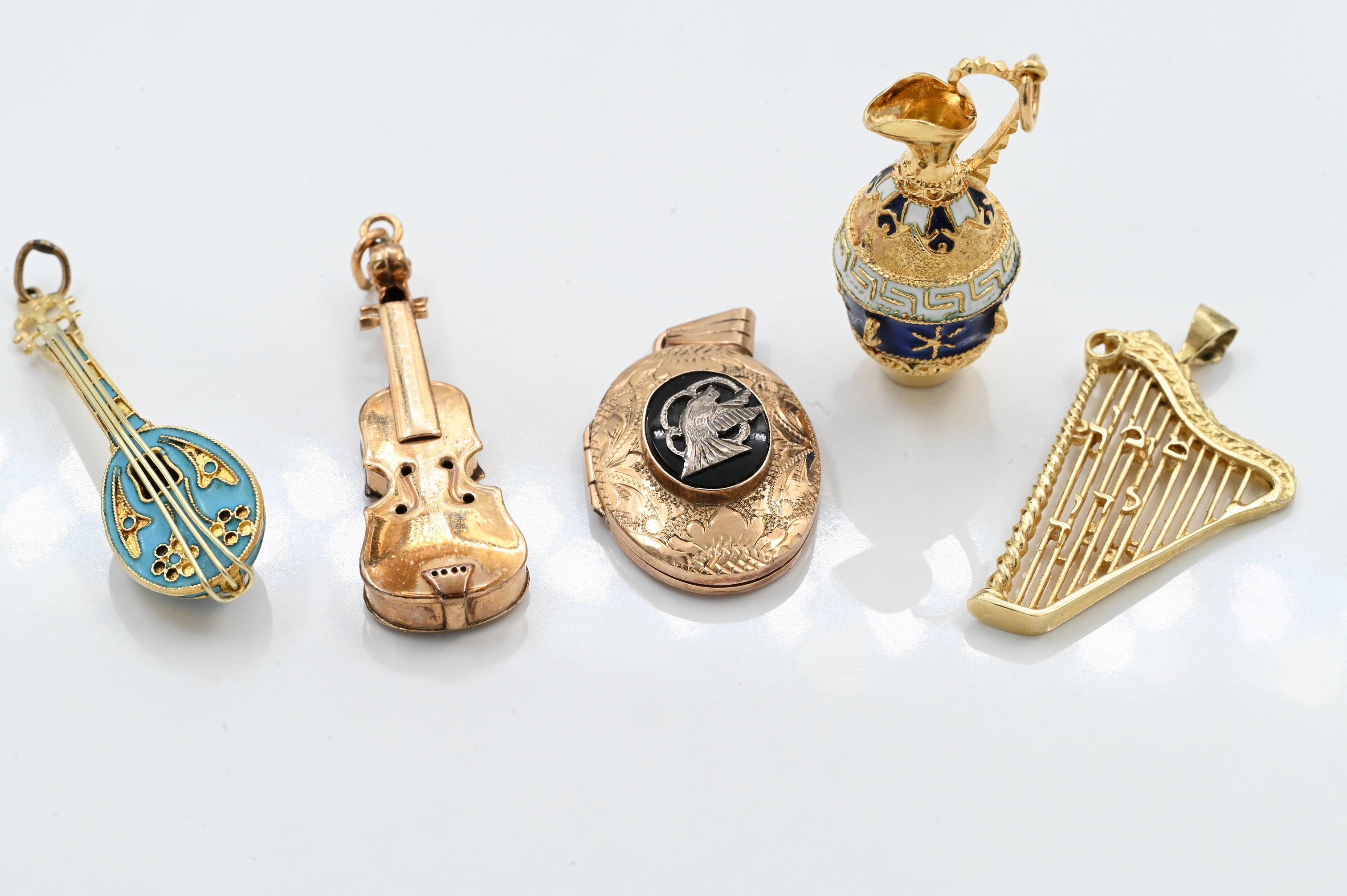 to include harp, violin, two enameled mandolins, two lockets and one 18K gold enamel urn vase