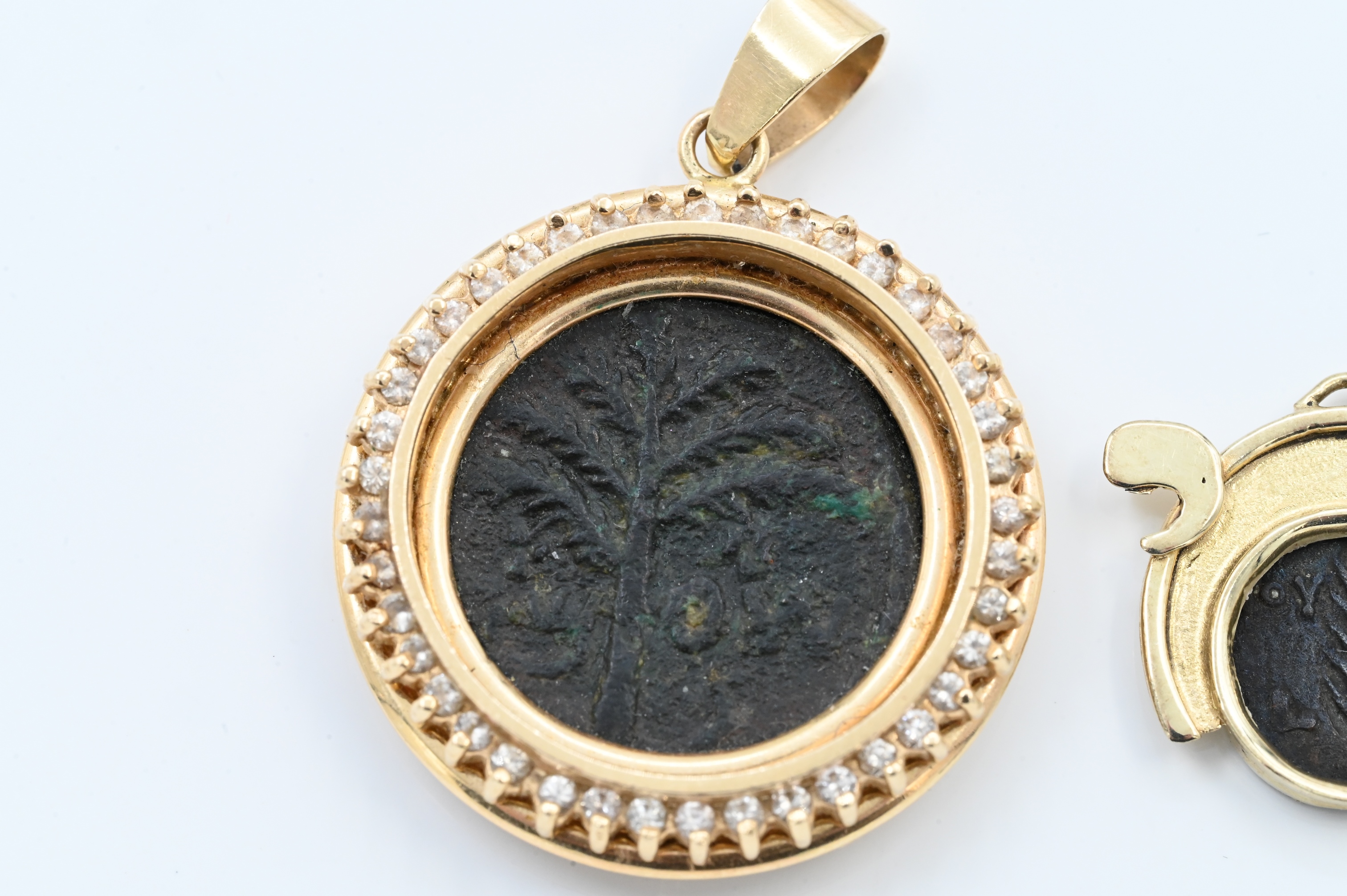 having ancient Middle Eastern coins, one with halo of diamonds