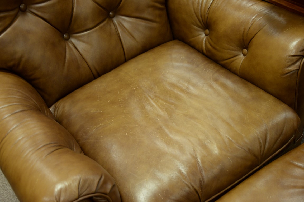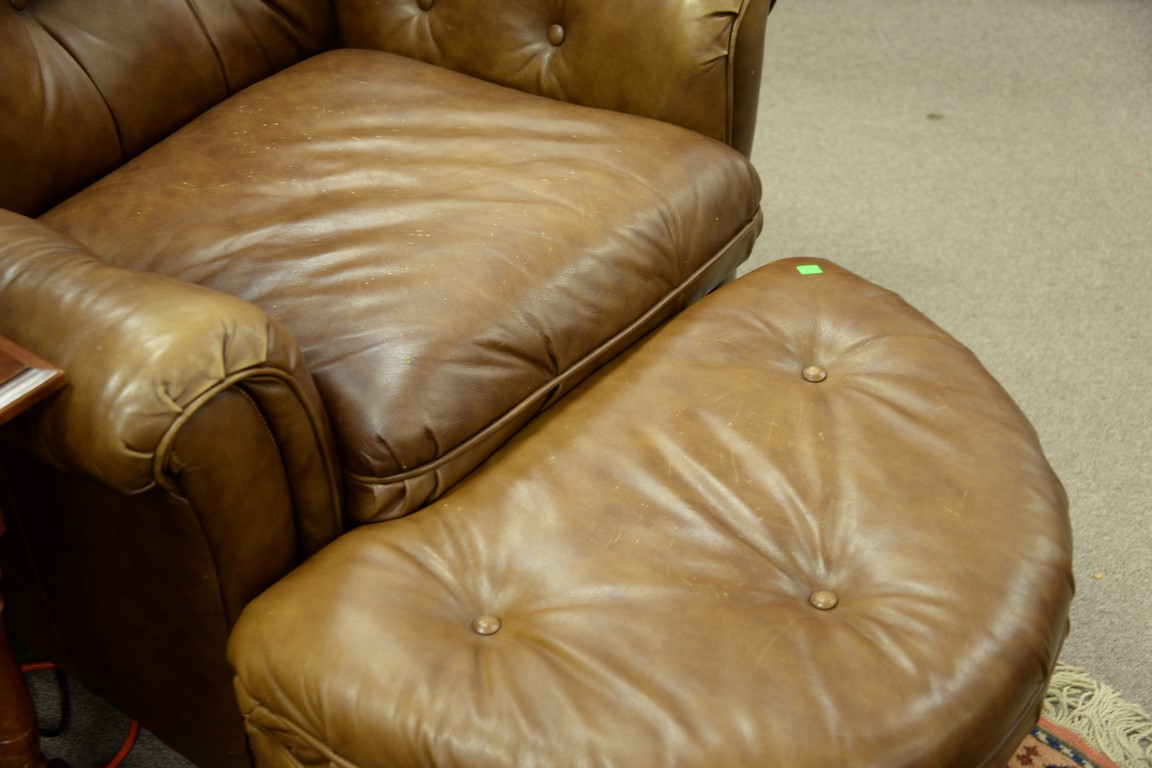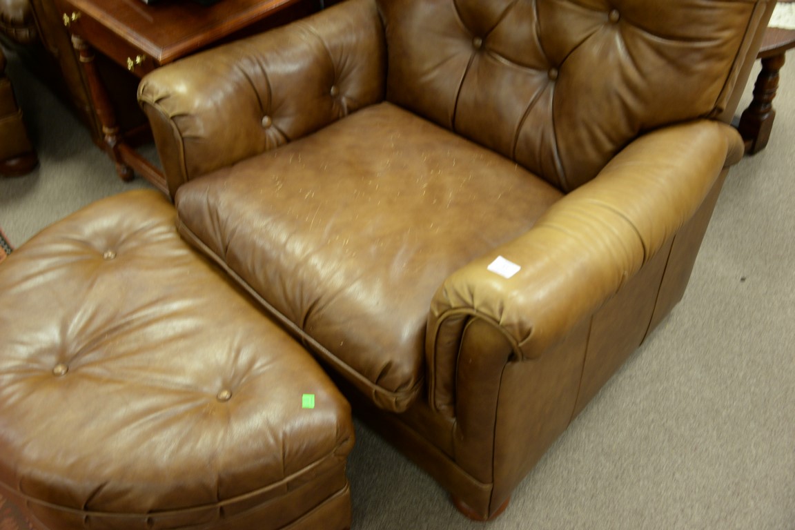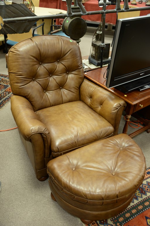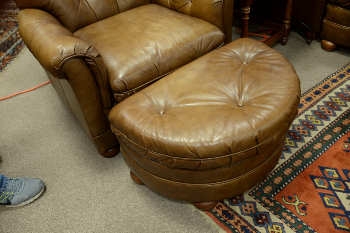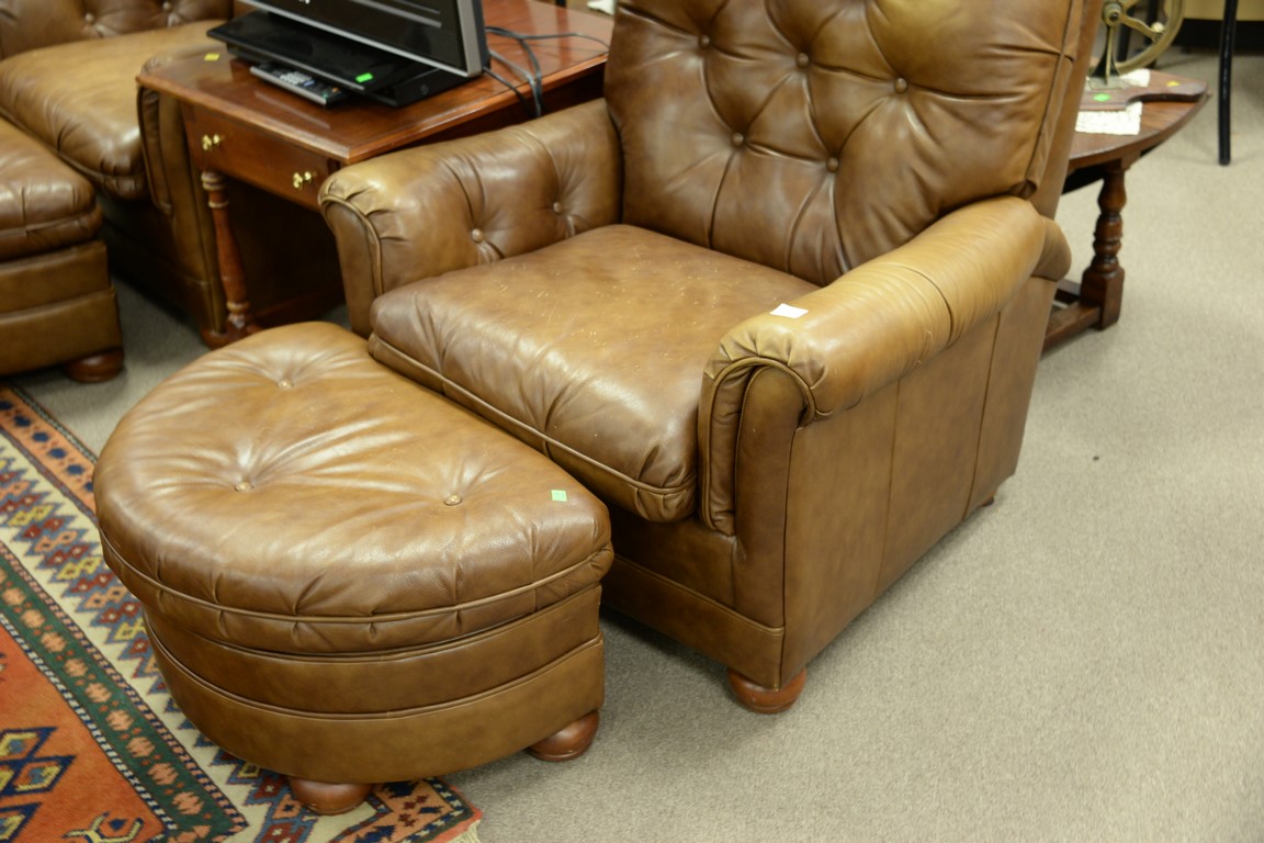 Lot 41: Bradington Young pair of leather upholstered Rockwell 8 way comfort loungers/chairs and ottomans.