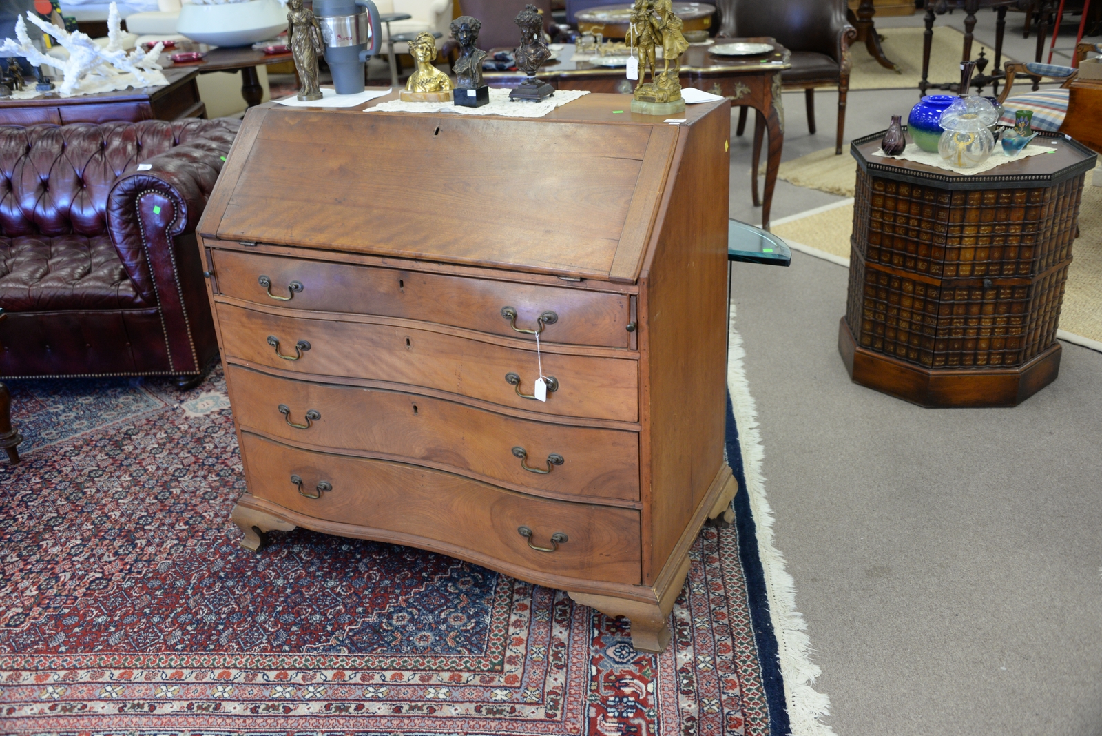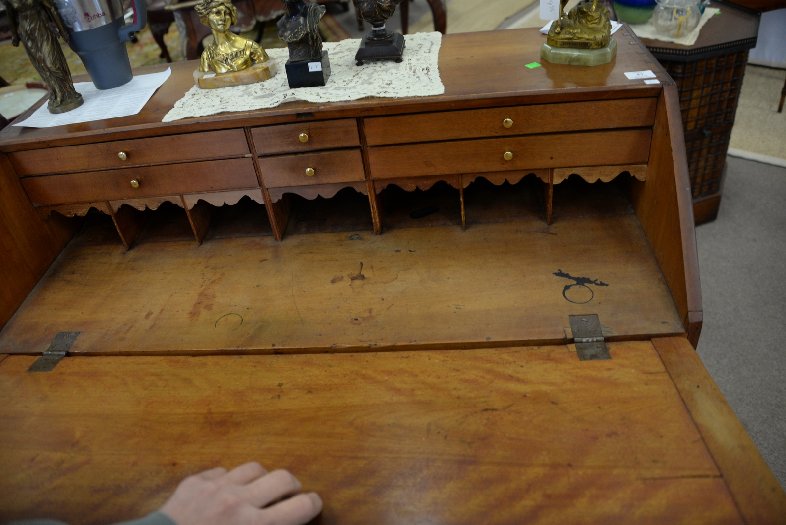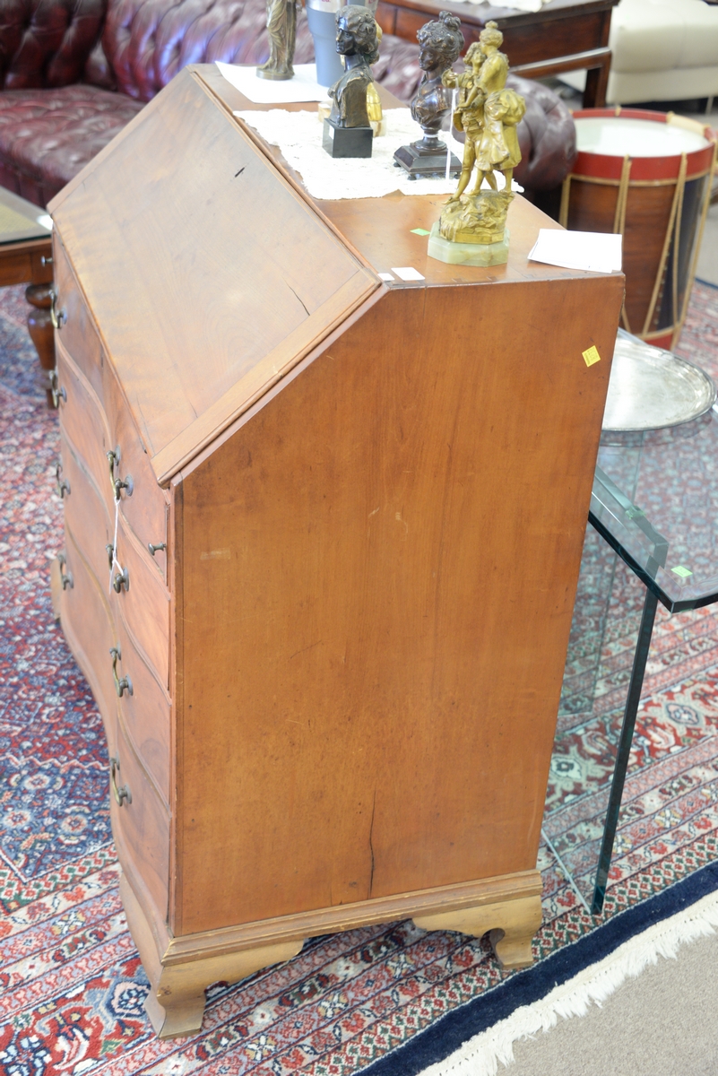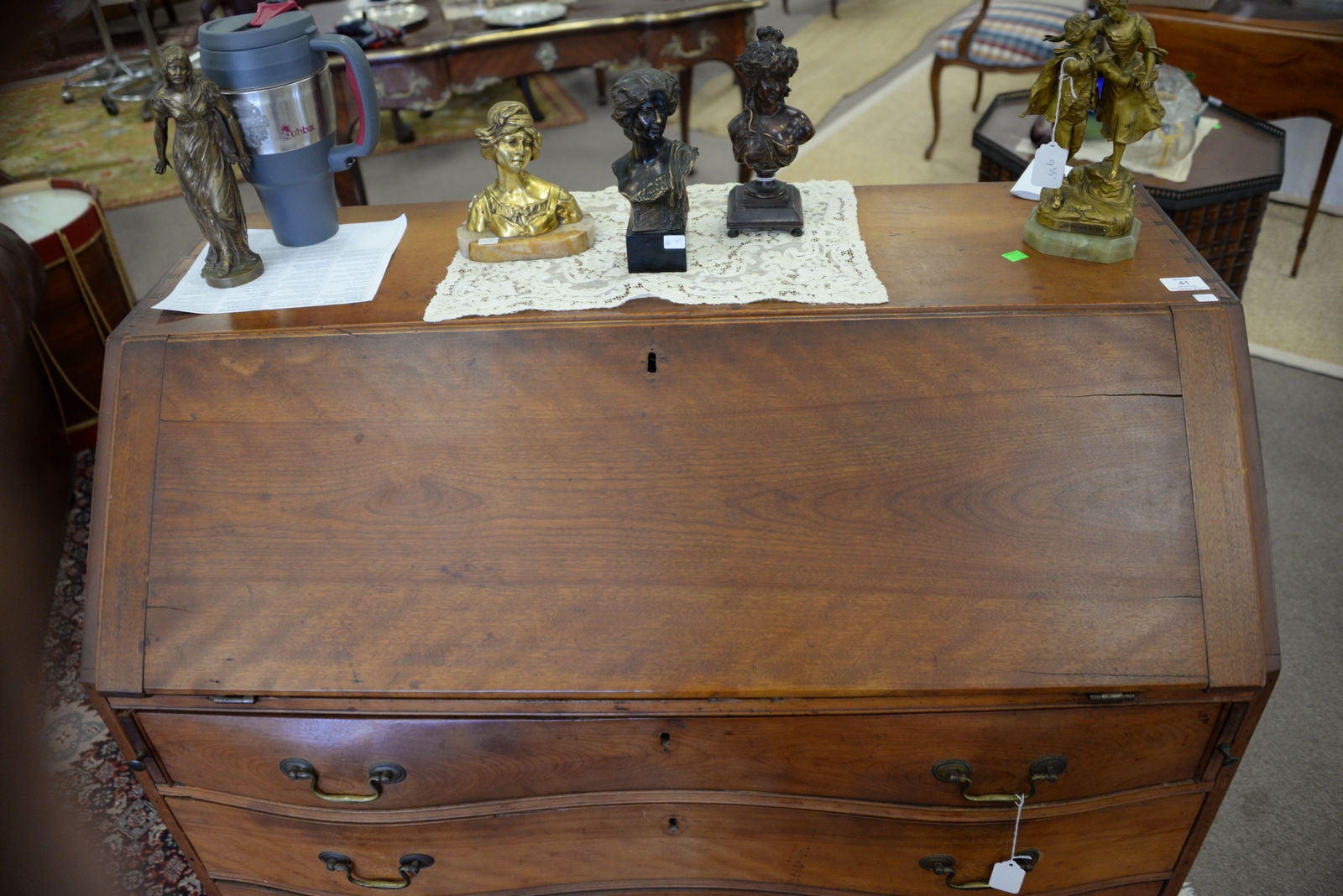 Lot 41: Cherry Chippendale desk with slant lid over four oxbow front drawers set on ogee feet, circa 1780 restored.