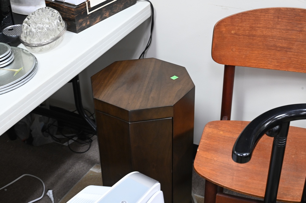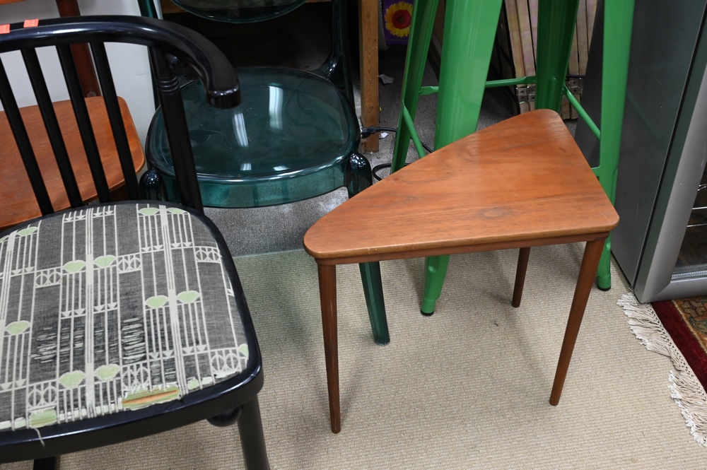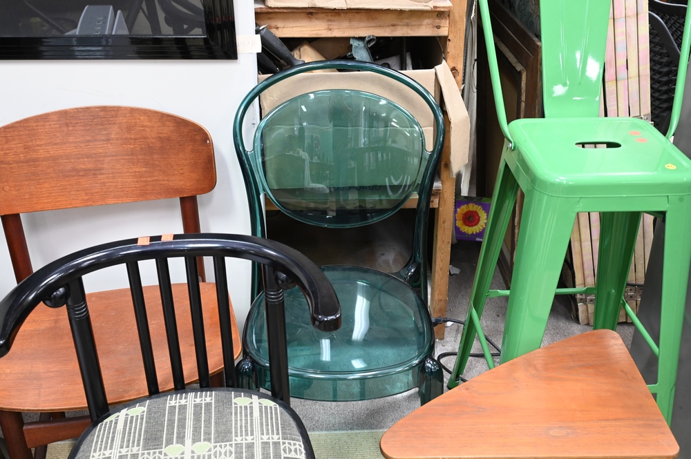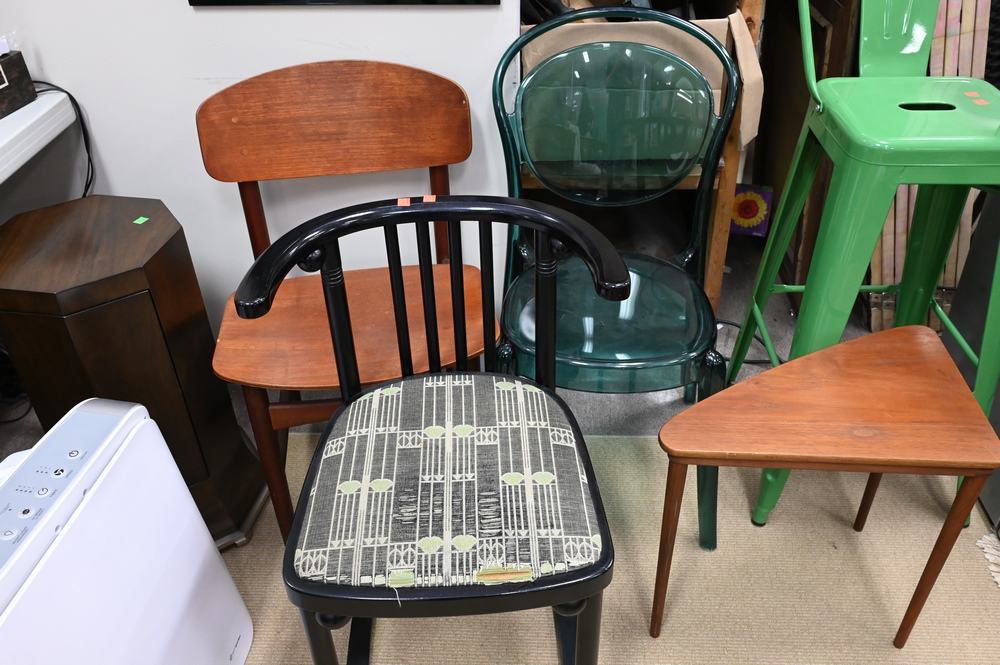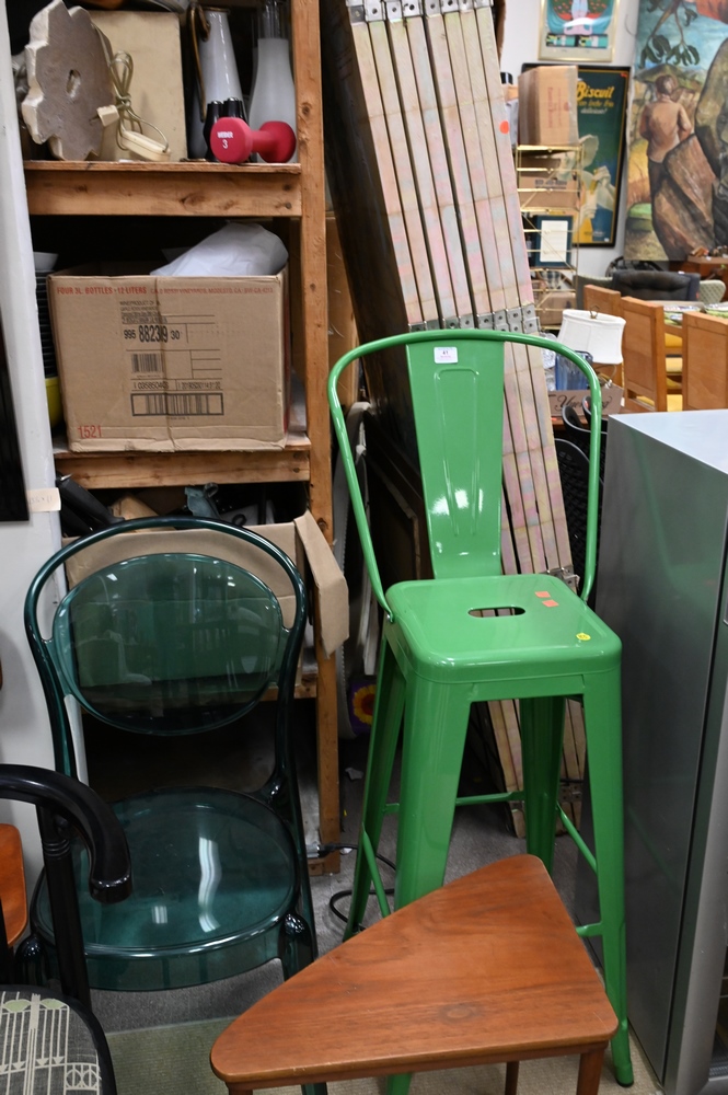 Lot 41: Five Piece Group, to include Josef Hoffman made by Wittmann Side Chair, having worn and torn upholstery, along with Calligaris Parisienne ghost chair, small triangle stand and side chair, and industrial metal stool, Wittmann seat height 17 inches.