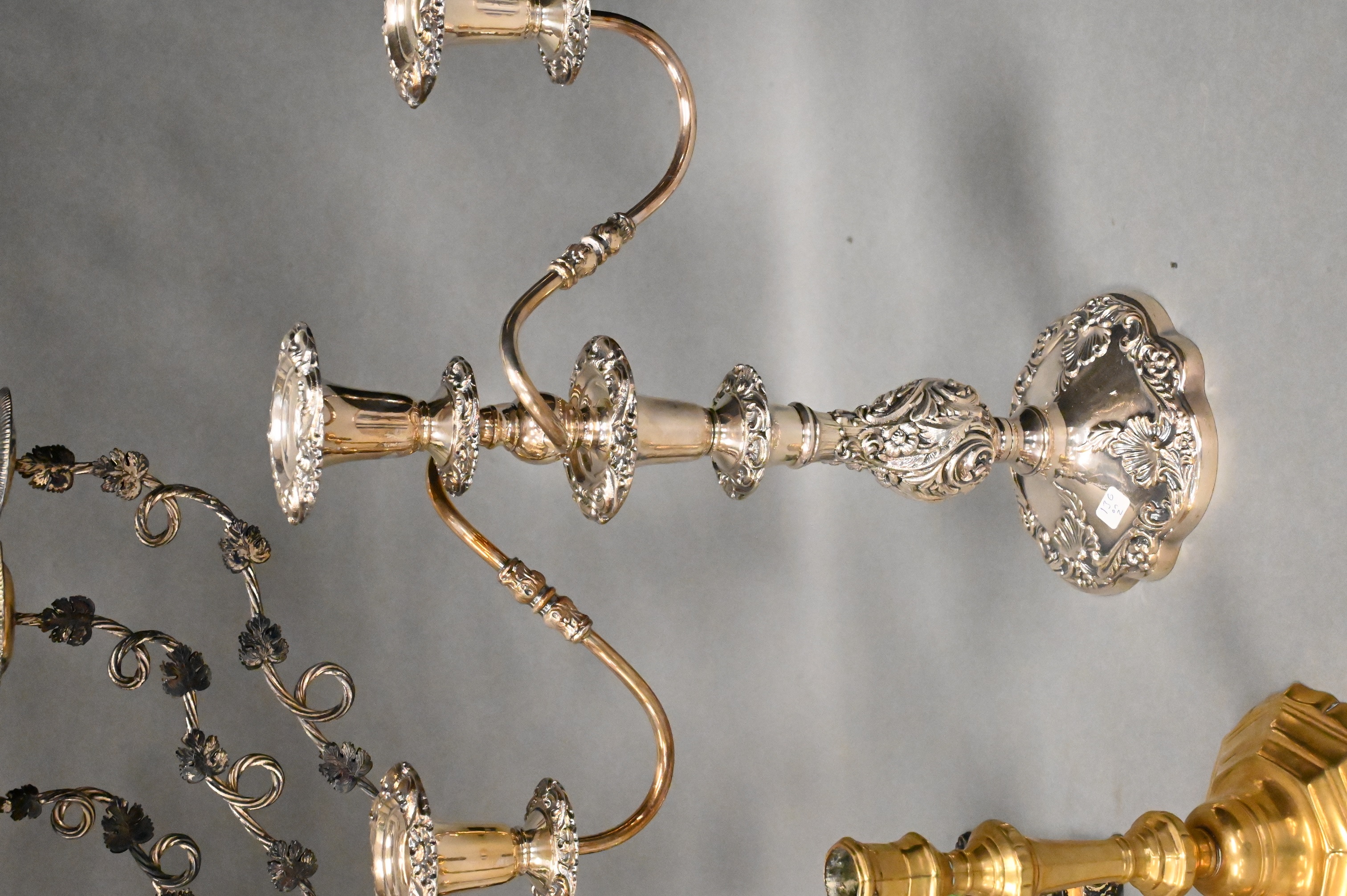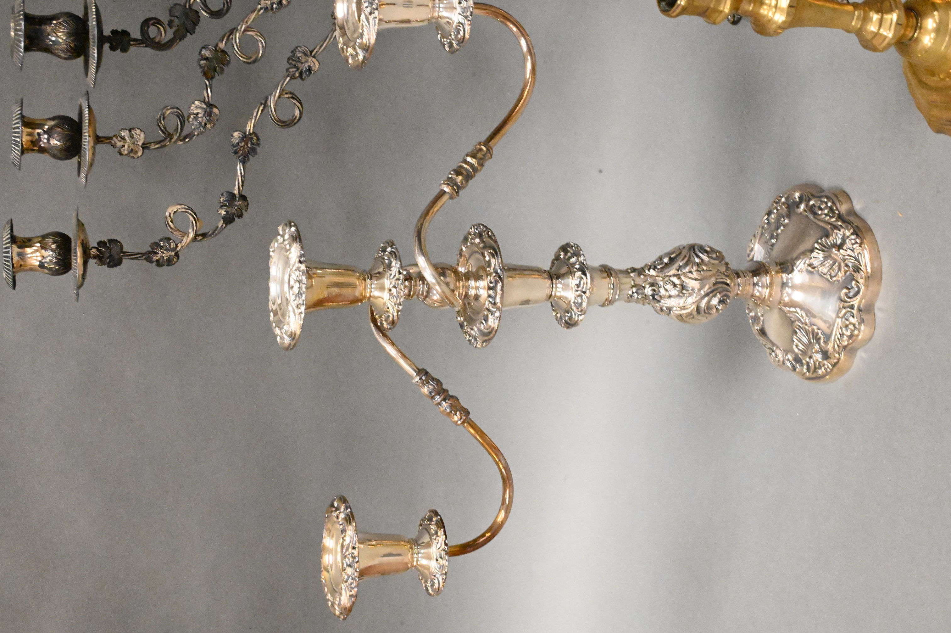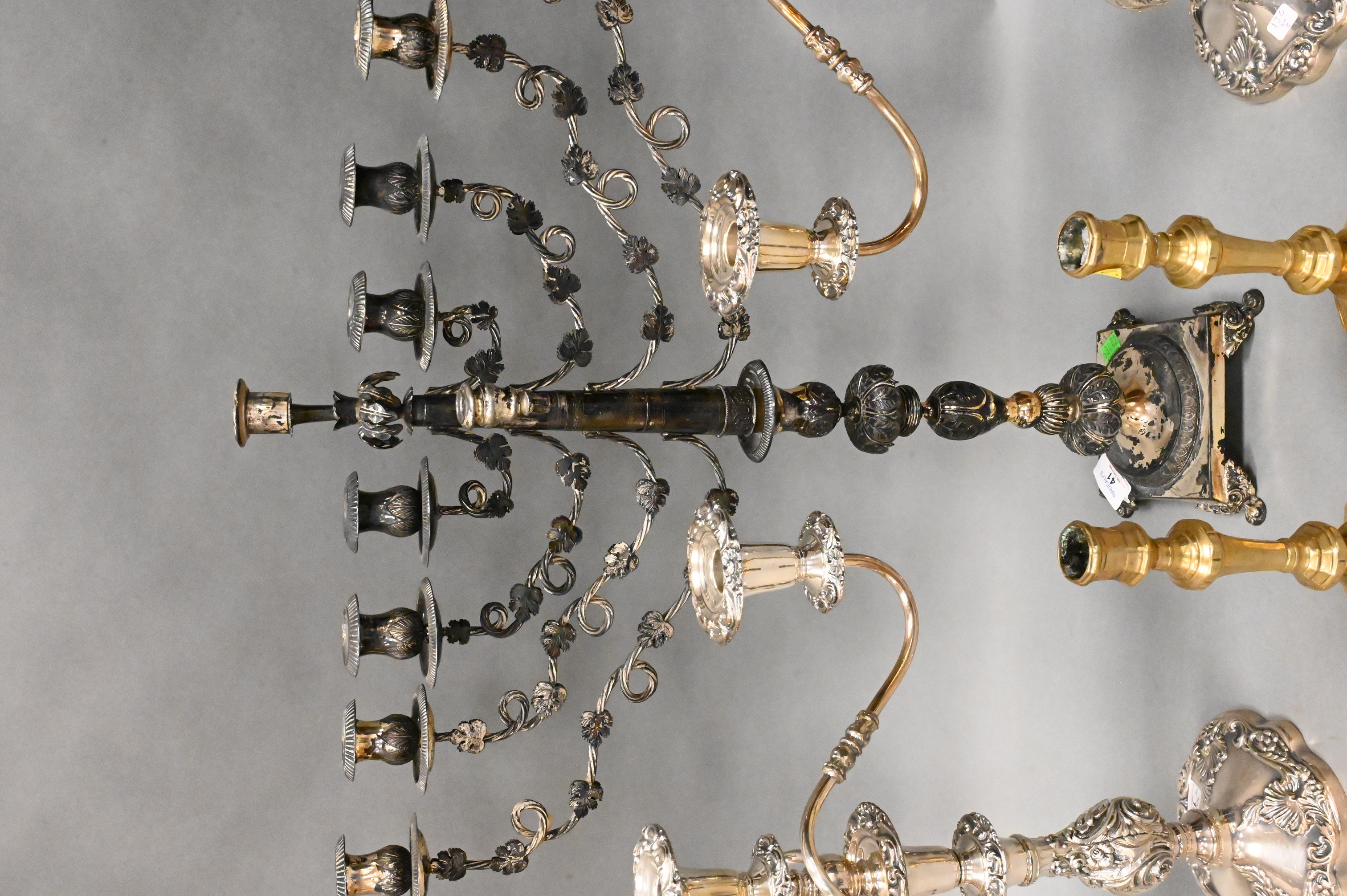 pair of silver plated candelabra, large silver plated menorah, along with a pair of federal brass candlesticks