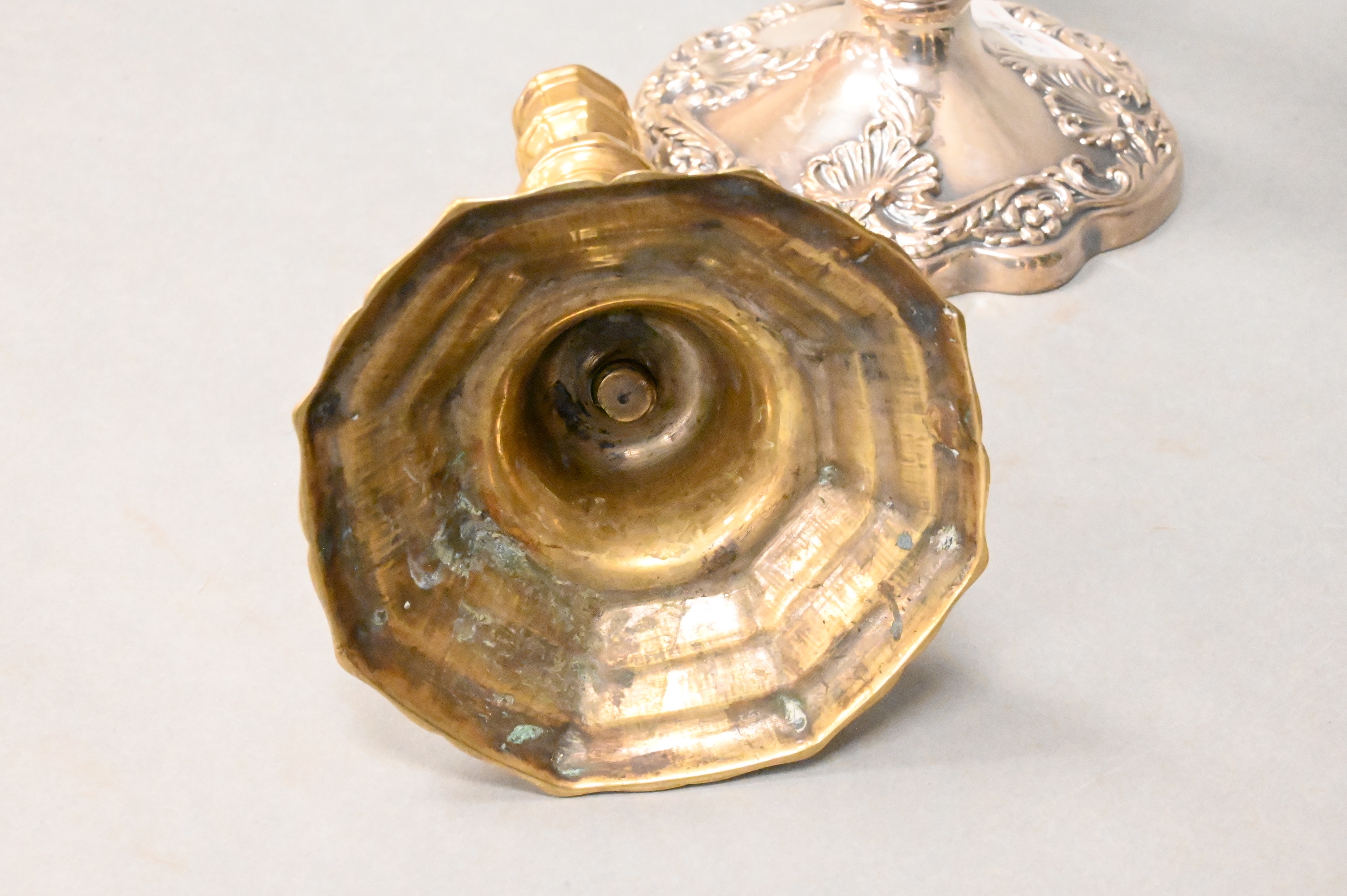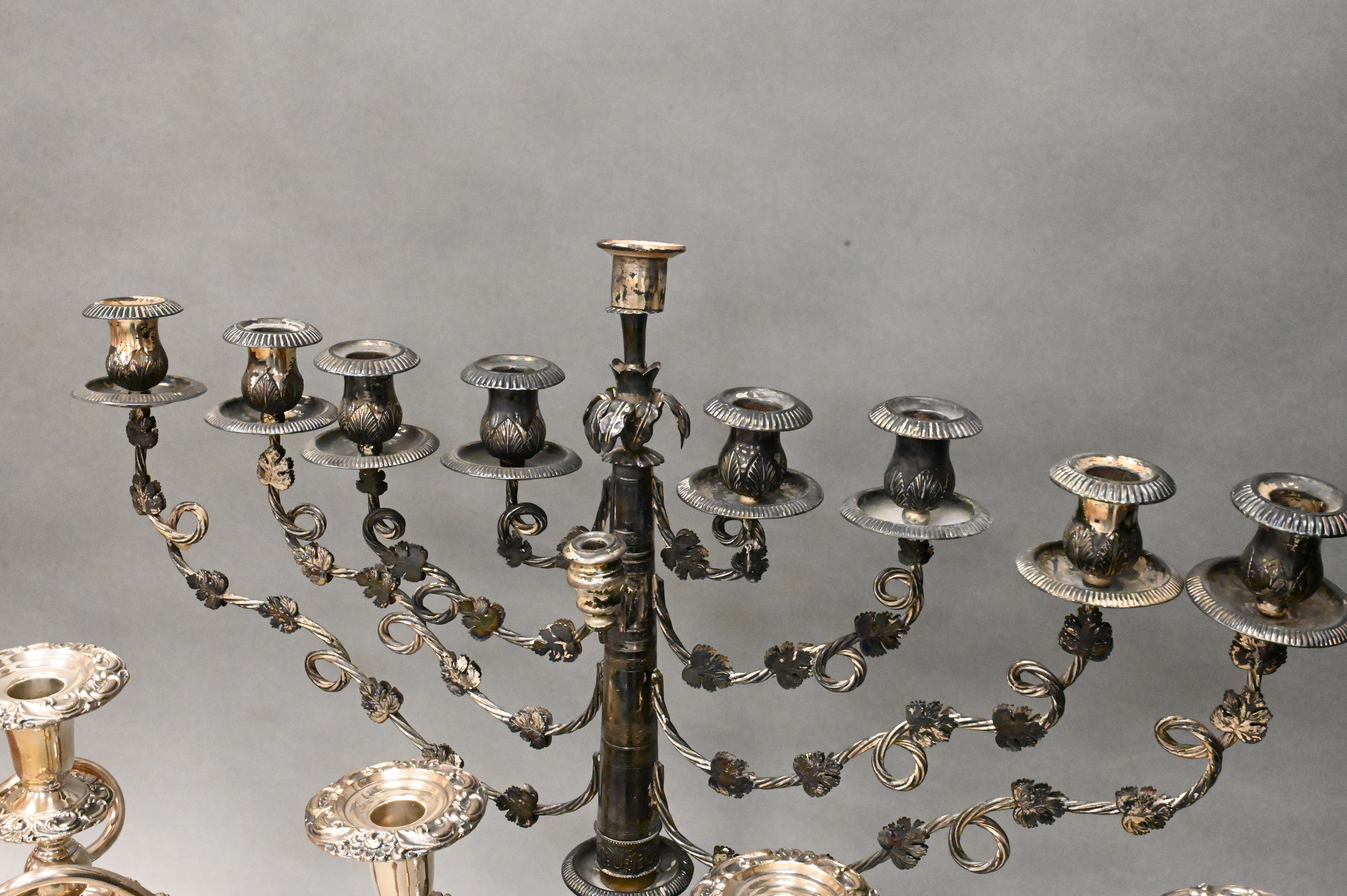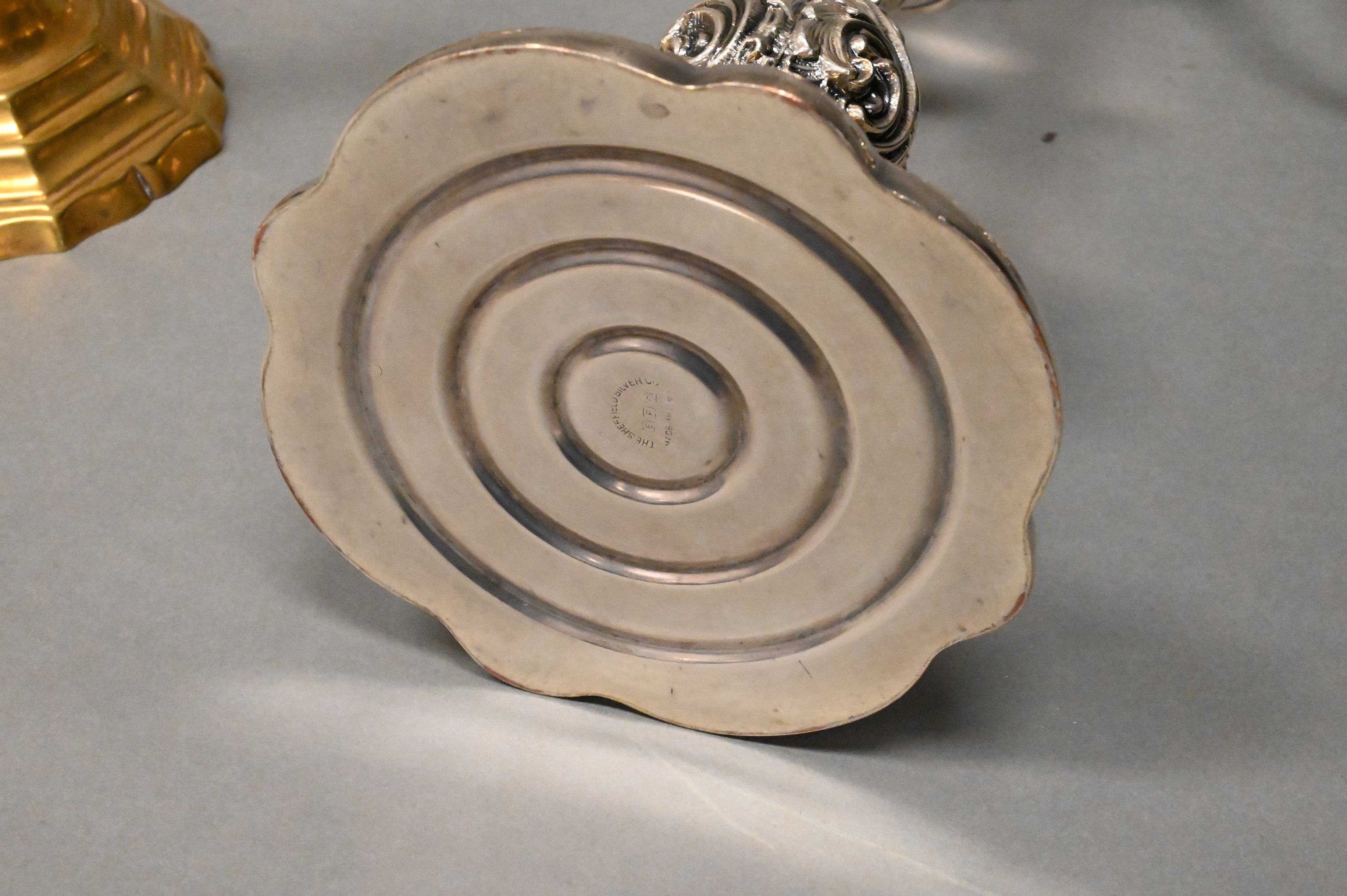 pair of silver plated candelabra, large silver plated menorah, along with a pair of federal brass candlesticks