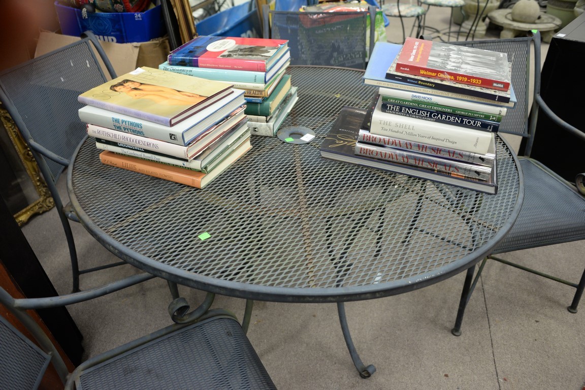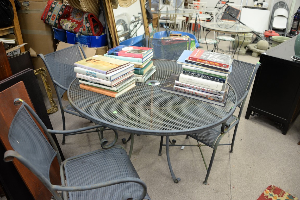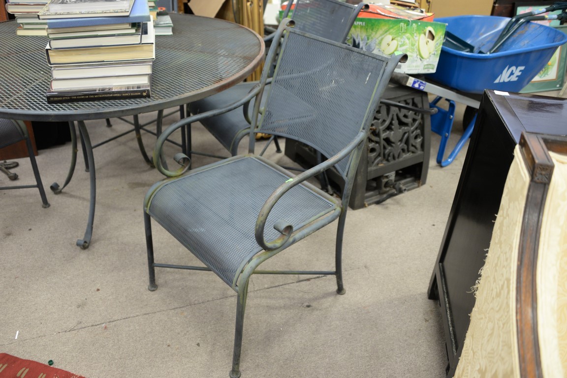 Five piece lot including mesh metal table and four armchairs. dia. 48in.