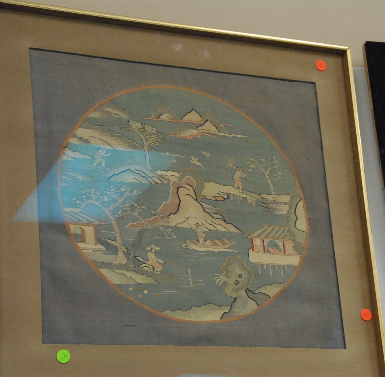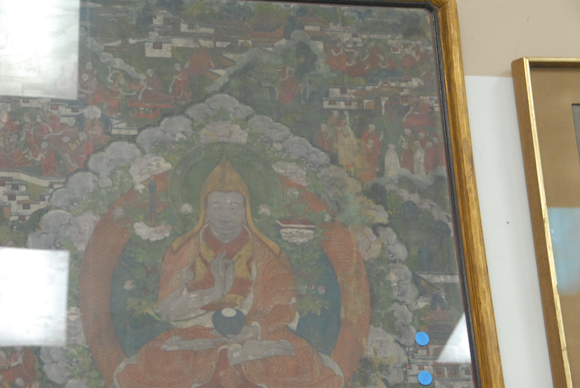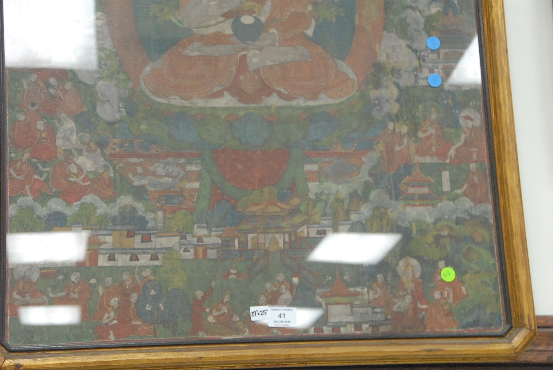 Framed Tibetan painting with Buddha in the center, along with a framed needlework of men fishing.