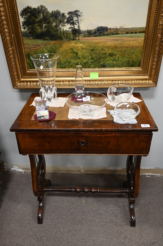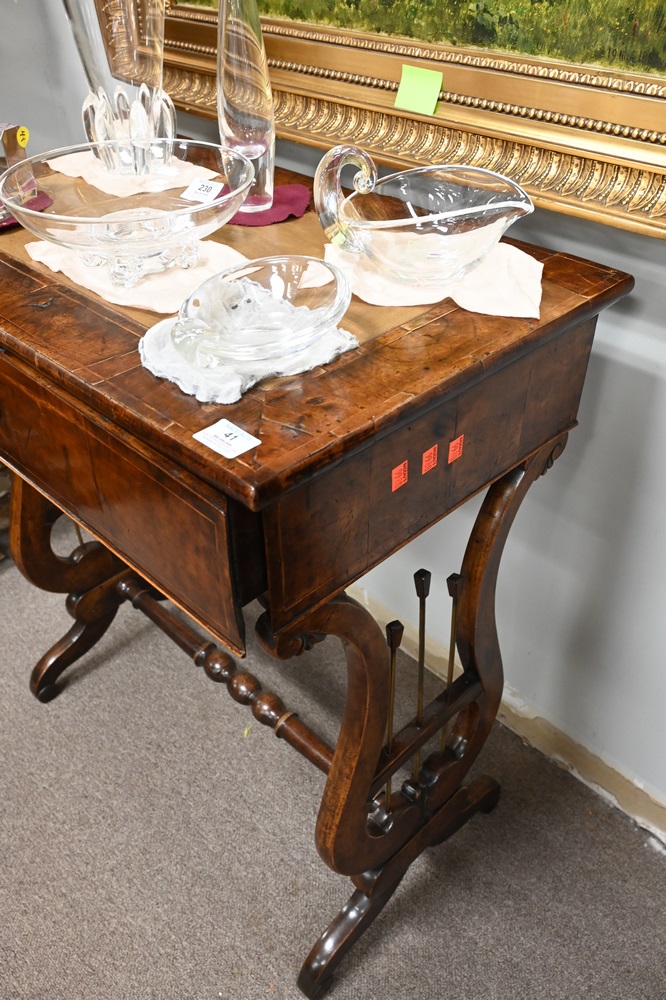Lot 41: George III Walnut Work Table, having inset leather and one drawer, circa 1840, height 30 inches, top 16 3/4 x 26 3/4 inches, Provenance: Connecticut Personal Collection of American Antiques and Oriental Rugs.