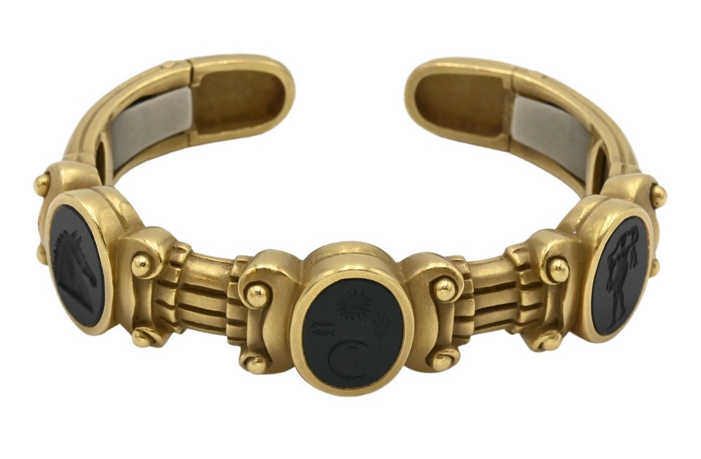 Lot 41: Kieselstein-Cord 18 Karat Gold Cuff Bracelet, set with three oval etched panels to include one onyx with horse head; one ruby color …