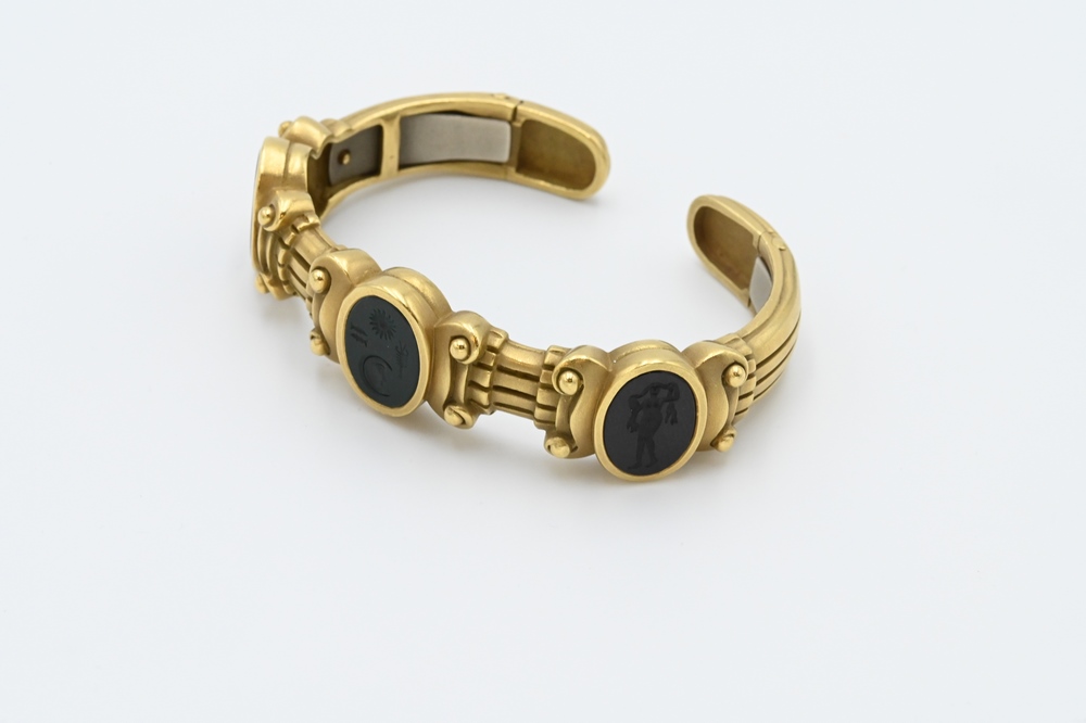 Kieselstein-Cord 18 Karat Gold Cuff Bracelet, set with three oval etched panels to include one onyx with horse head; one ruby color with woman; one bloodstone with moon, fish, bug and sun; 44 x 59 millimeters interior, 78.8 grams.
