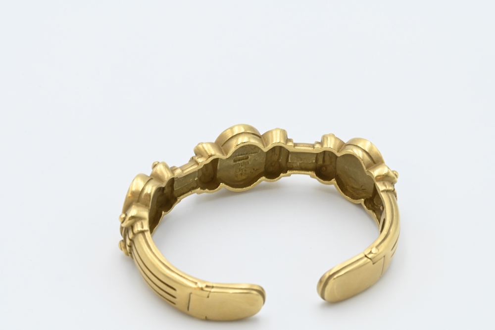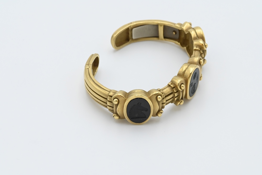 Lot 41: Kieselstein-Cord 18 Karat Gold Cuff Bracelet, set with three oval etched panels to include one onyx with horse head; one ruby color …