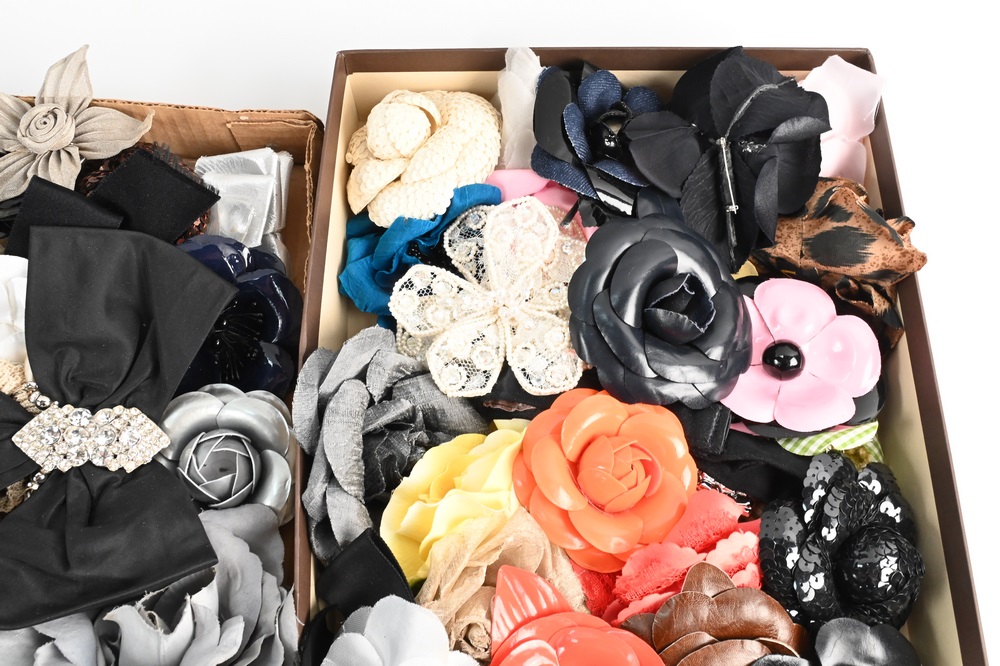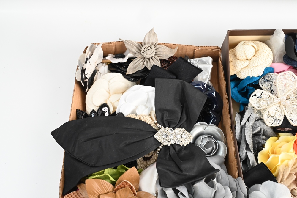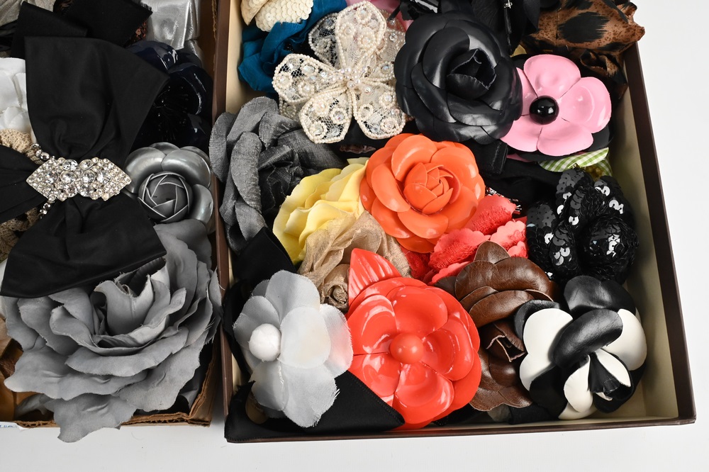 Lot 41: Lot of Flower Pins and Hair Accessories, to include leather, beaded, sequin and silk flowers, 40+ pieces, in good pre-owned condition.
