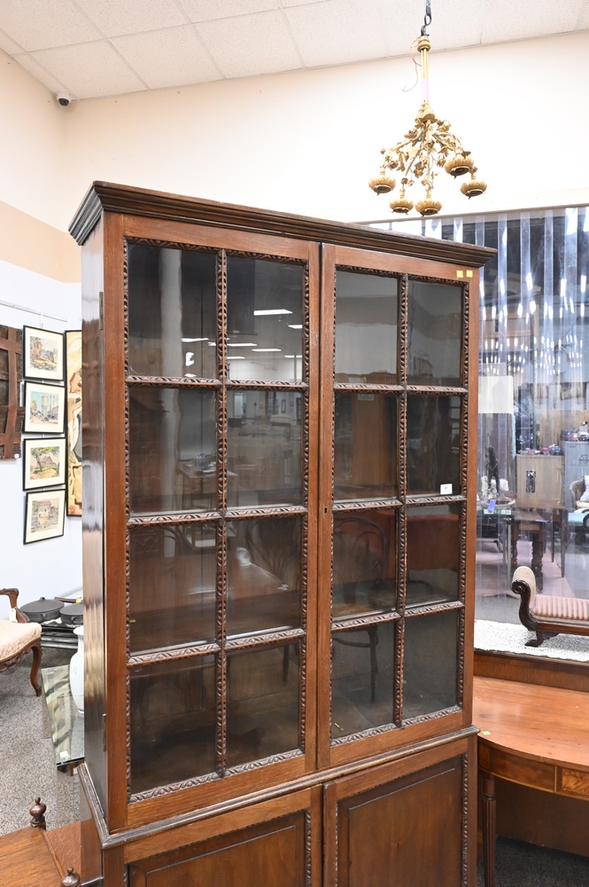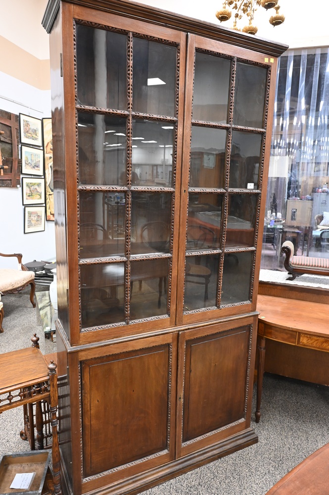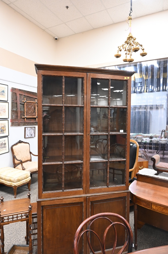 Lot 41: Mahogany Two Part Cabinet, having seven panel glazed doors over two doors, height 80 1/2 inches, width 39 1/2 inches.