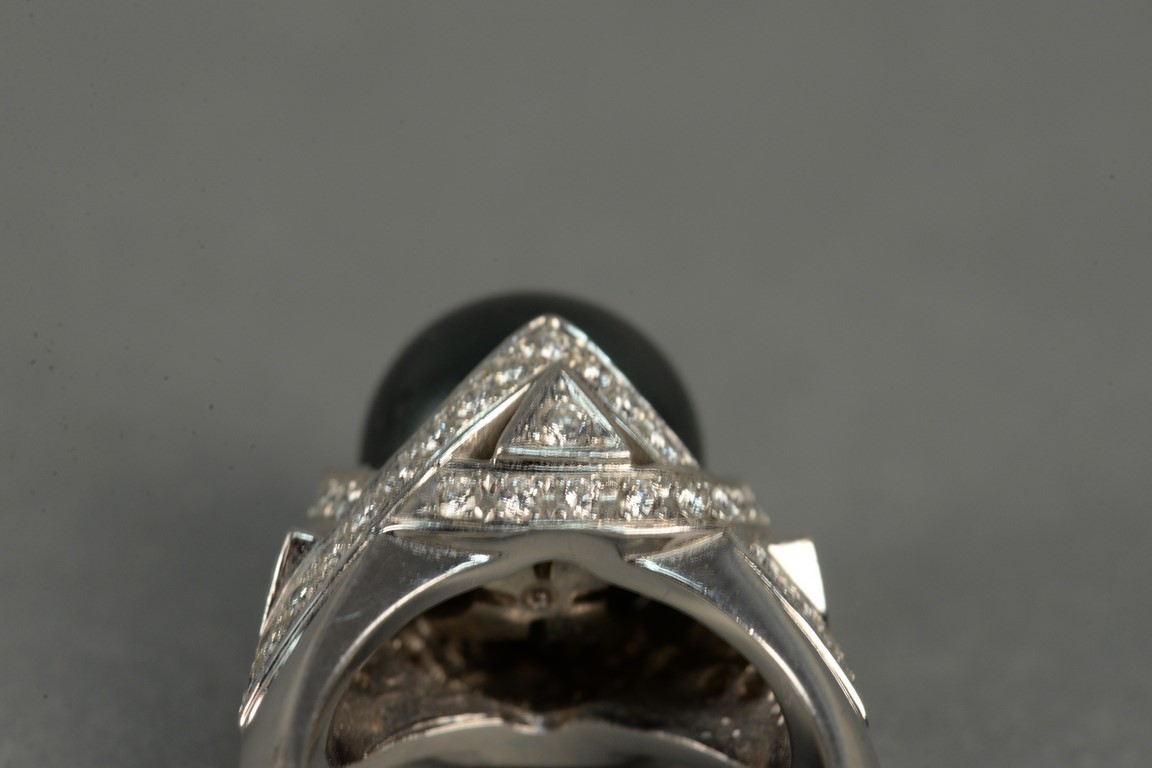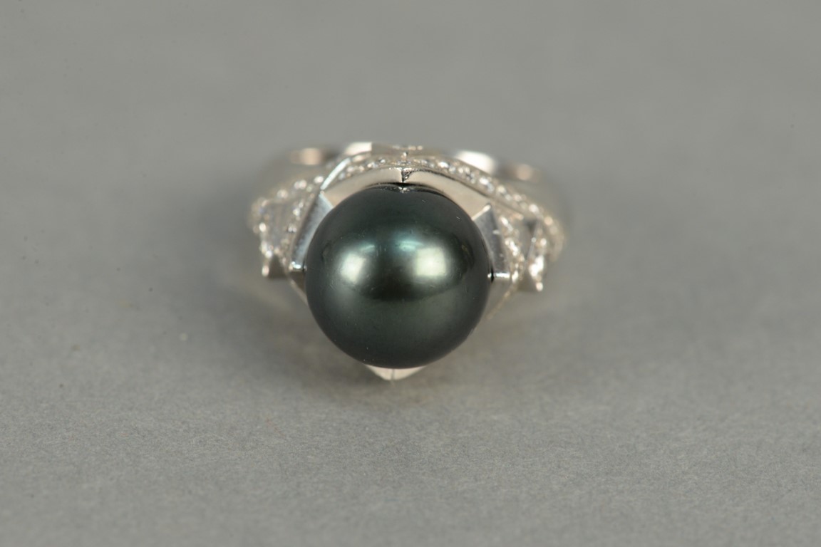 Lot 41: Mikimoto platinum ring set with large black pearl 12mm surrounded by diamonds. total weight 20.7 grams