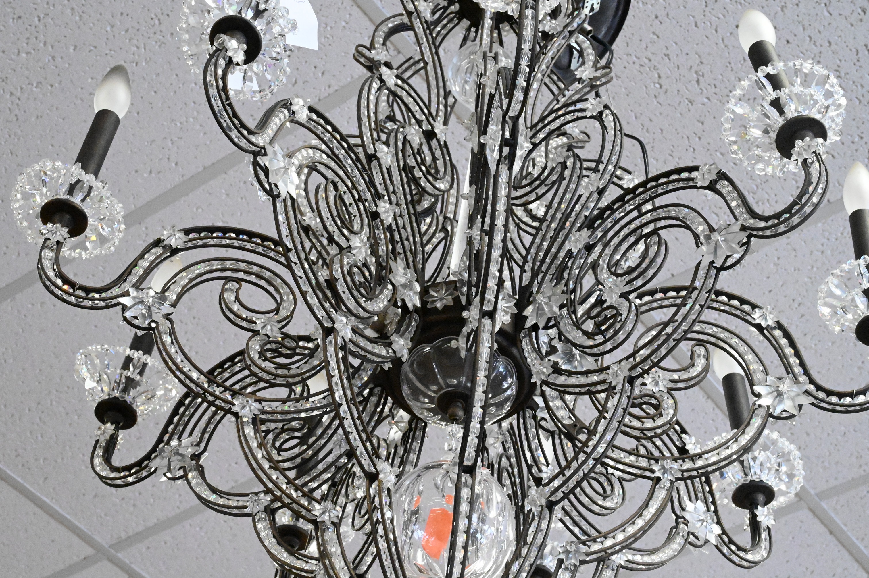 featuring black metal scrolling arms wired with clear Swarovski Elements crystal, hand blown hanging spheres and hand cut bohemian crystal