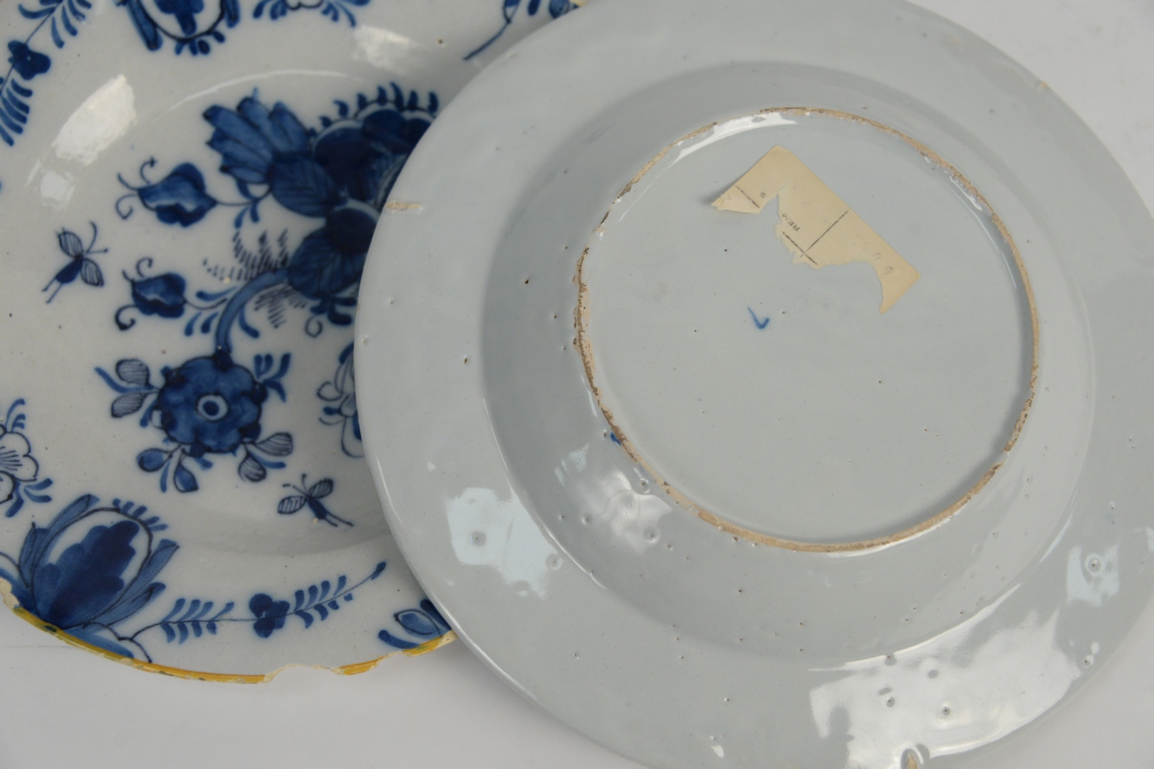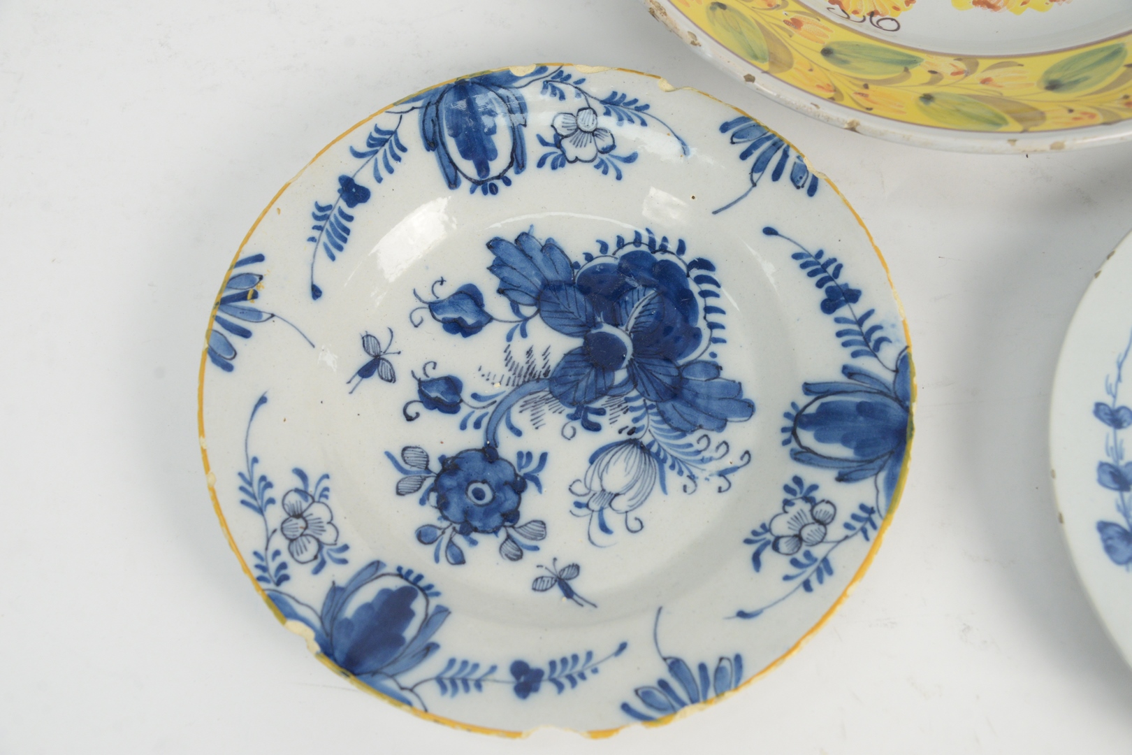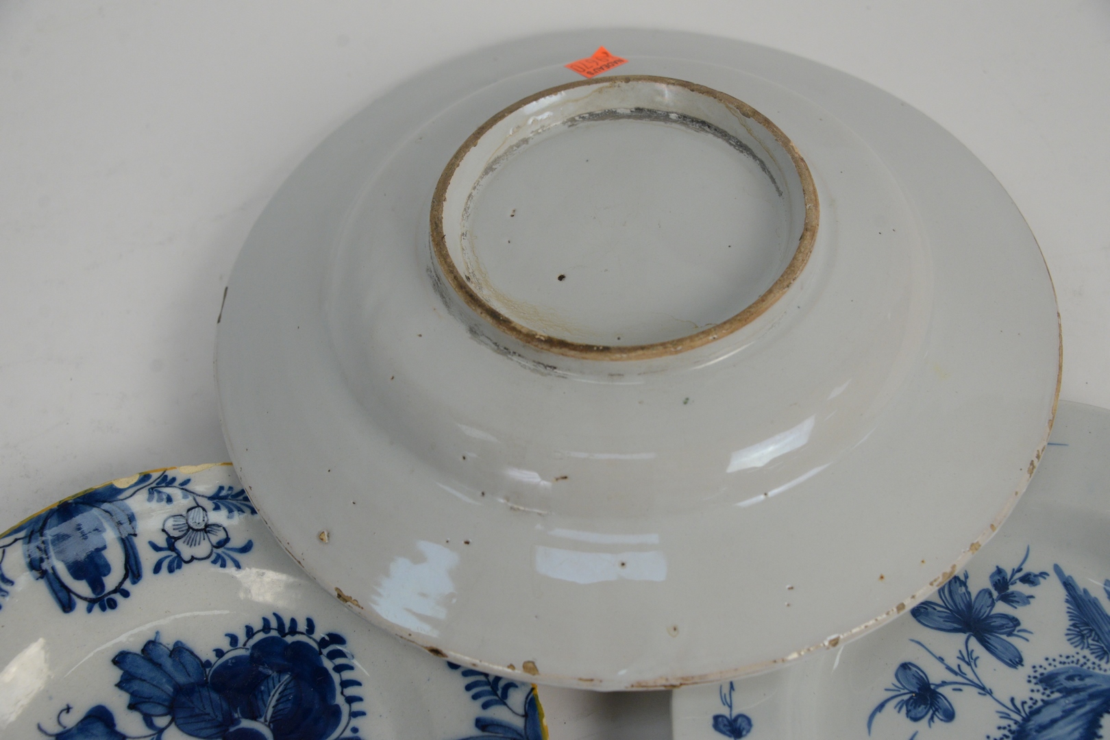 Lot 41: Three Delft Pieces to include a deep charger with 4 colors, along with two blue and white plates, diameters 9 1/4, 12, and 19 1/4 inches.