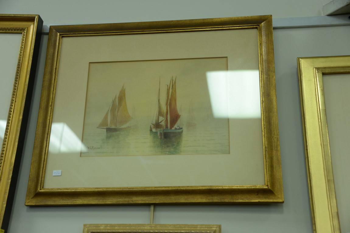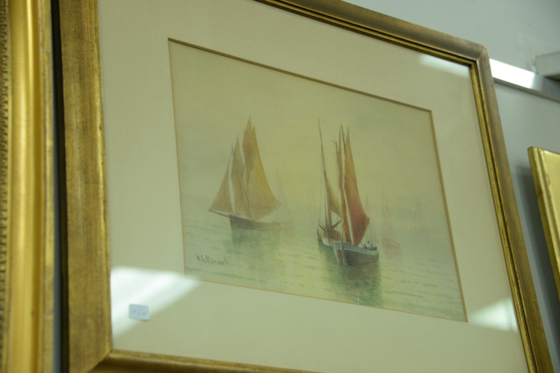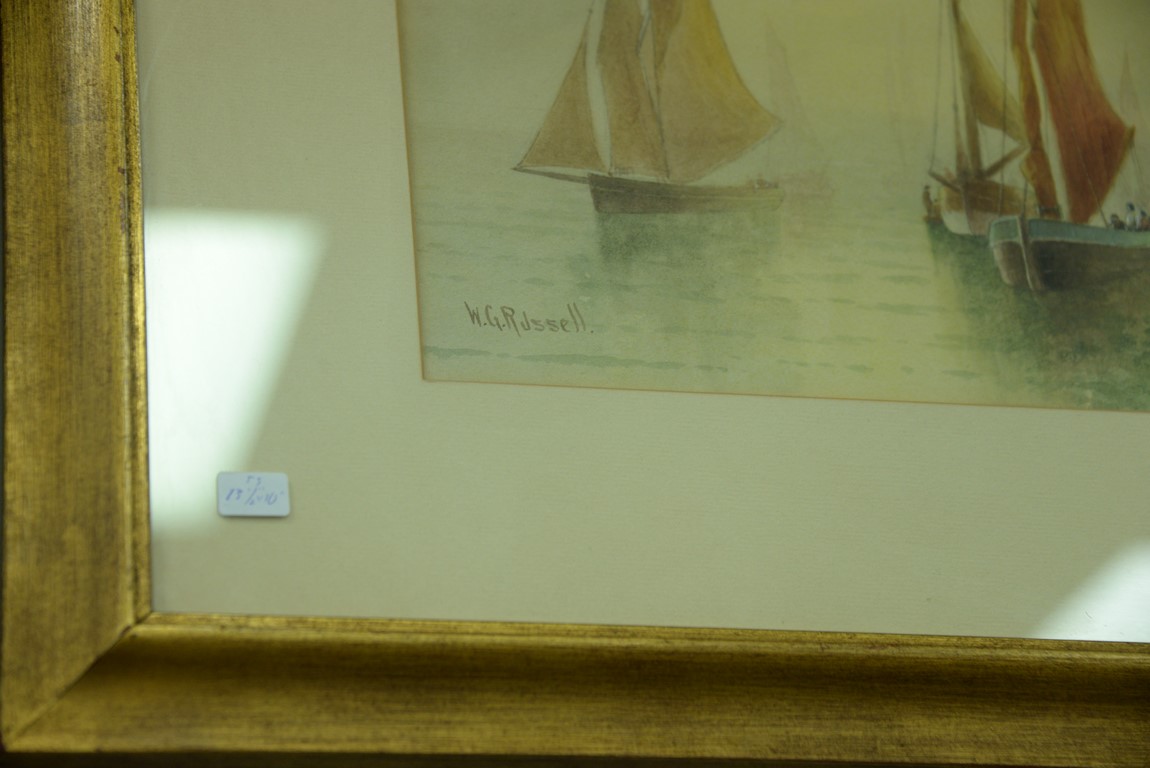 Three framed watercolors including a pair by Edward Van Goethem 1857-1924 Kids on the Beach along with a William George Russell b. 1860 watercolor of Misty Morning Sailing, signed W. G. Russell. 7 1/2 x 5 and 13 1/2 x 10.