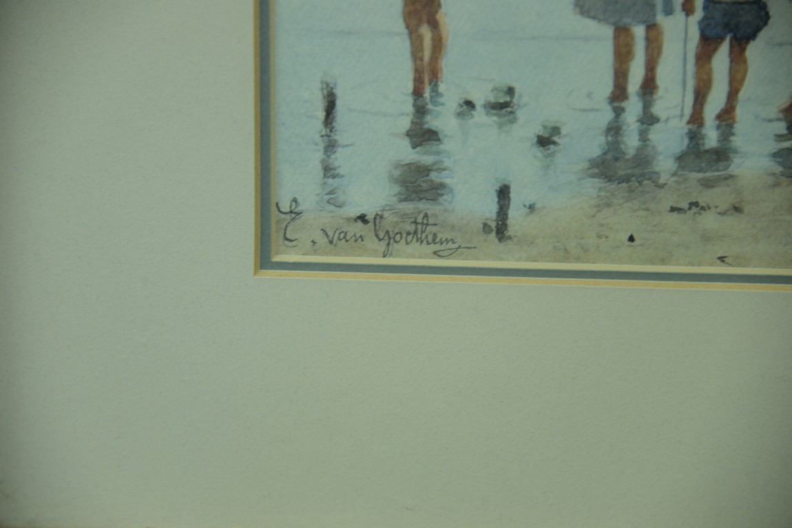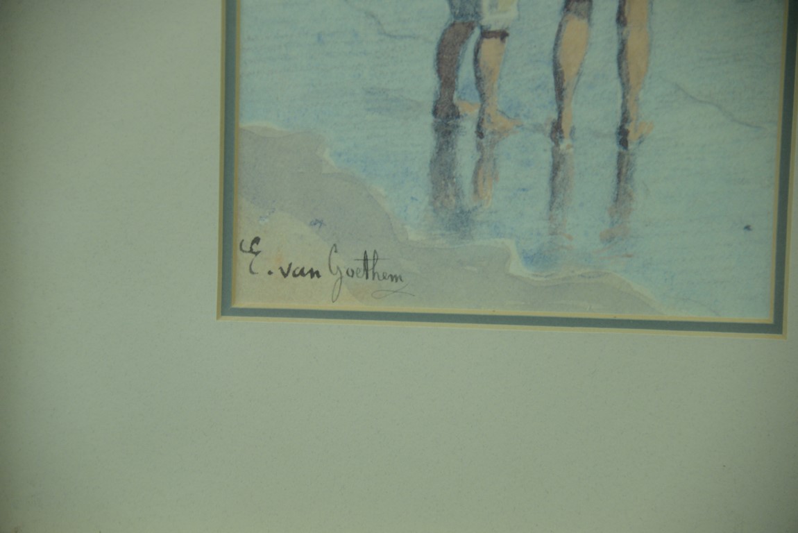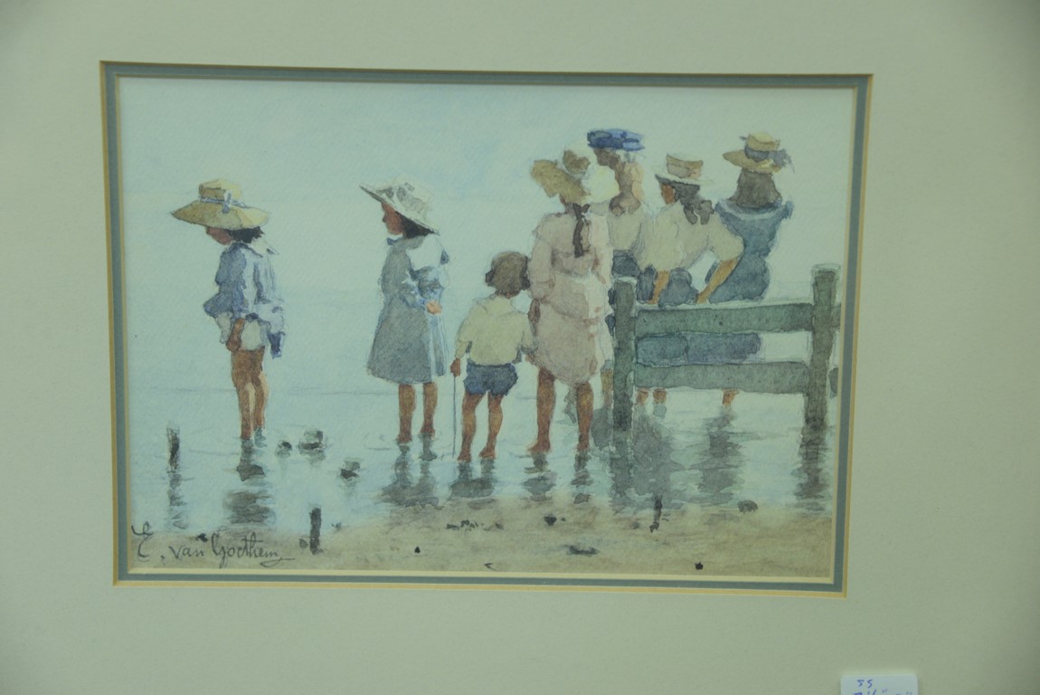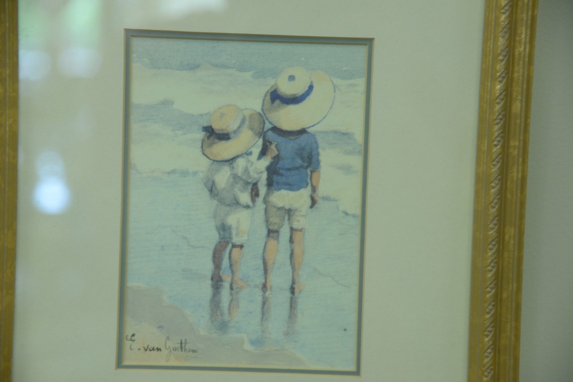 Lot 41: Three framed watercolors including a pair by Edward Van Goethem 1857-1924 Kids on the Beach along with a William George Russell b…