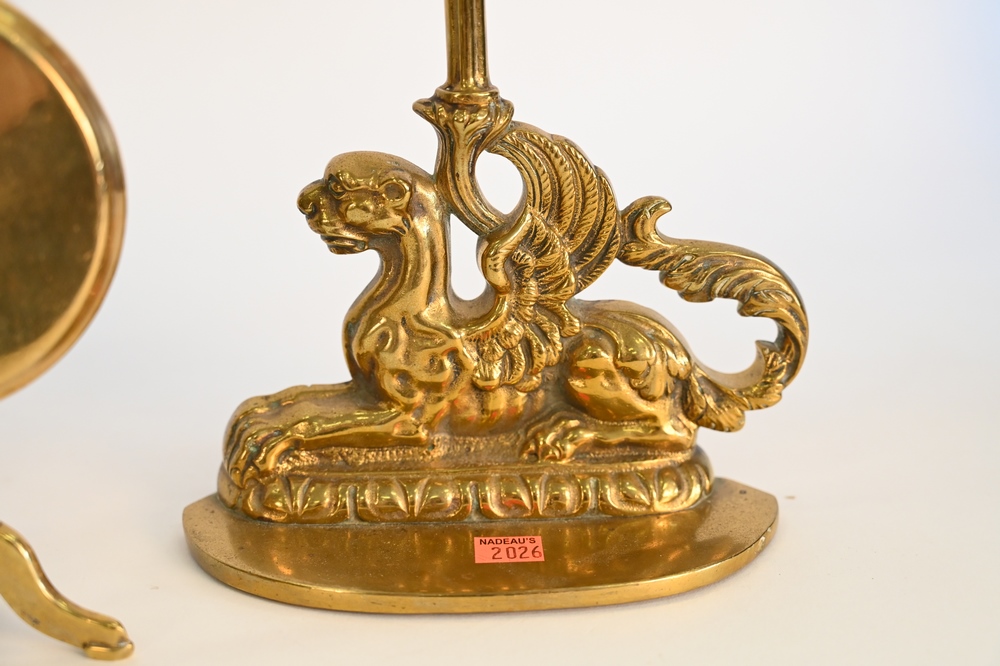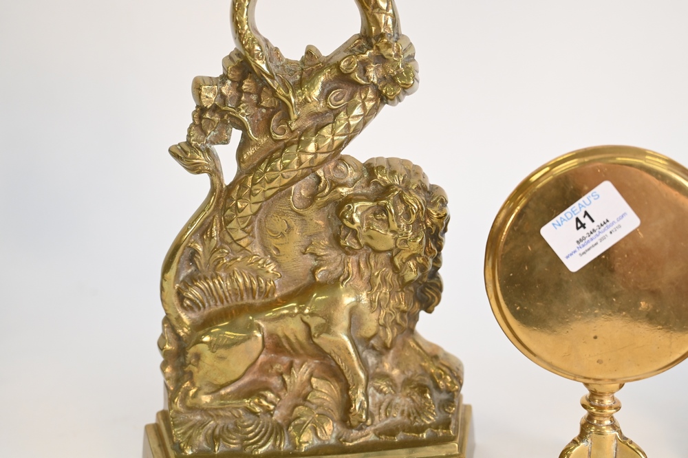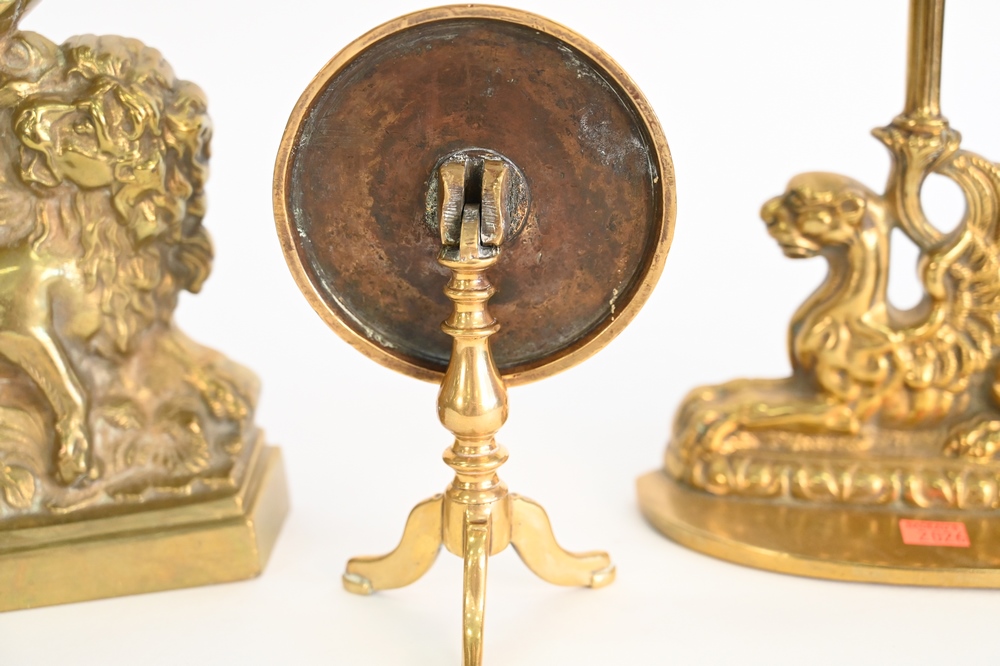Lot 41: Three Piece Brass Group, to include Queen Anne brass trivet with tilt top, lion with serpent door stop, and a winged griffin doorstop, height 14 inches.