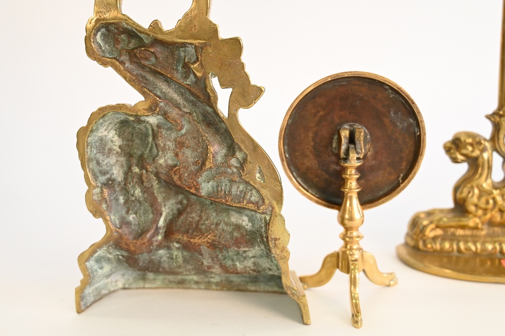Three Piece Brass Group, to include Queen Anne brass trivet with tilt top, lion with serpent door stop, and a winged griffin doorsto…