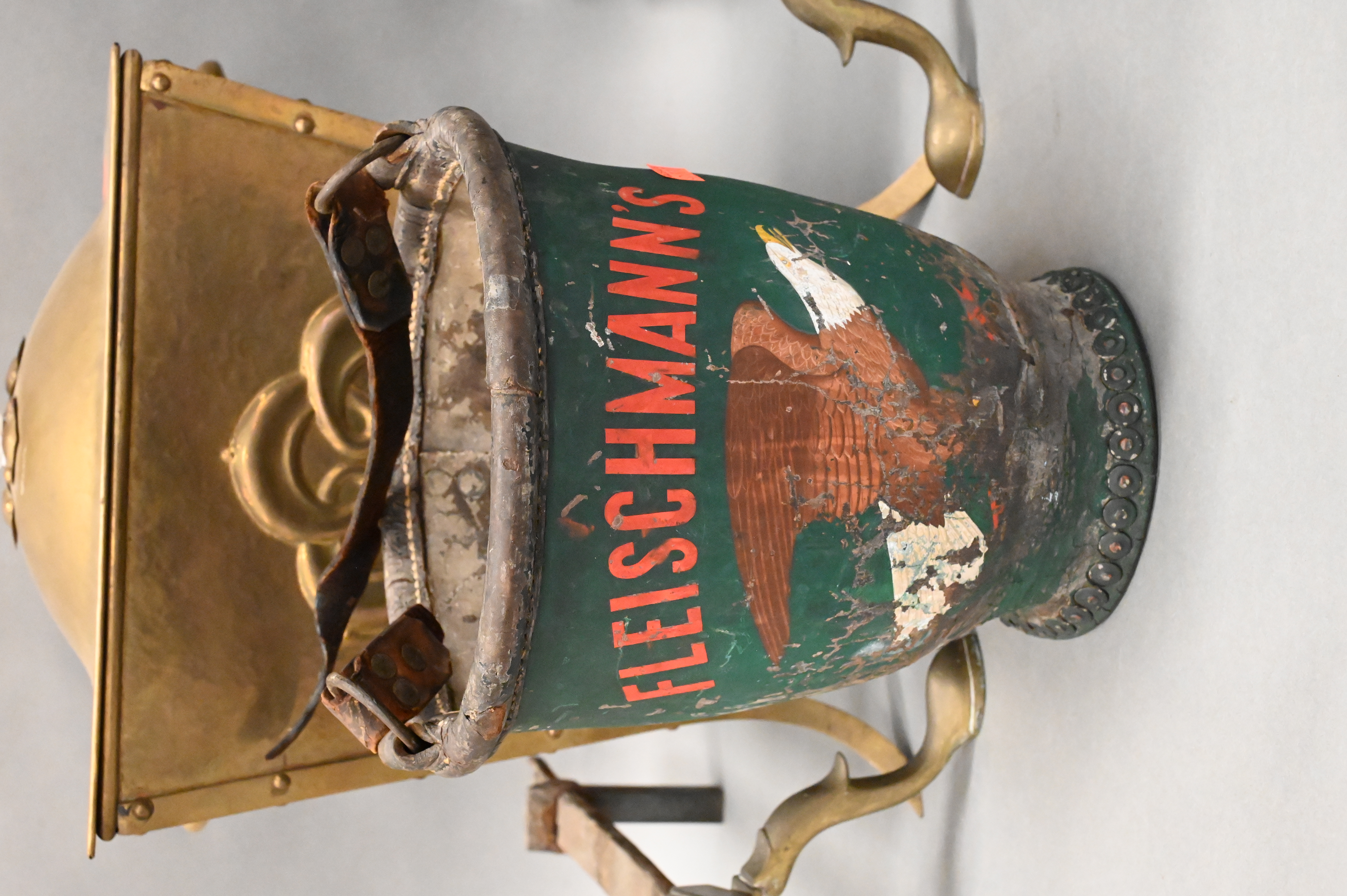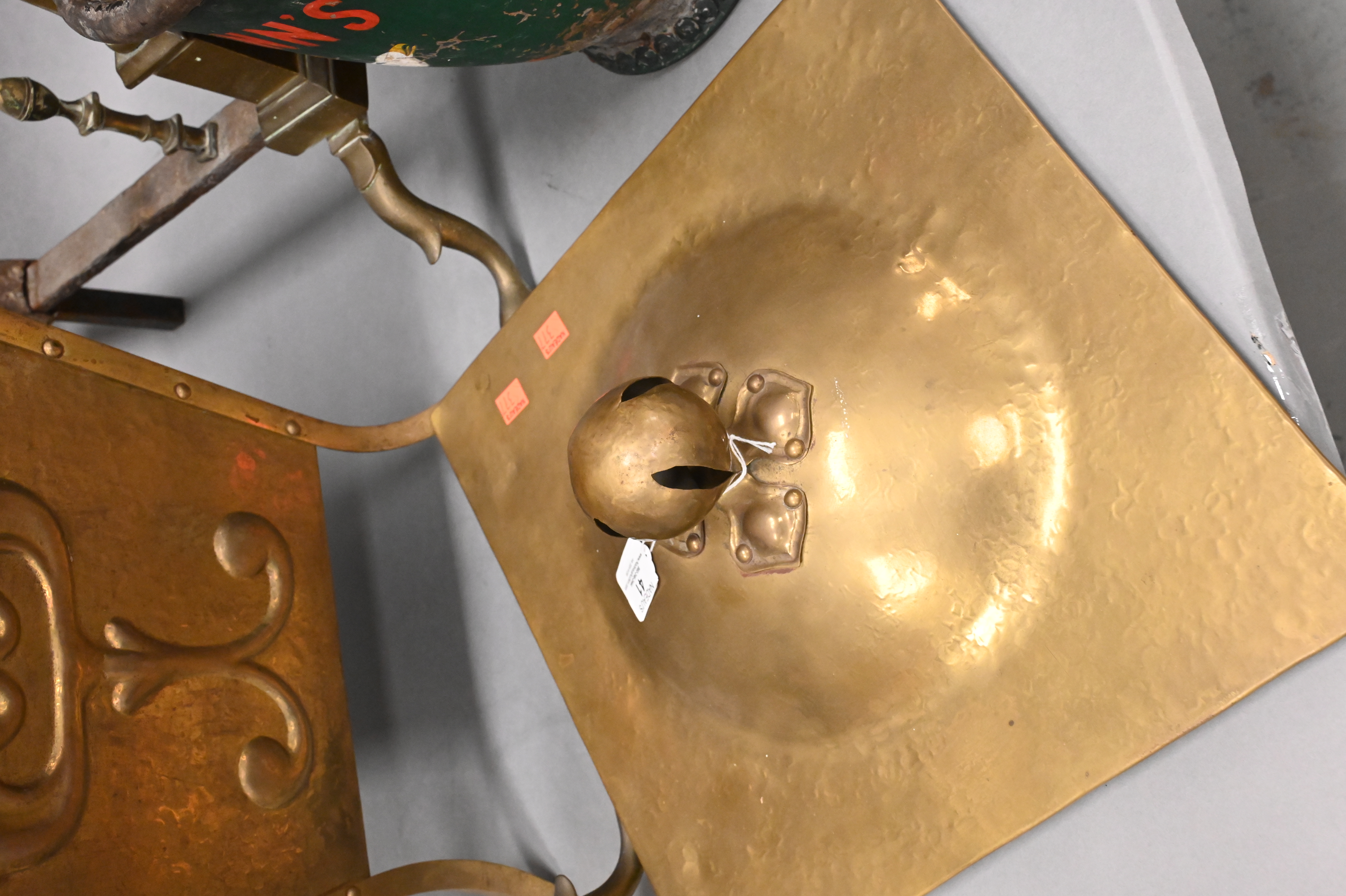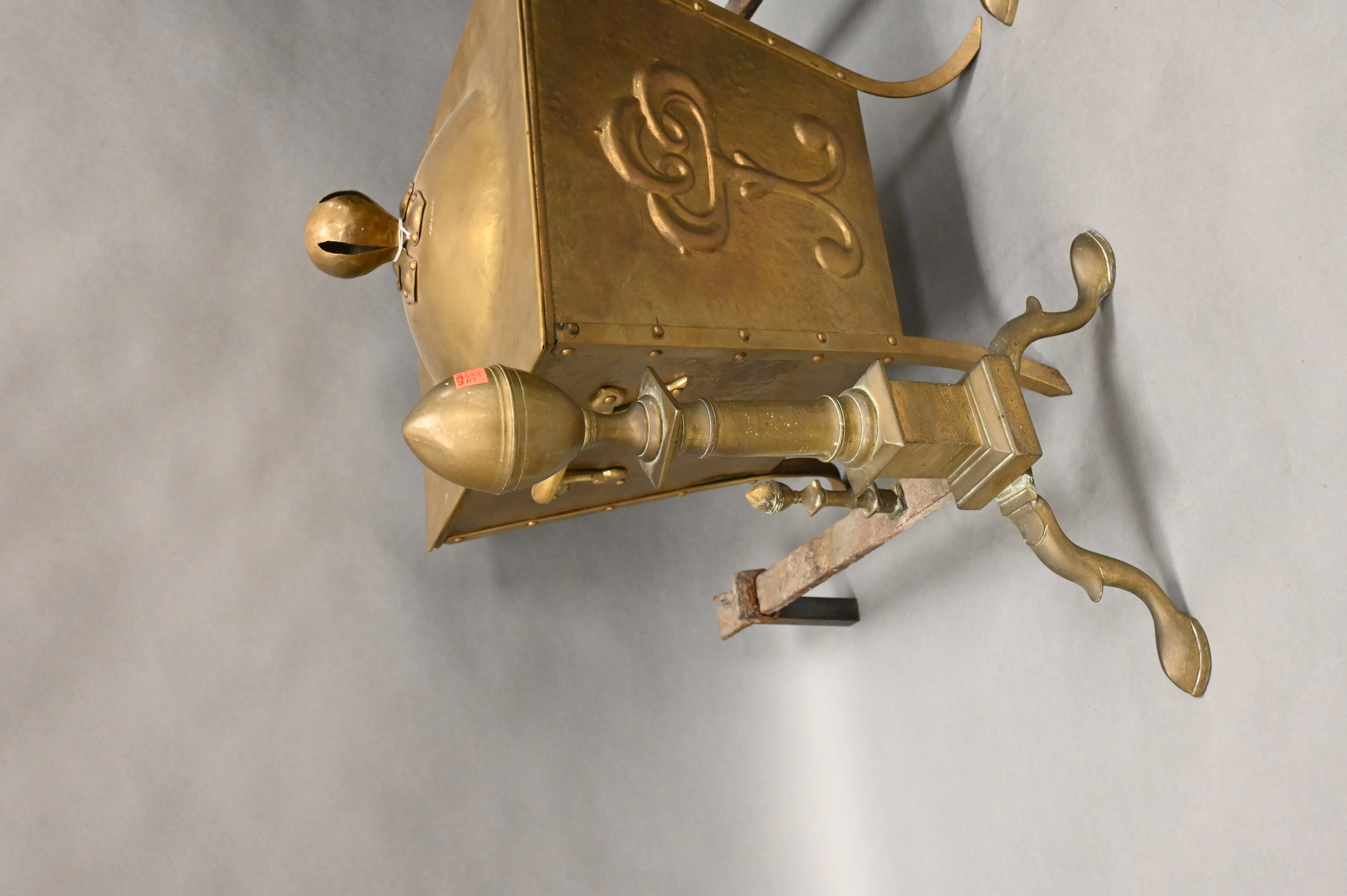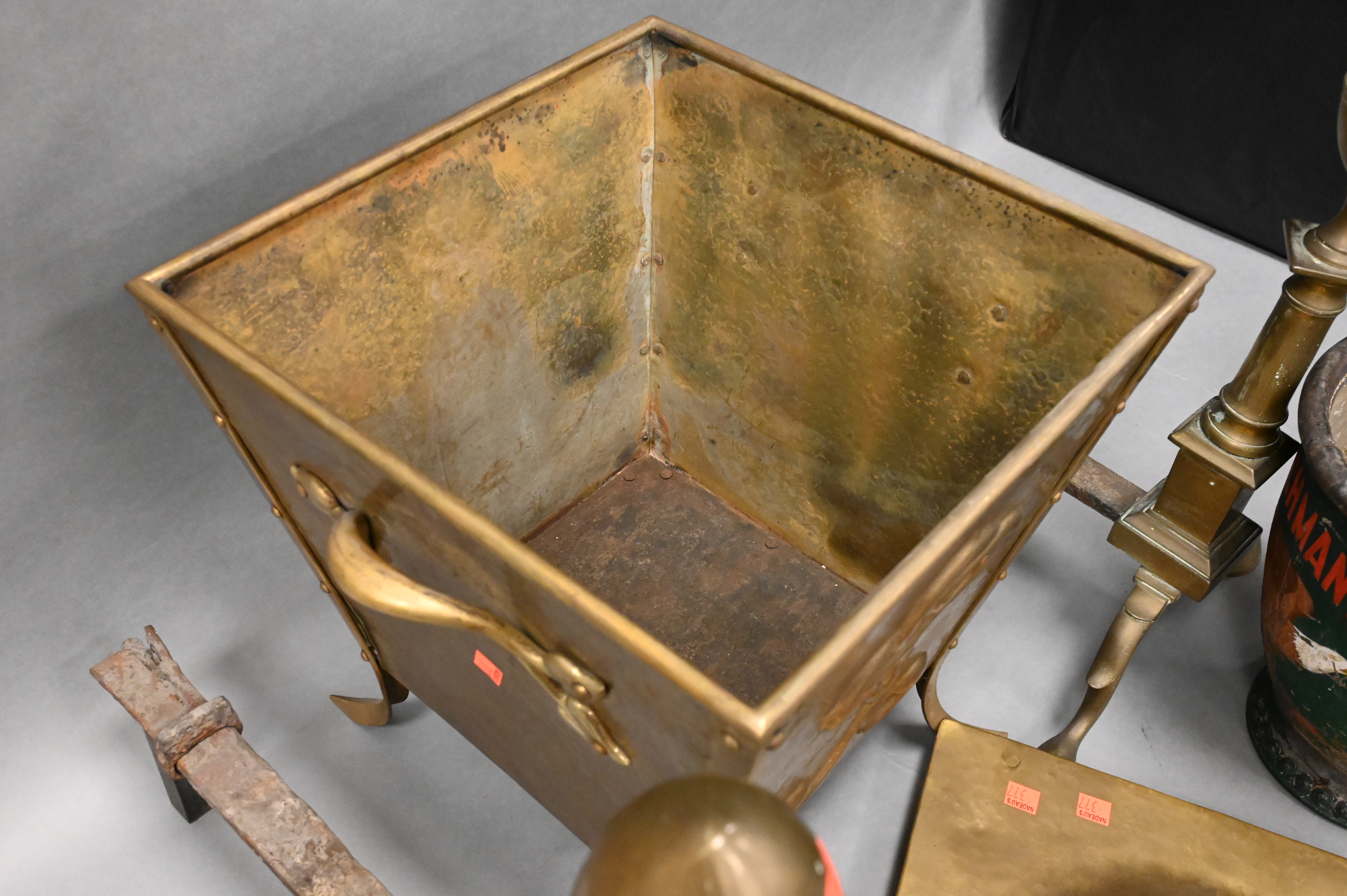 to include Federal brass lemon top andirons having log stops, brass arts and crafts lidded coal hod set on four legs, leather fire bucket having eagle marked Fleischman with broken handle